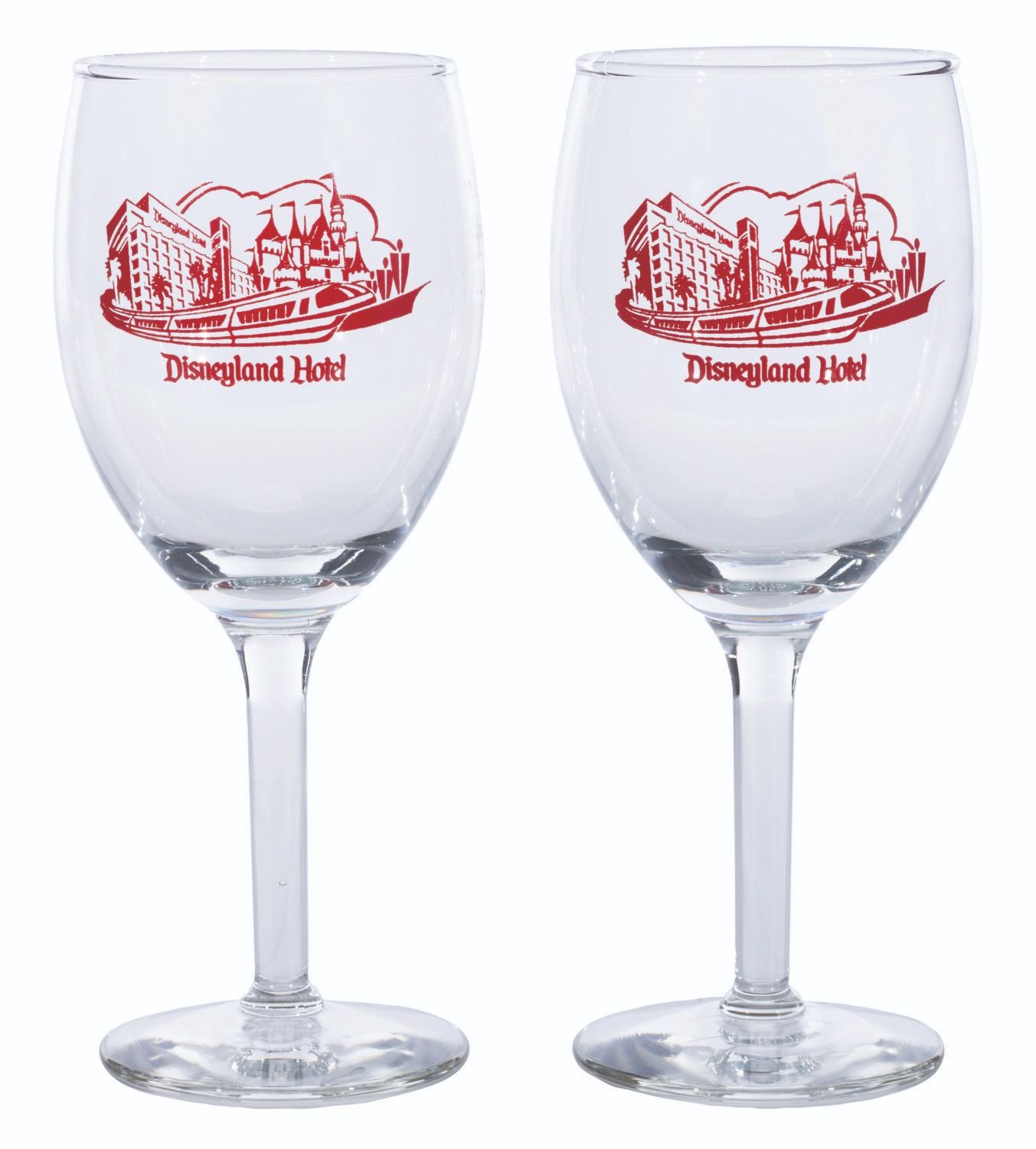 (Disneyland Hotel, 1980s) A pair of wine glasses featuring the monorail and a tower of the Disneyland Hotel. Measuring 7" tall and 2.75" in diameter, the glasses are in very good condition exhibiting light wear.