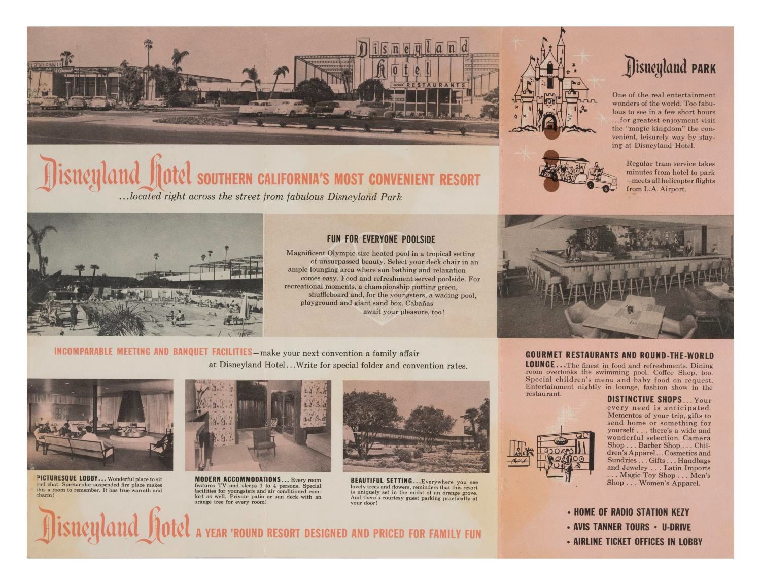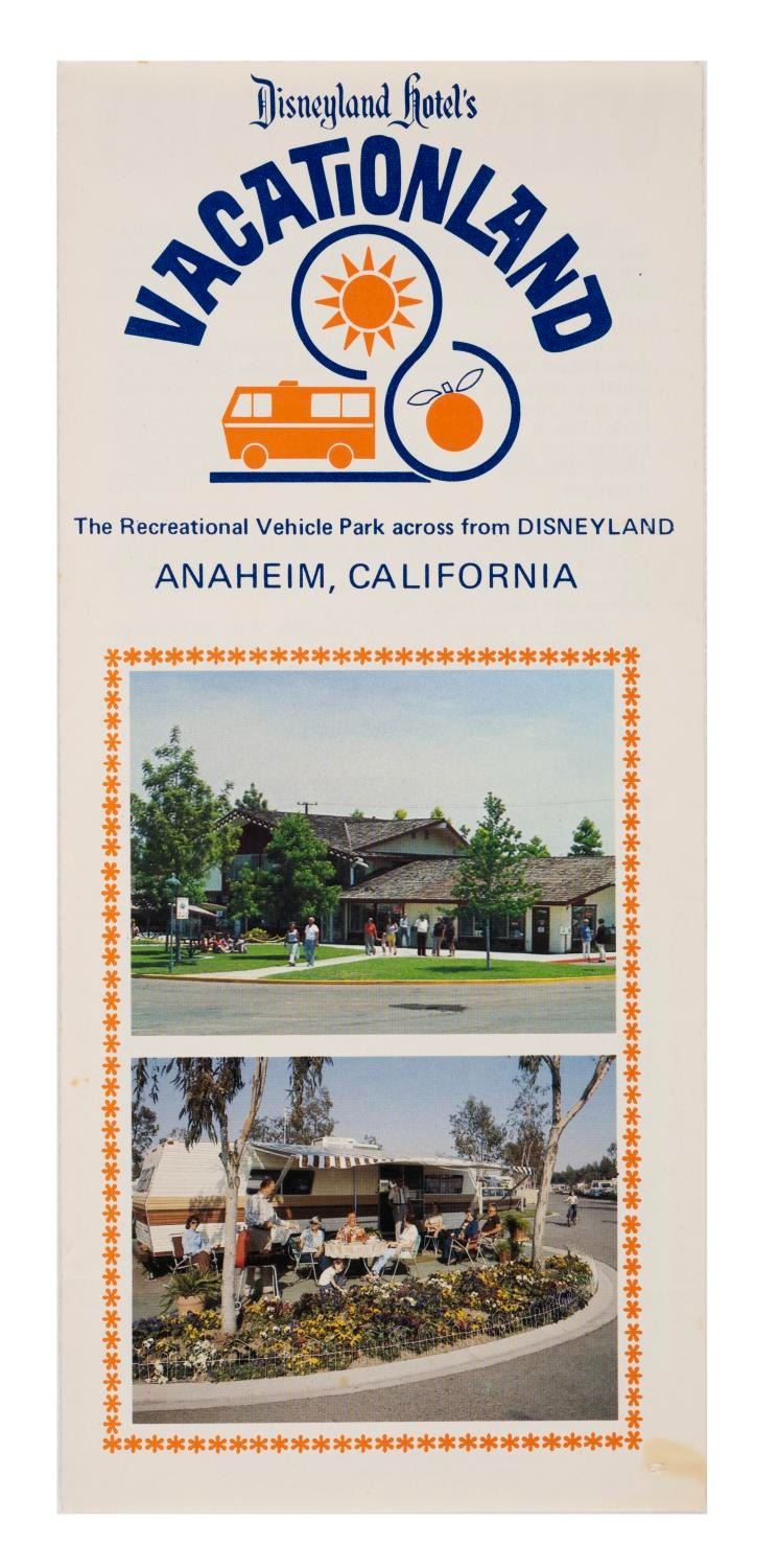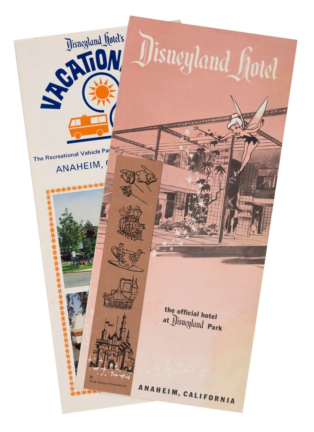 (Disneyland Hotel, 1955/1979) A pair of Disneyland Hotel & Vacationland brochures, each with illustrations and photos. Measuring 12"x9" when opened, each piece is in very good used condition, with spots of discoloration and wear.