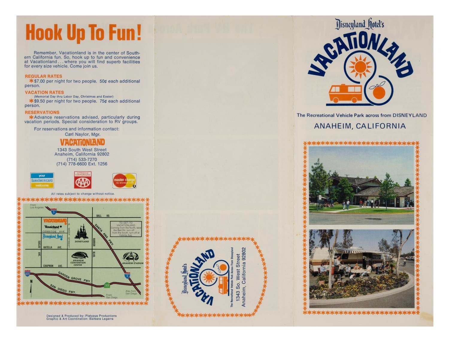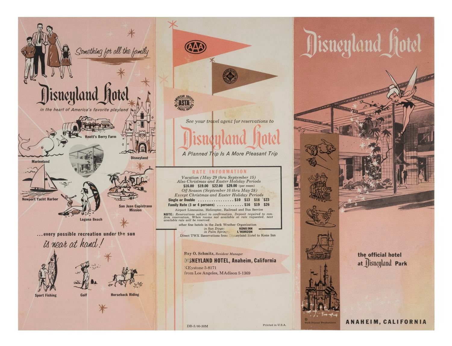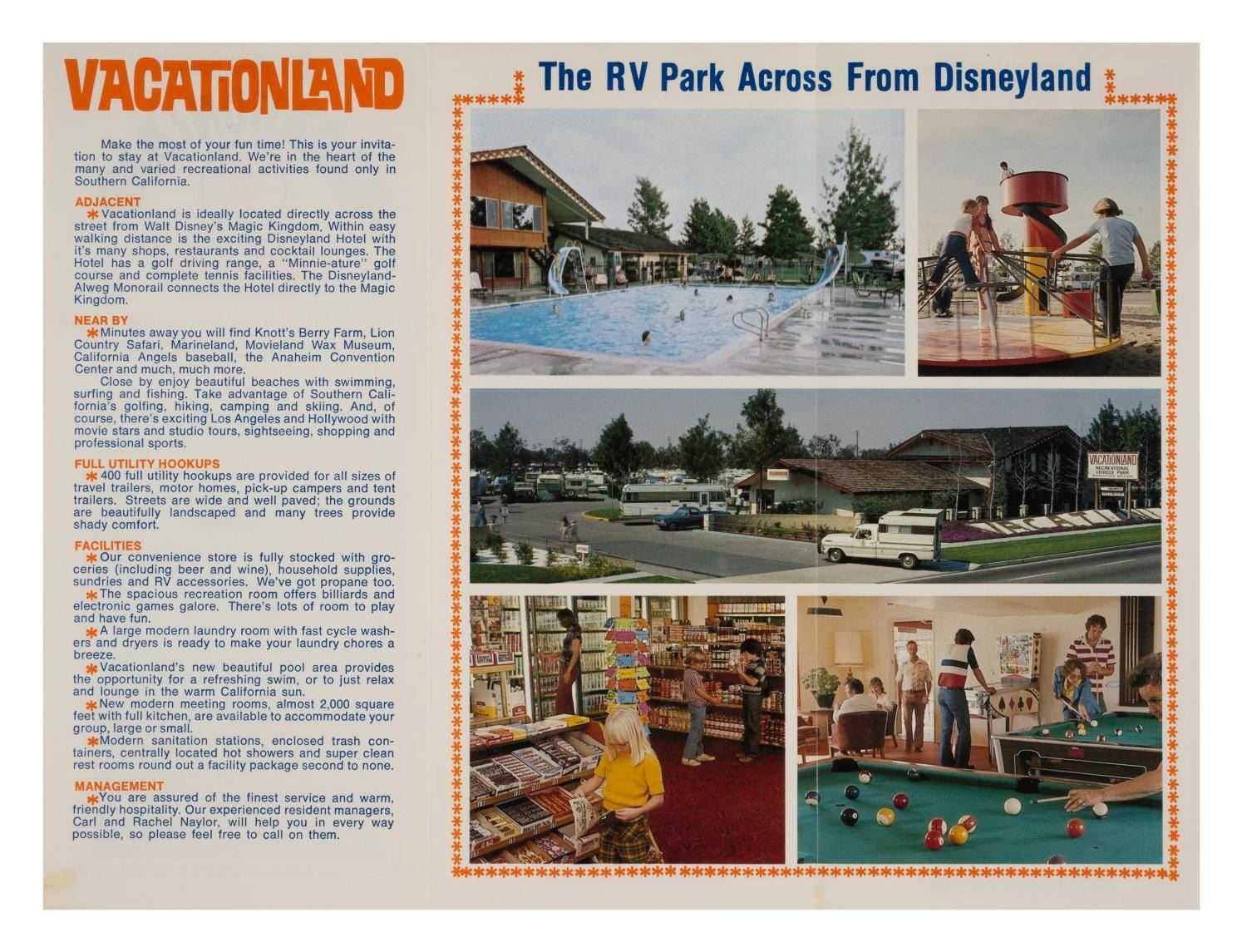 (Disneyland Hotel, 1955/1979) A pair of Disneyland Hotel & Vacationland brochures, each with illustrations and photos. Measuring 12"x9" when opened, each piece is in very good used condition, with spots of discoloration and wear.