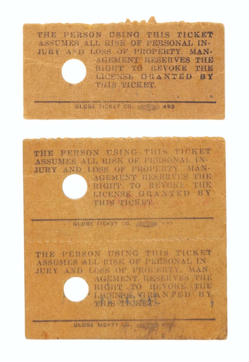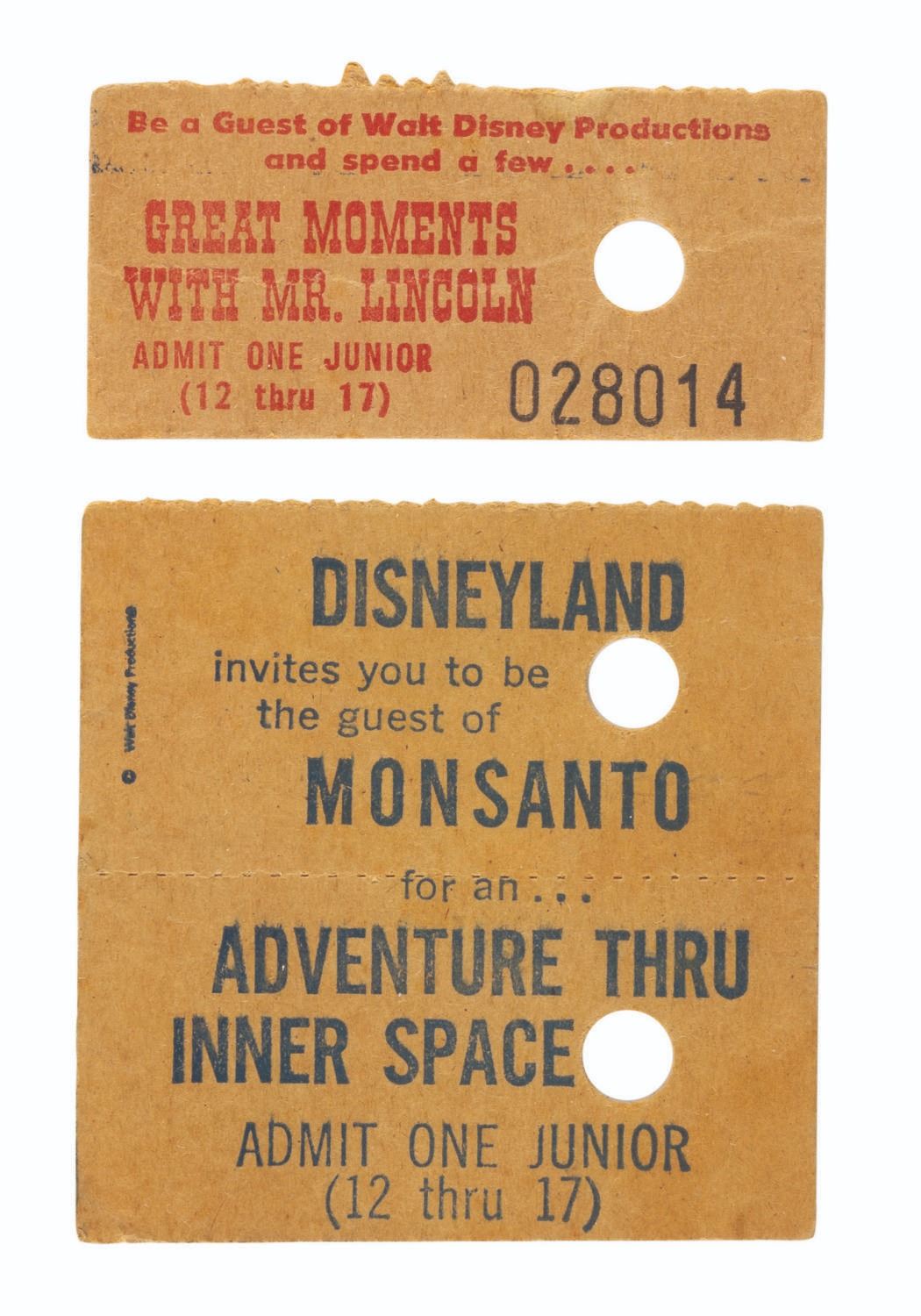 (Disneyland, 1960s-70s) A rare pair of Great Moments with Mr. Lincoln and Monsanto’s Adventure Thru Inner Space junior ticket stubs, covering Guests aged 12 to 17. The tickets bear hole punches from use at the Park. The Mr. Lincoln ticket measures 1” x 2 and the Monsanto ticket measures 2” x 2”, both in very good condition with light wear.