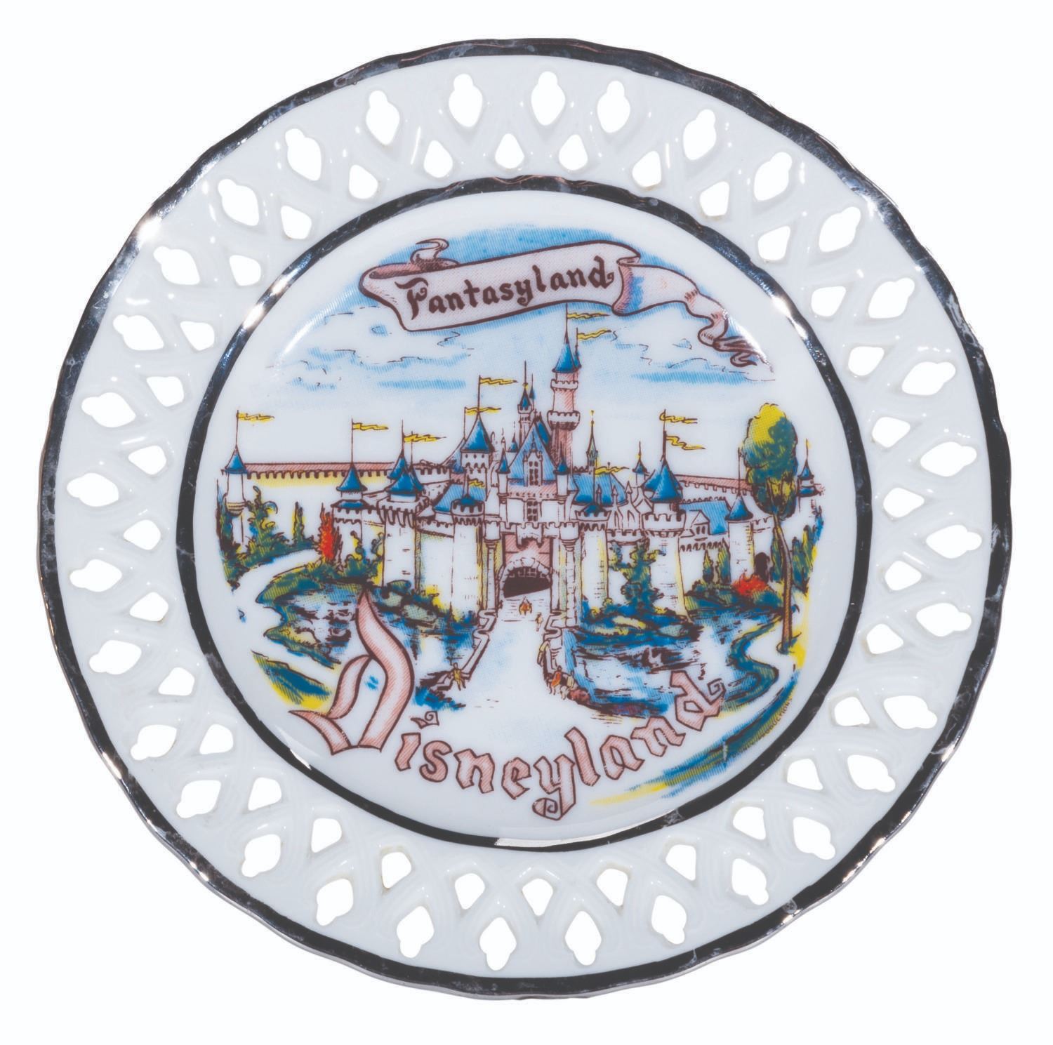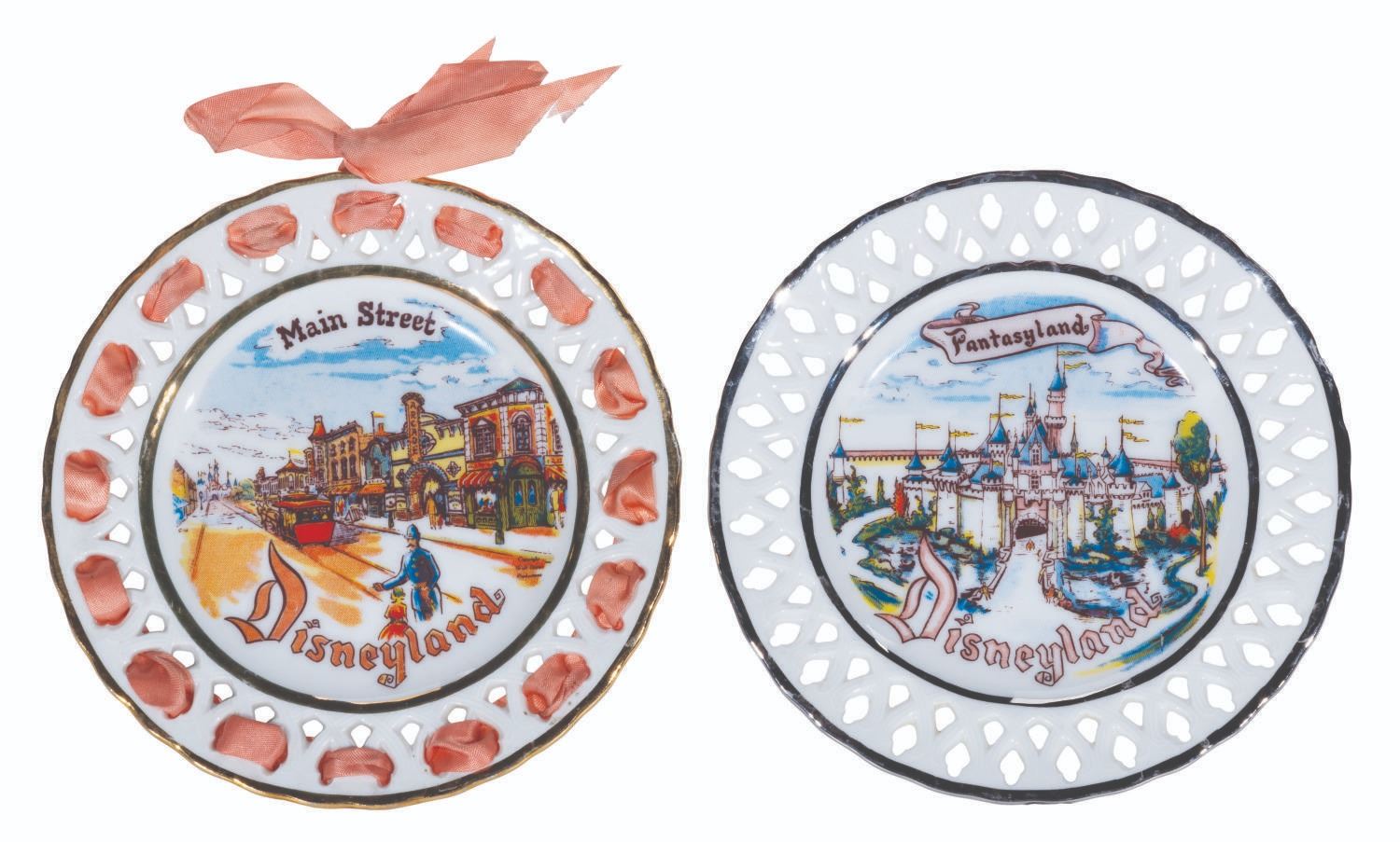 (Disneyland, 1955) A pair of souvenir lace plates featuring Disneyland's Fantasyland and Main Street, U.S.A., by Eleanore Welborn Art Productions. Hand-selected by Walt Disney as the first official ceramic supplier to the Park before its opening, many of Welborn's designs were based on original concept art for attractions that were still under development and construction. Measuring 6.25" in diameter, the plates display in very good condition with scratches, wear, and one plate retaining an original Emporium label on the reverse.