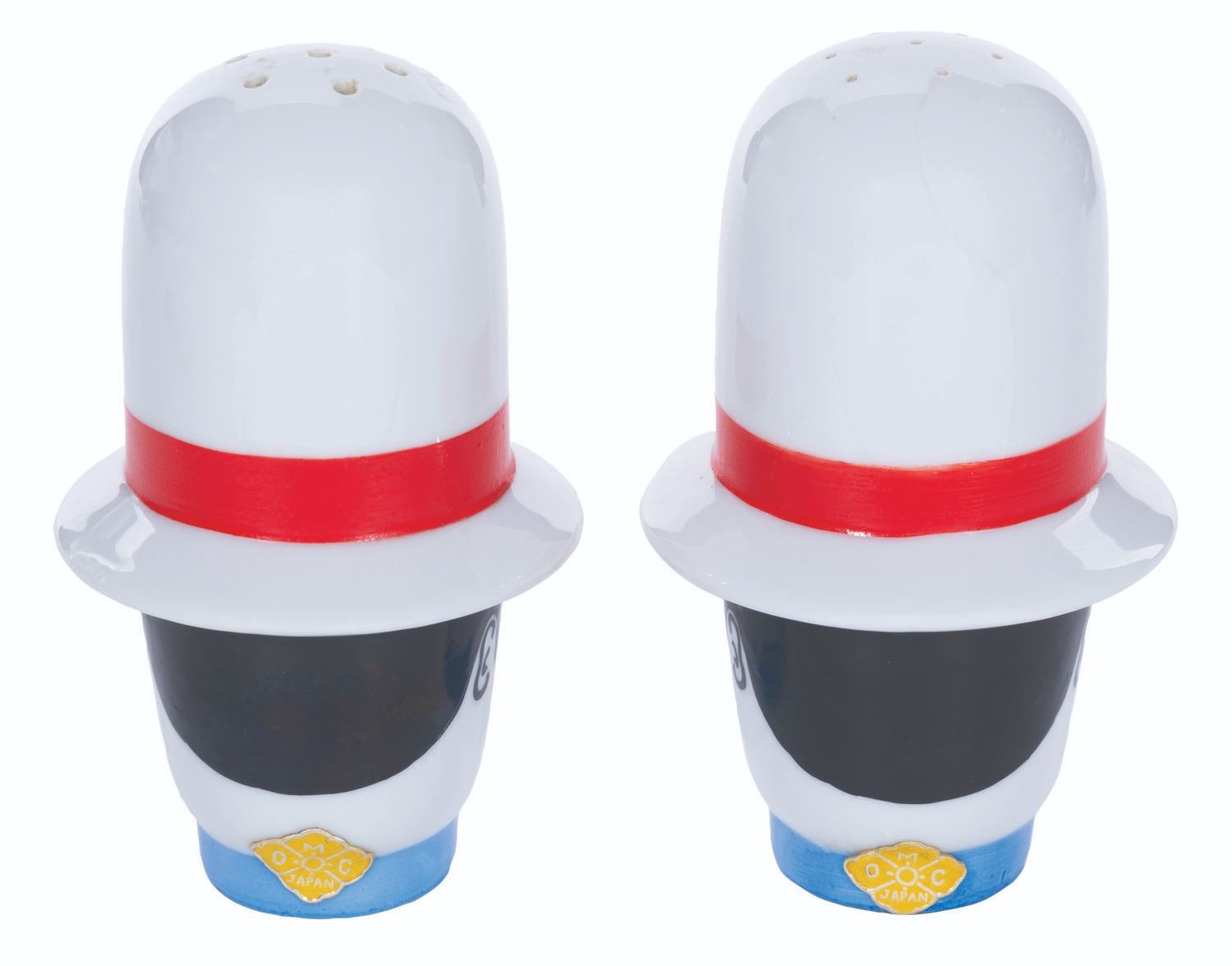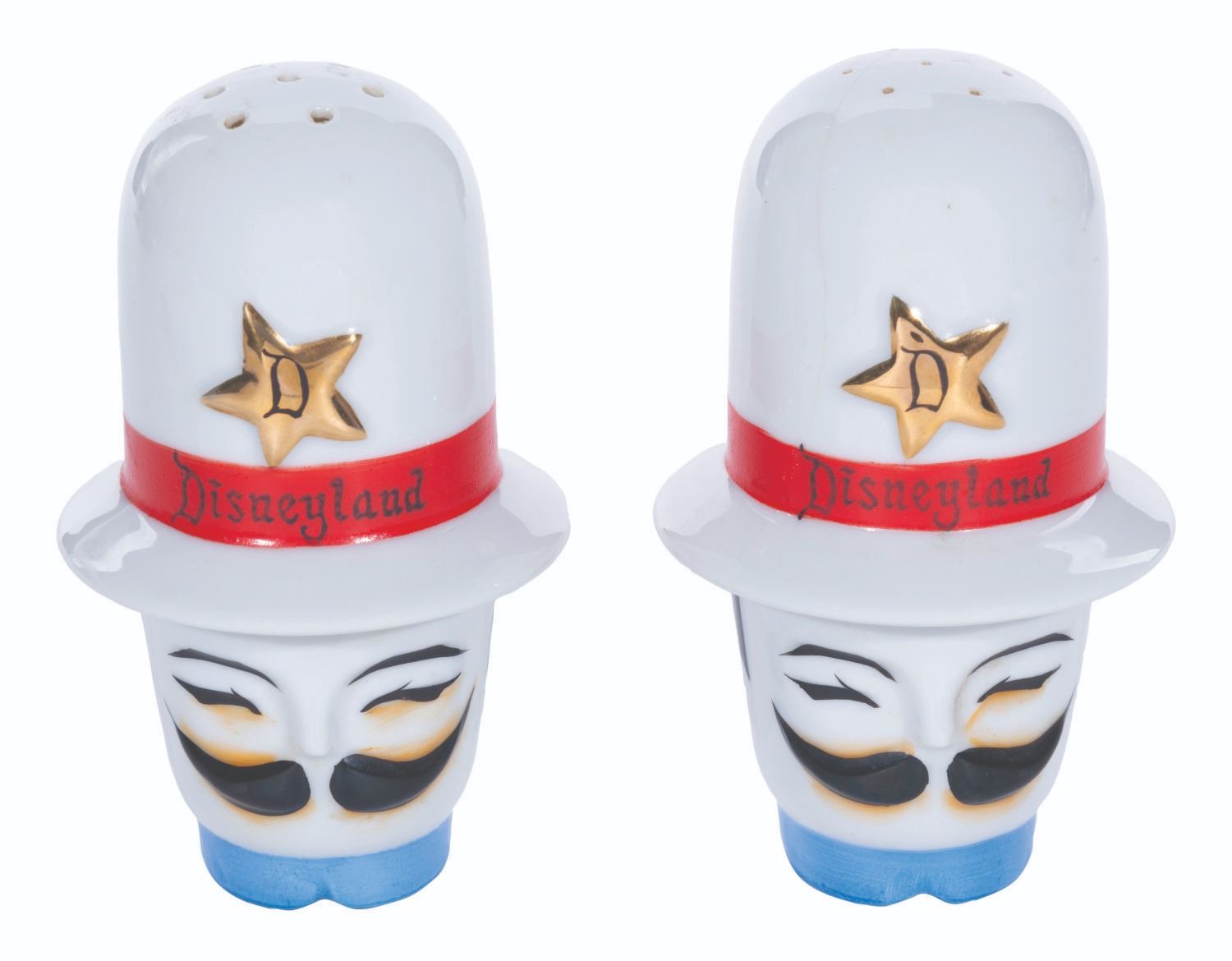 (Disneyland, 1960s) A pair of Constable salt and pepper shakers from Main Street at Disneyland. Each shaker is hand-painted with gold-finish accents and retaining their original foil manufacturer labels. Measuring 4.25" tall and 3" in diameter, each vintage piece is in good condition with a hairline crack in the cap of one.