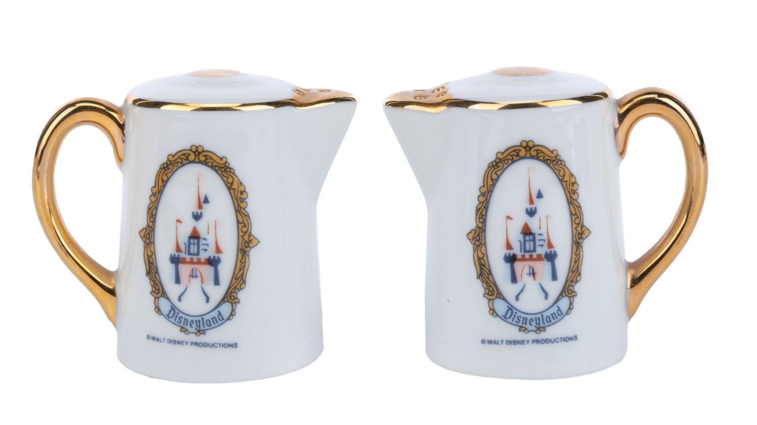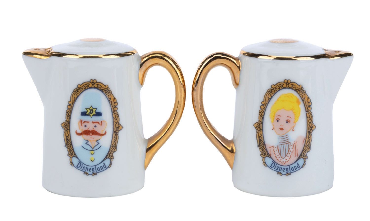 (Disneyland, 1950s) A Pair of Disneyland Main Street Salt & Pepper Shakers. Each pitcher-shaped ceramic shaker features printed imagery of Victorian-era Main Street characters (a policeman and a lady) in cameos, with gold edging and accents. Measuring 2" tall and 2.5", the pieces are in very good condition with the slightest wear to gold top accent from age or handling.