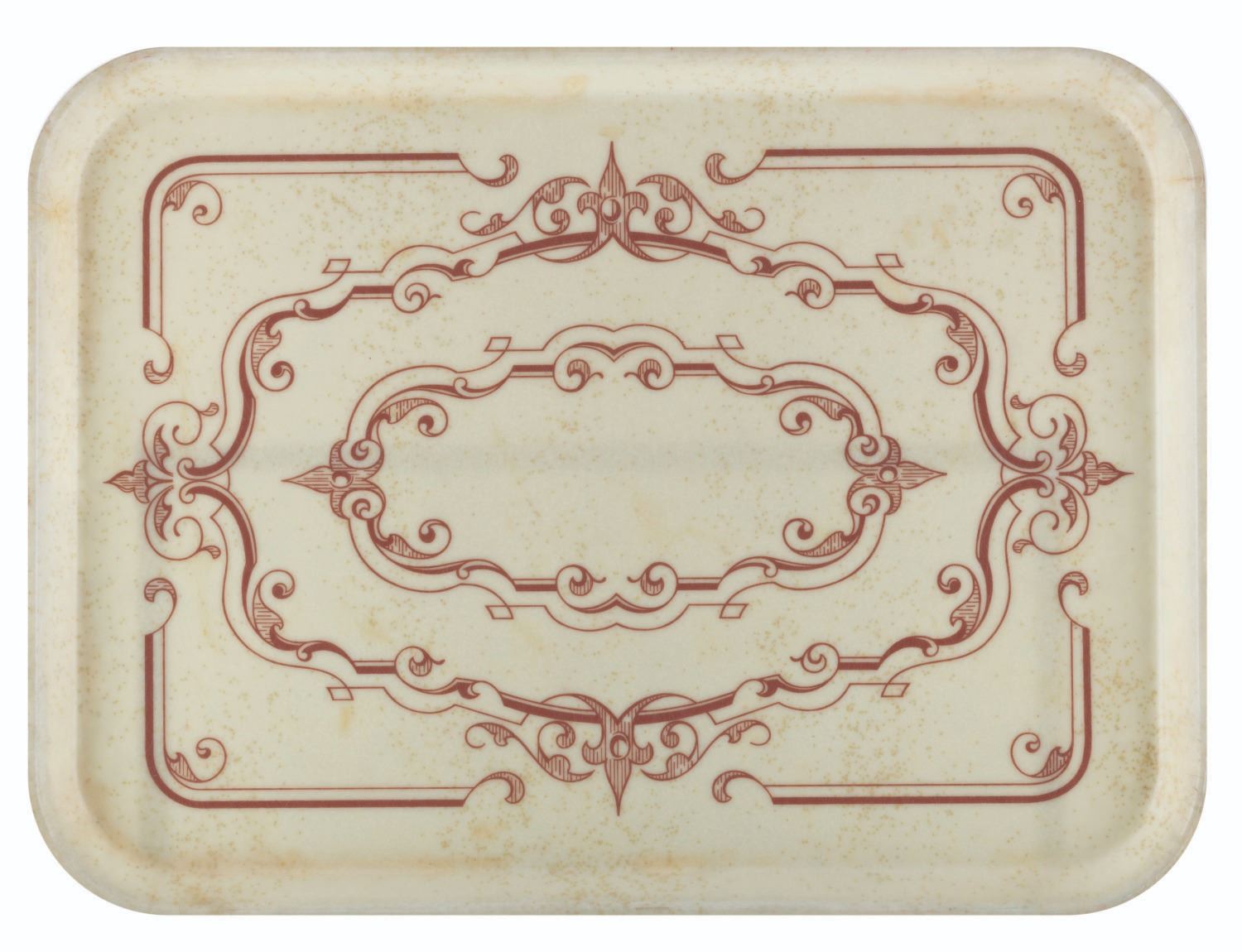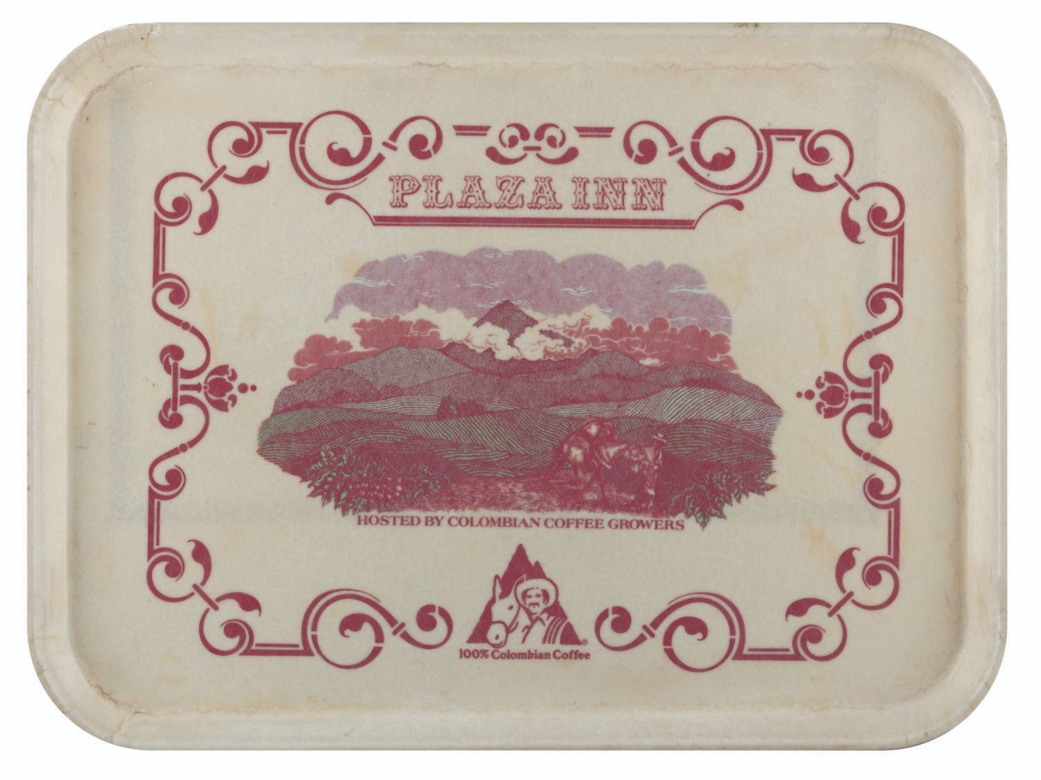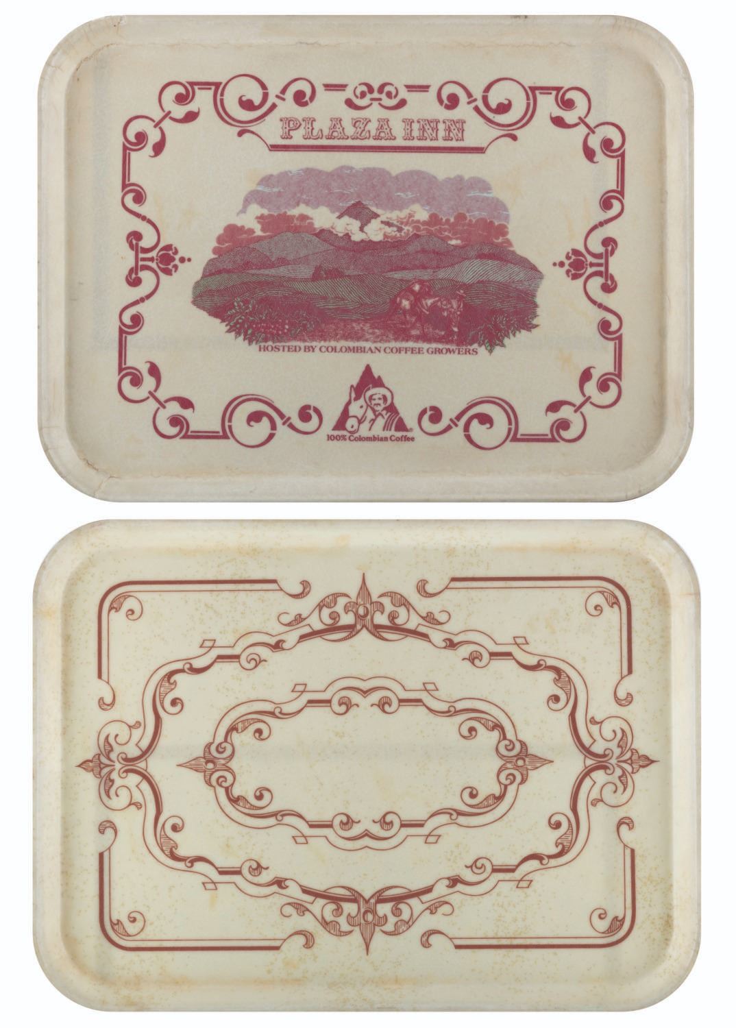 (Disneyland, 1987) A pair of trays from the Plaza Inn on Main Street, U.S.A. One tray has “Plaza Inn” and the Juan Valdez and mule logo from Colombian Coffee Growers, the restaurant’s sponsor, while the other tray features an ornate filigree design that matches the restaurant’s theming. Measuring 15” x 20.25”, the fiberglass trays are in very good condition with light scuffs and surface loss.