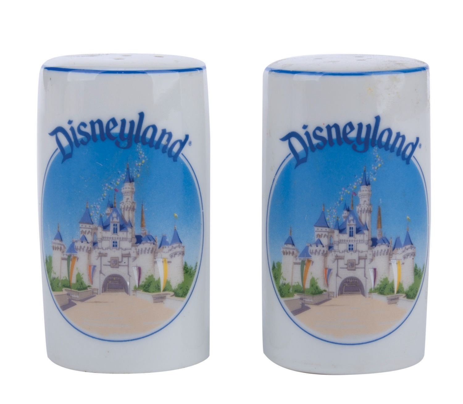 (Disneyland, 1980s) A pair of Disneyland souvenir salt & pepper shaker. The pair of vintage 1980s ceramic shakers feature printed imagery of Sleeping Beauty Castle at Disneyland. Measuring 2.75" tall and 1.25" in diameter, the pair are in very good condition with only light wear.