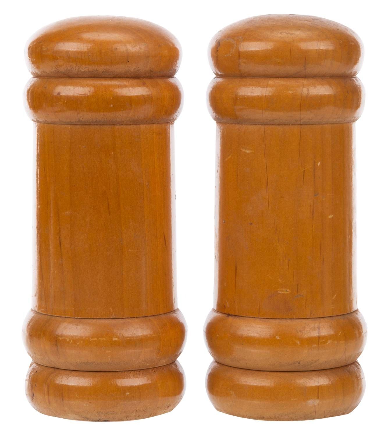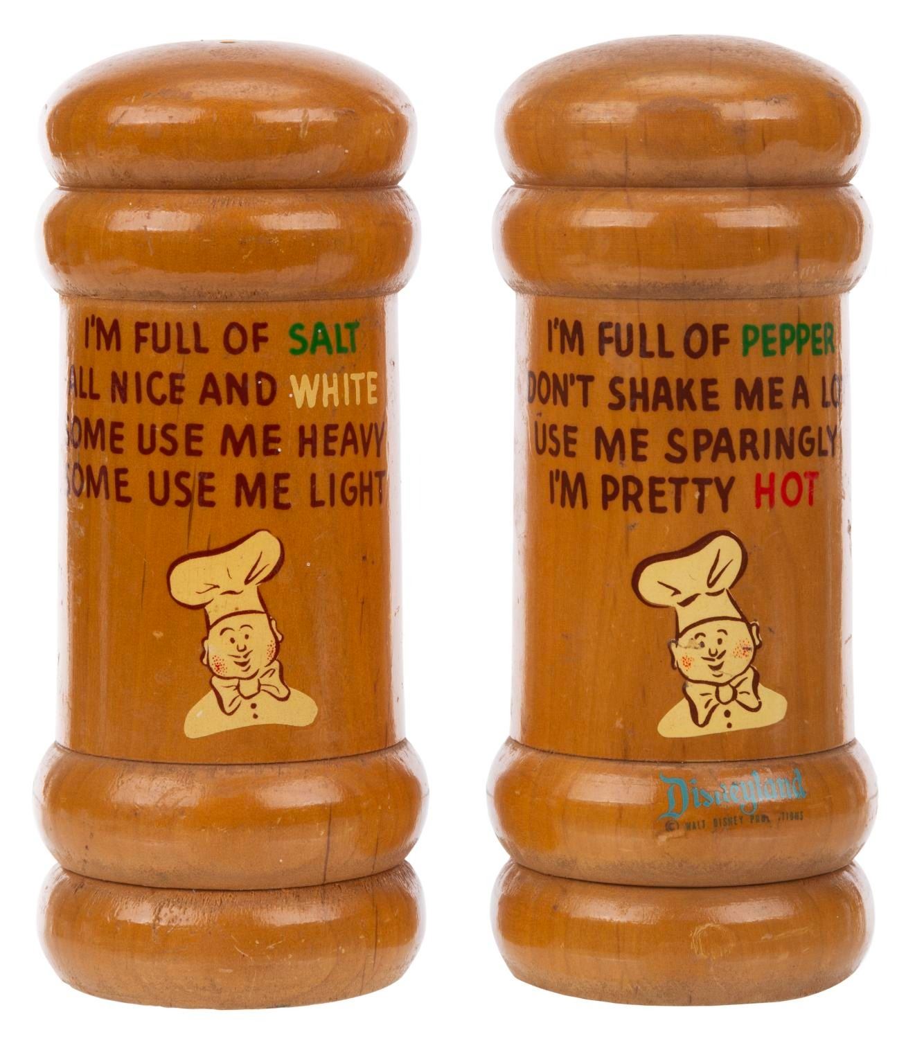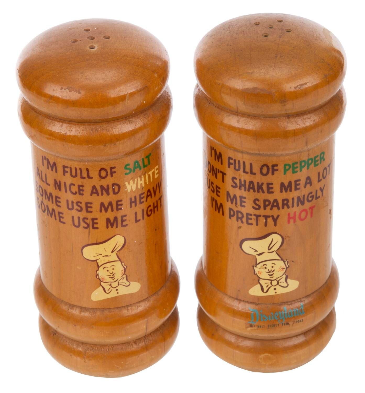 (Disneyland, 1950s-70s) A rare pair of salt and pepper shakers featuring a chef and prose, one of which still bears its Disneyland identification. Measuring 6.5 " tall and 2.75 " in diameter, the shakers are in good condition with paint loss, scuffs, scratches, and wear.