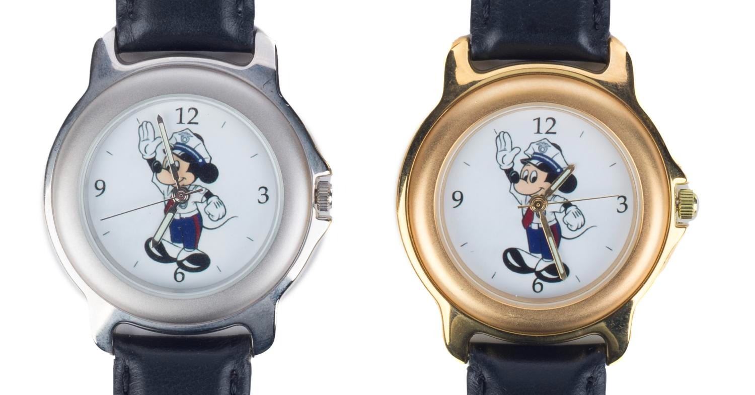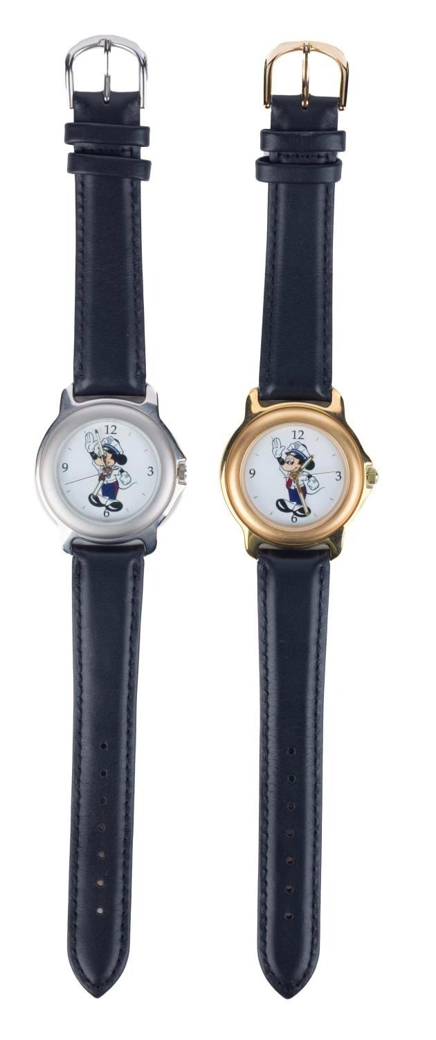 (Disneyland, 2000s) A pair of limited-edition watches created exclusively for Disneyland Resort Security Hosts and Hostesses. The lot includes gold and silver toned variants of the watch, with Mickey Mouse Security Division logo on the face, and a black leather band. Each timepiece was exclusively distributed through the Team Center in an edition of 250. The watches have a 9.5” band and are in fine condition.