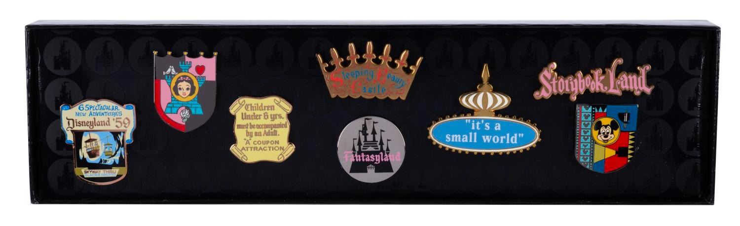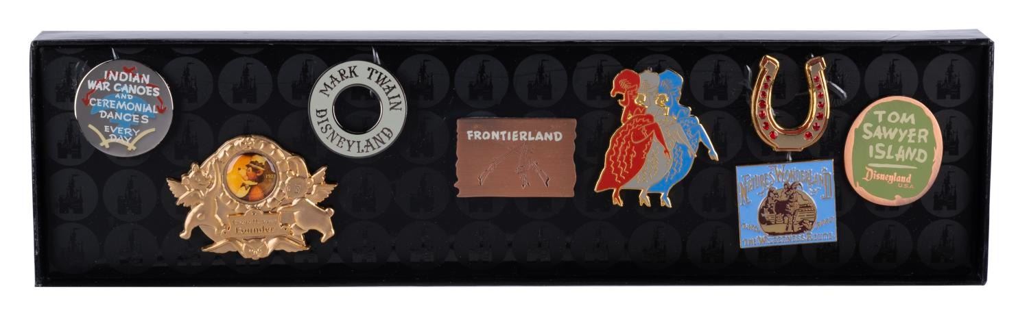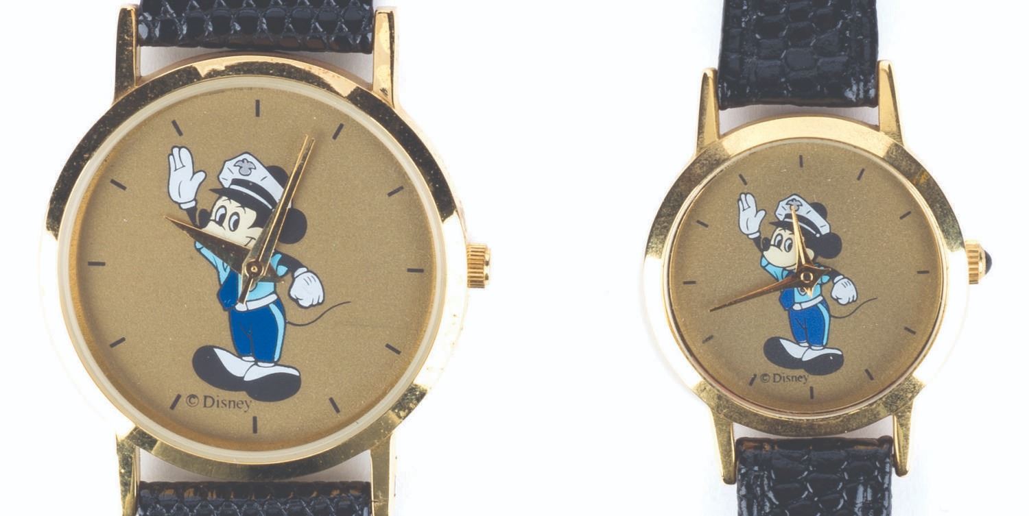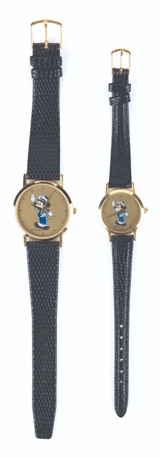 (Disneyland, 1990s-2000s) A pair of watches created for Disneyland Resort Security Hosts and Hostesses. The lot includes two watches with the Mickey Mouse Security Division logo on the face and a black leather band. The men’s watch is a size 18 with 9” band, and the women’s watch is of an unknown size with an 8” band. Each timepiece is in fine condition.