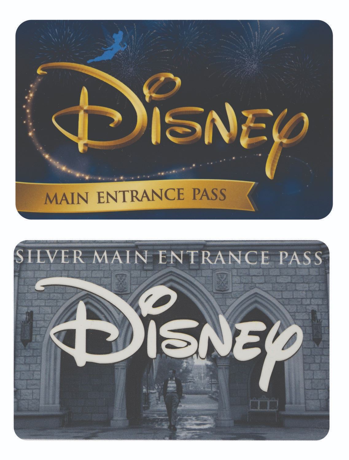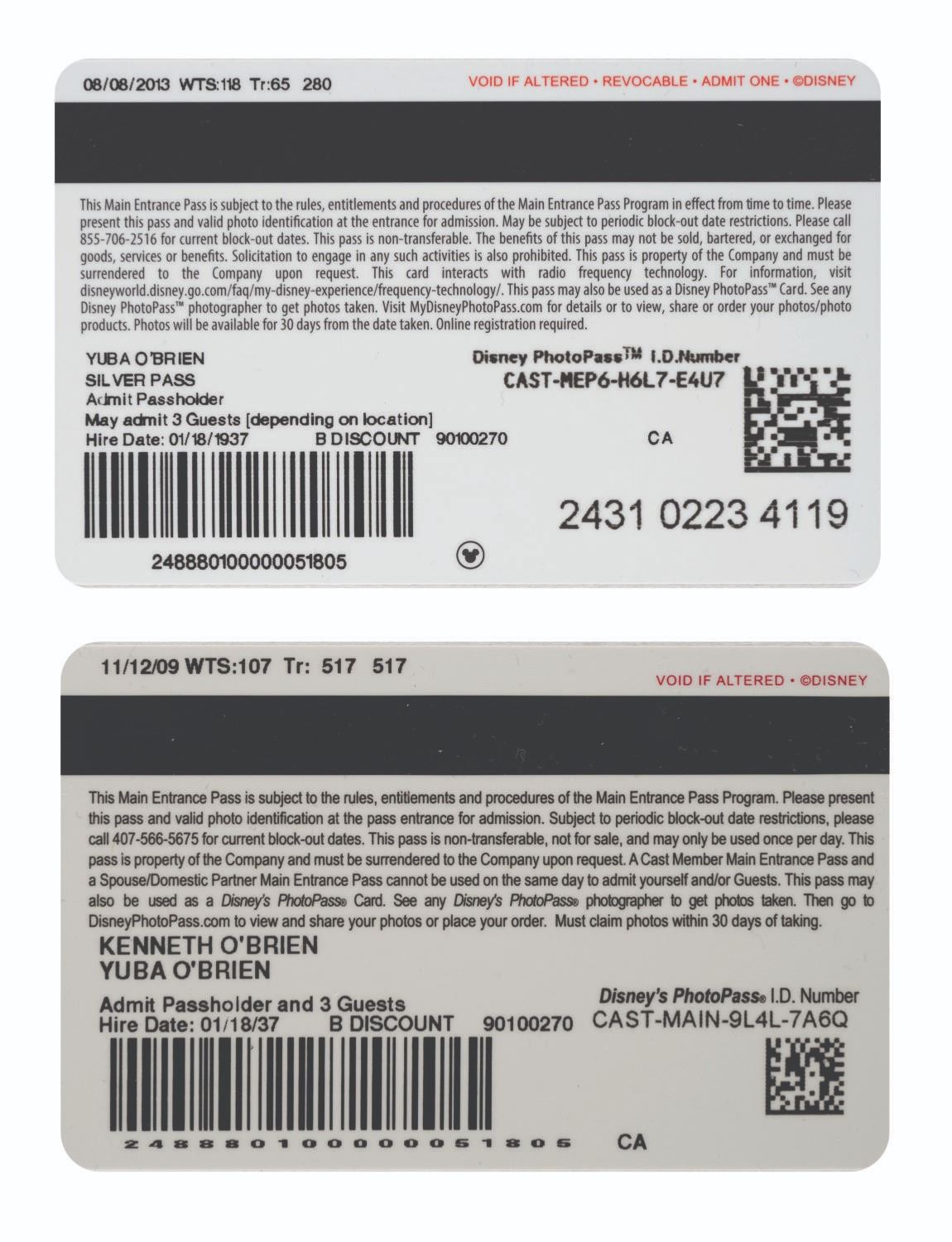 (Disney Parks, 2009-13) A Pair of Disneyland Entrance and Silver Passes. This Disney Silver Main Entrance Pass and this Disney Main Entrance Pass were owned by Walt Disney Studios veterans Ken & Yuba O'Brien. Hired in 1937, the pair continued with the Walt Disney Company, ultimately joining the Main Entrance Pass Program for Disney Parks. Measuring approximately 3.5"x2", each plastic card is in very good condition with scuffs and wear from handling.