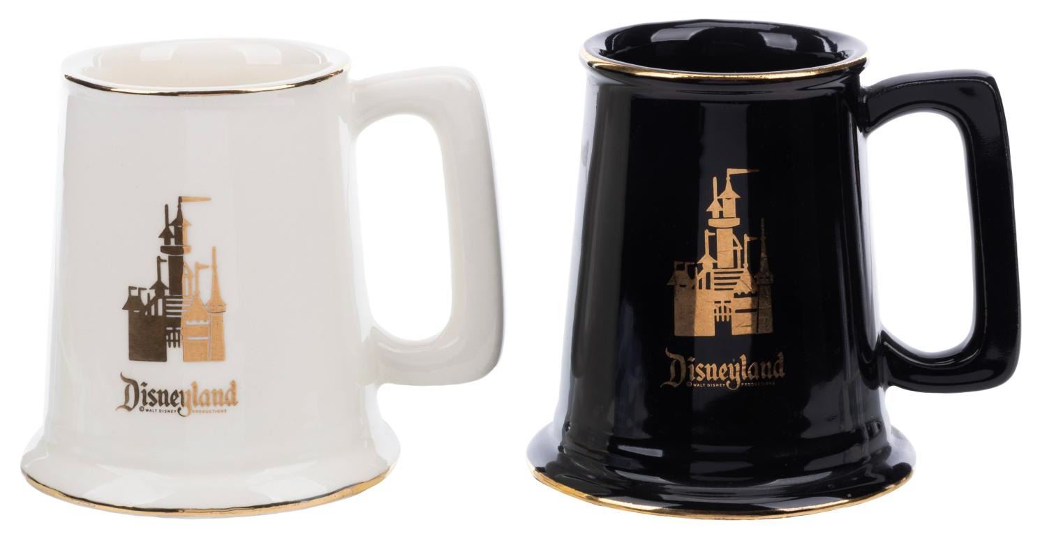 (Disneyland, 1970s-80s) A pair of black and white ceramic mugs featuring Sleeping Beauty Castle. Measuring 3.75” tall and 3.5” in diameter, the mugs display in very good condition with light scratches, stains, and a ripple in the white mug from the glazing process.