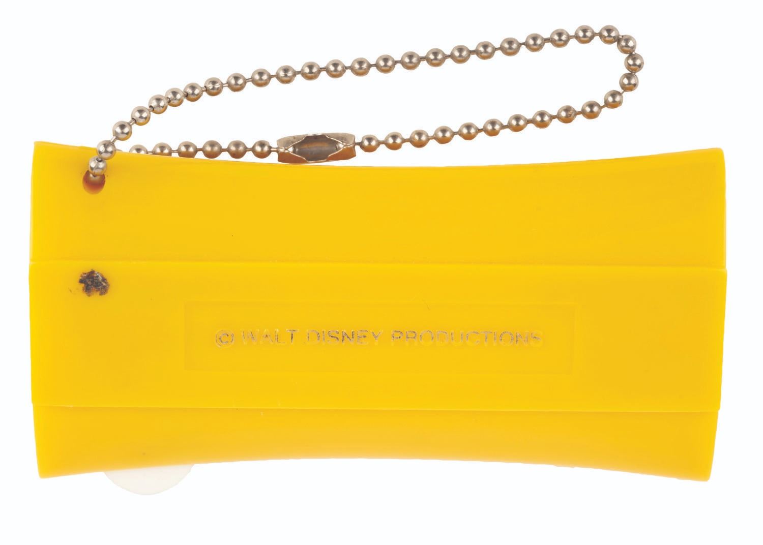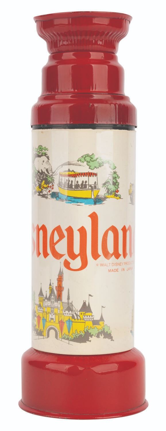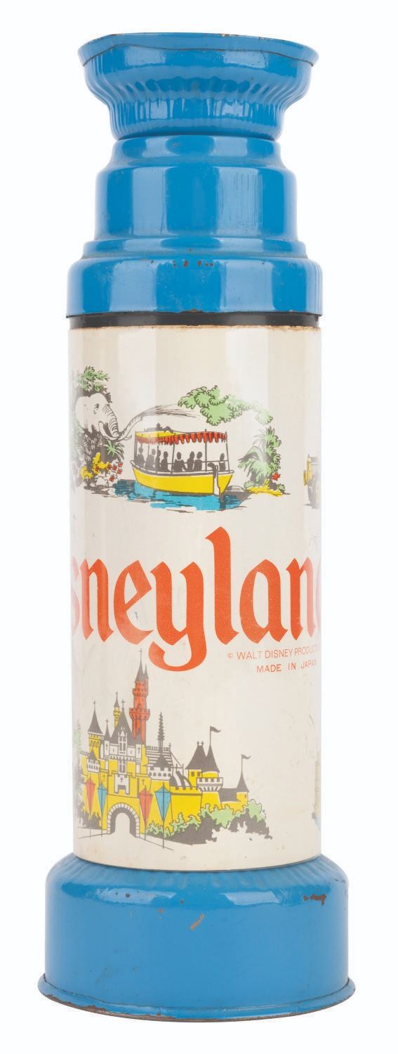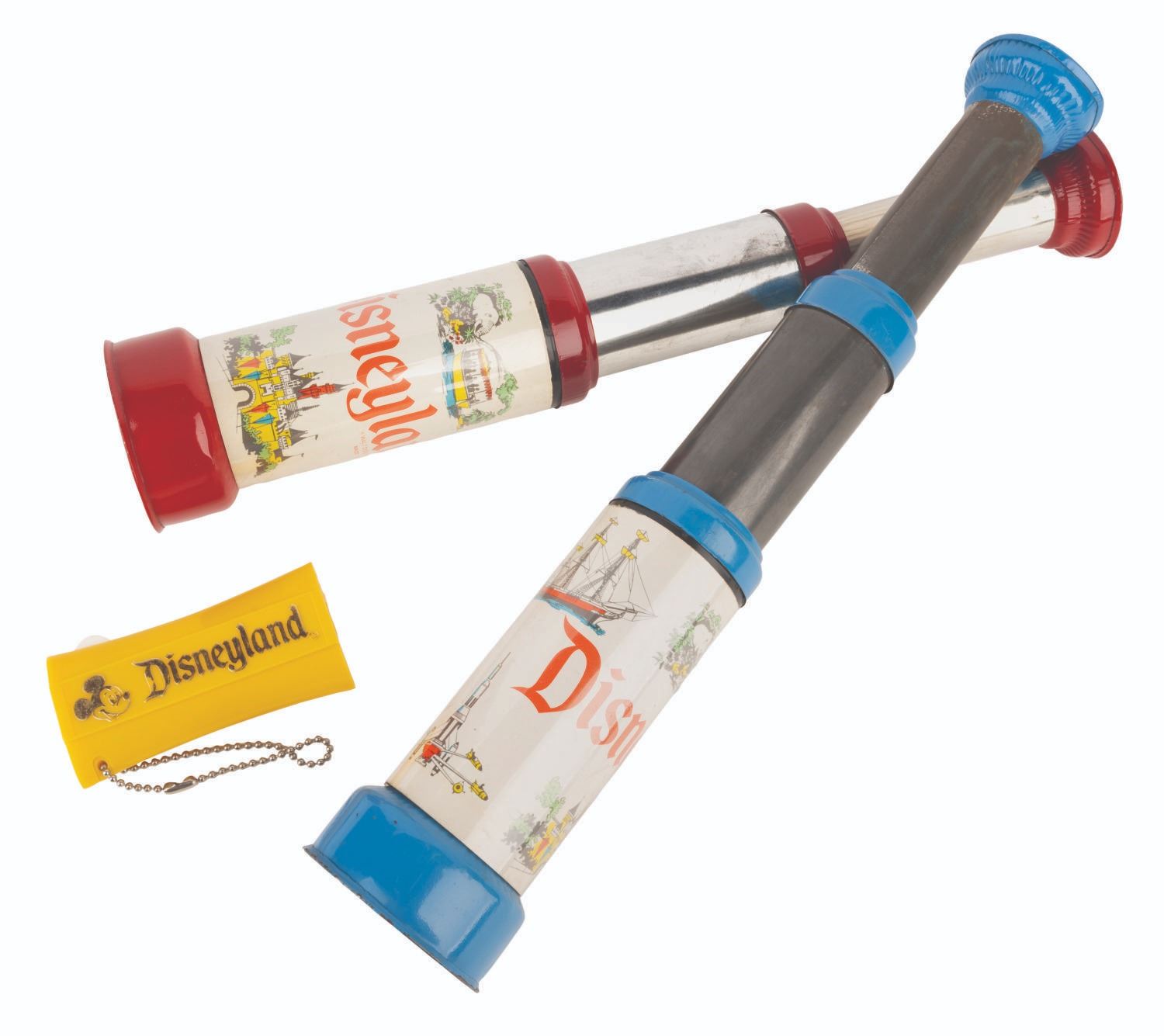(Japan, 1960s) A rare pair of toy spy glasses and souvenir light from Disneyland. The light features Mickey Mouse and the set of toys depict mid-1960s attractions with the Disneyland logo. Measuring 3.25" long and 12.5" tall and 2.25" in diameter, these souvenirs are in very good condition with minor oxidation, chips and scuffs to paint patina wear, and signs of repair to painted areas.