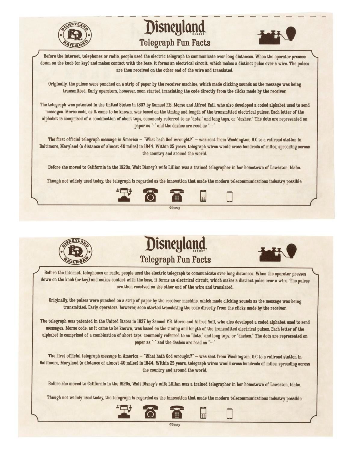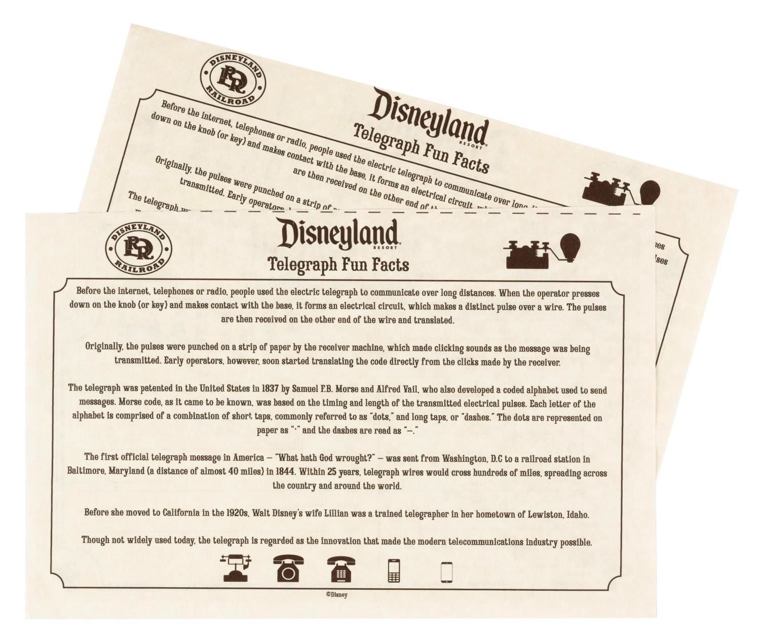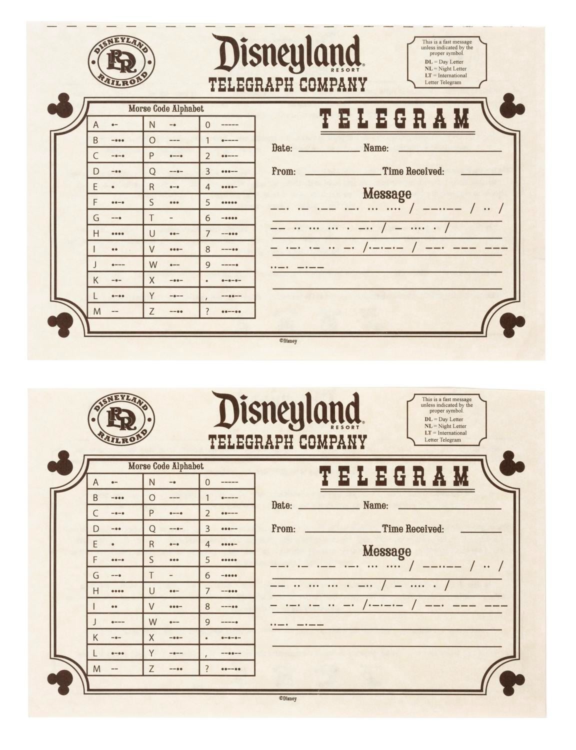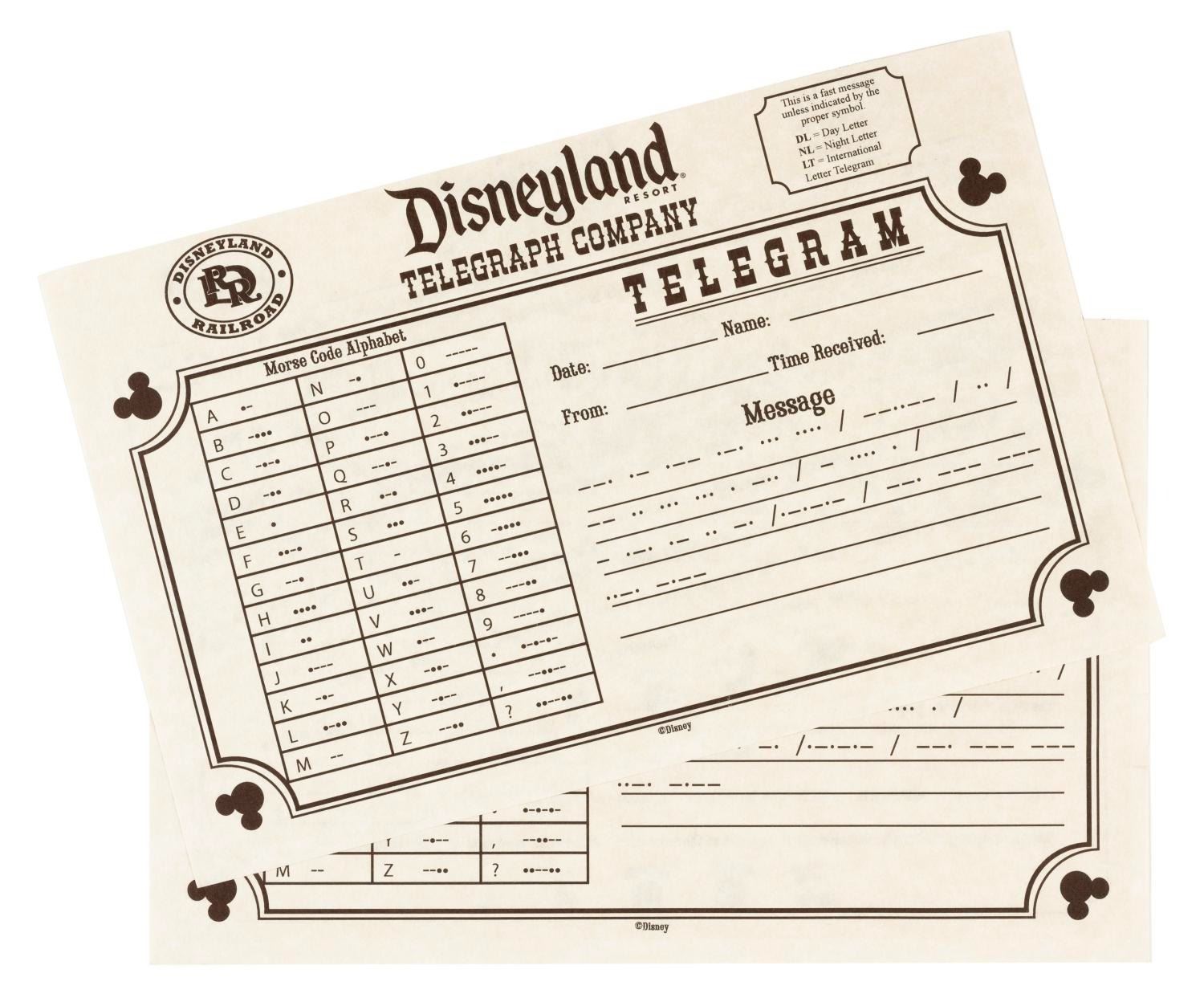 (Disneyland Resort, 2000s) A pair of unused Disneyland Railroad Telegraph Company Telegrams. Each telegram includes a morse code alphabet and a fact sheet on the reverse. Measuring 5.5" x 8.5" each, the telegrams are in very good condition with light handling wear.