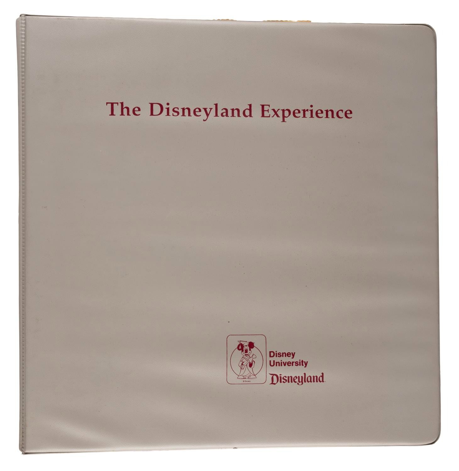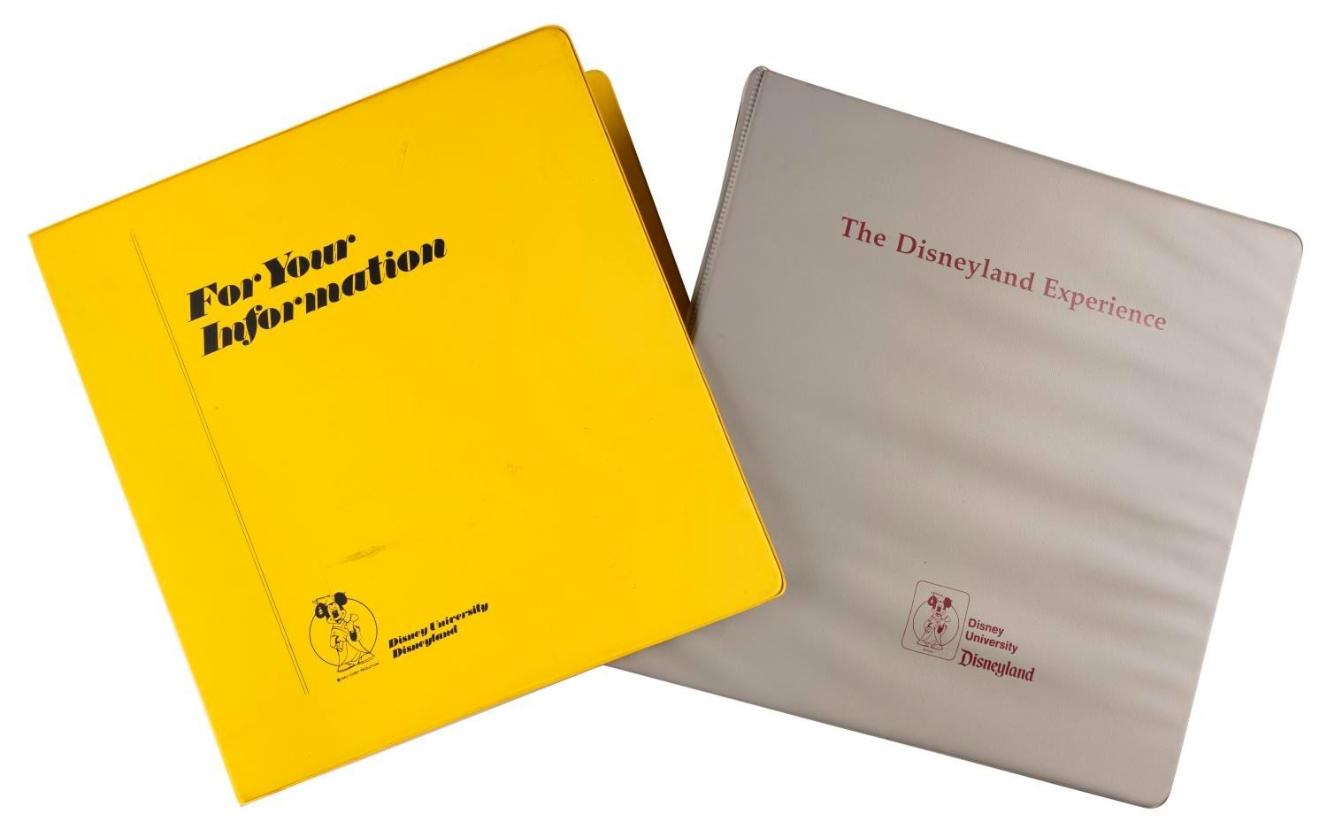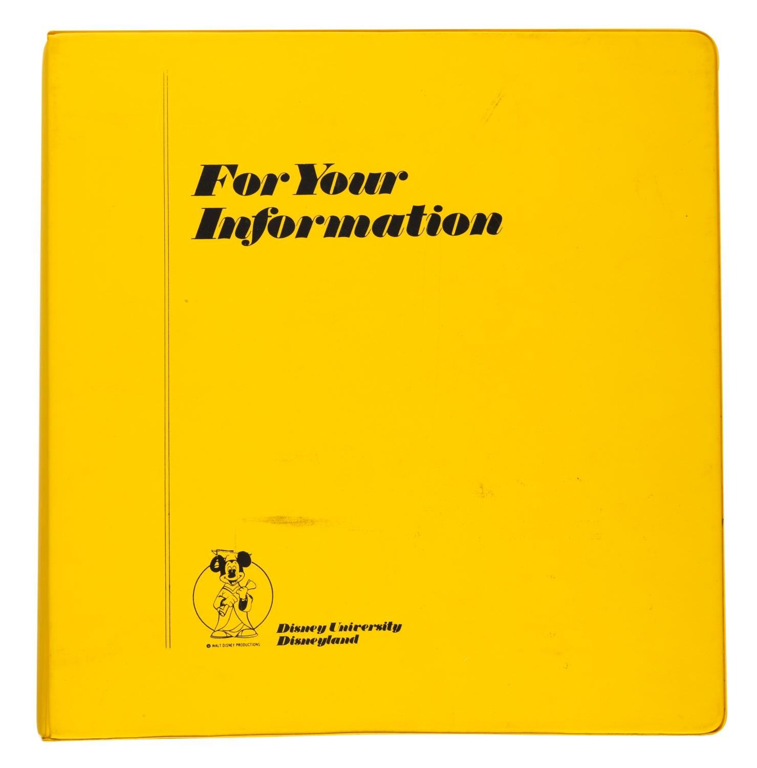 (Disneyland, 1970s-90s) A pair of Disneyland University binders, labeled “For Your Information” and “The Disneyland Experience.” Inside The Disneyland Experience binder are materials spanning three decades, including a “The Happiest Place on Earth unless you work there!” bumper sticker, insurance information, internal memos, brochures, costume cards, press releases, and more. Measuring 11.25” x 11.5.” x 3” thick, the binders and their materials are in good to very good condition with typical wear from Cast Member use.