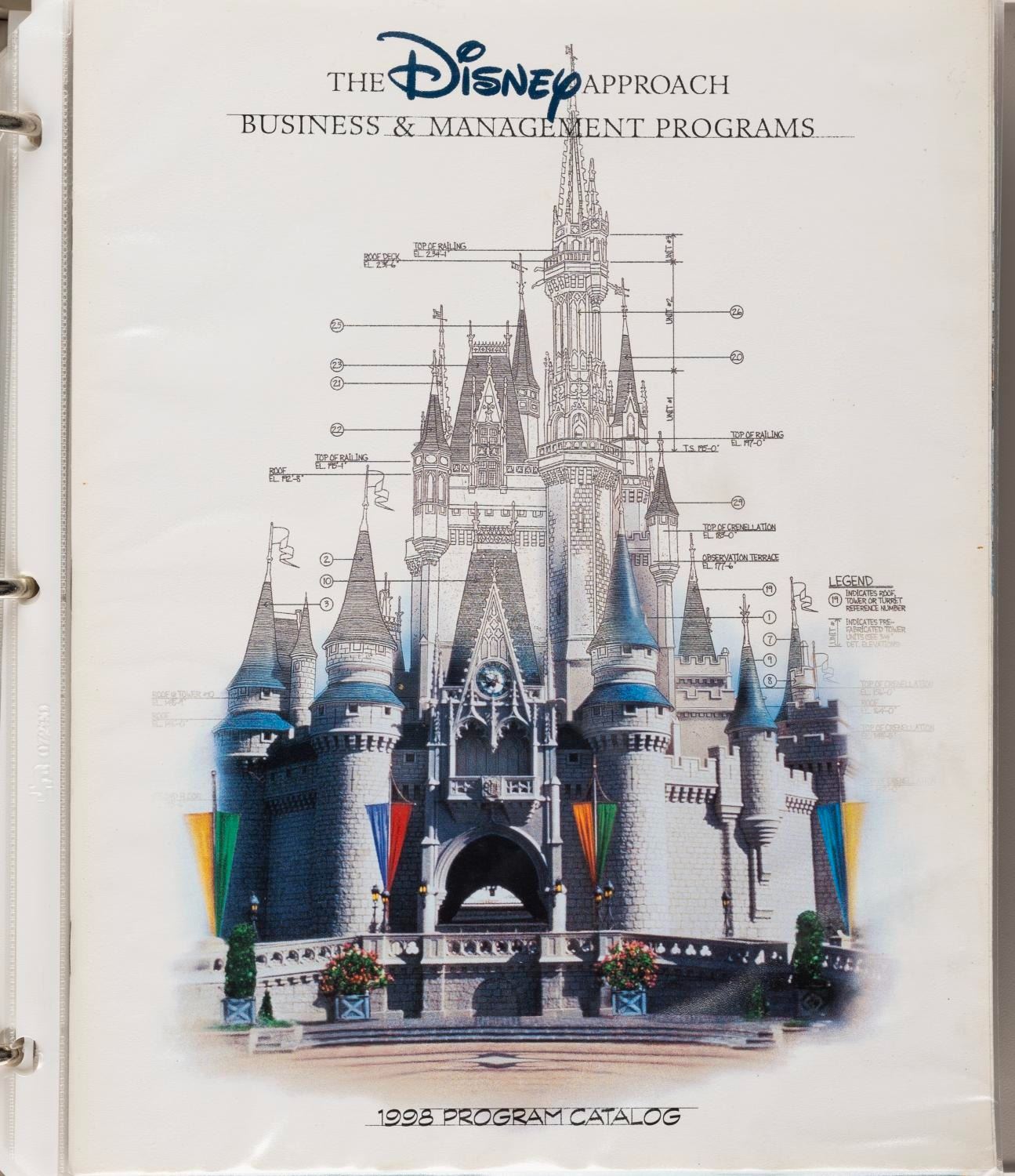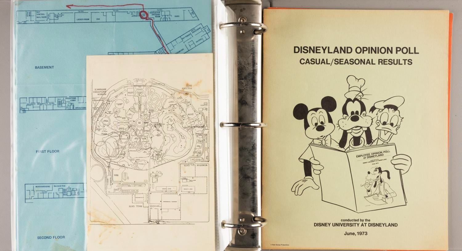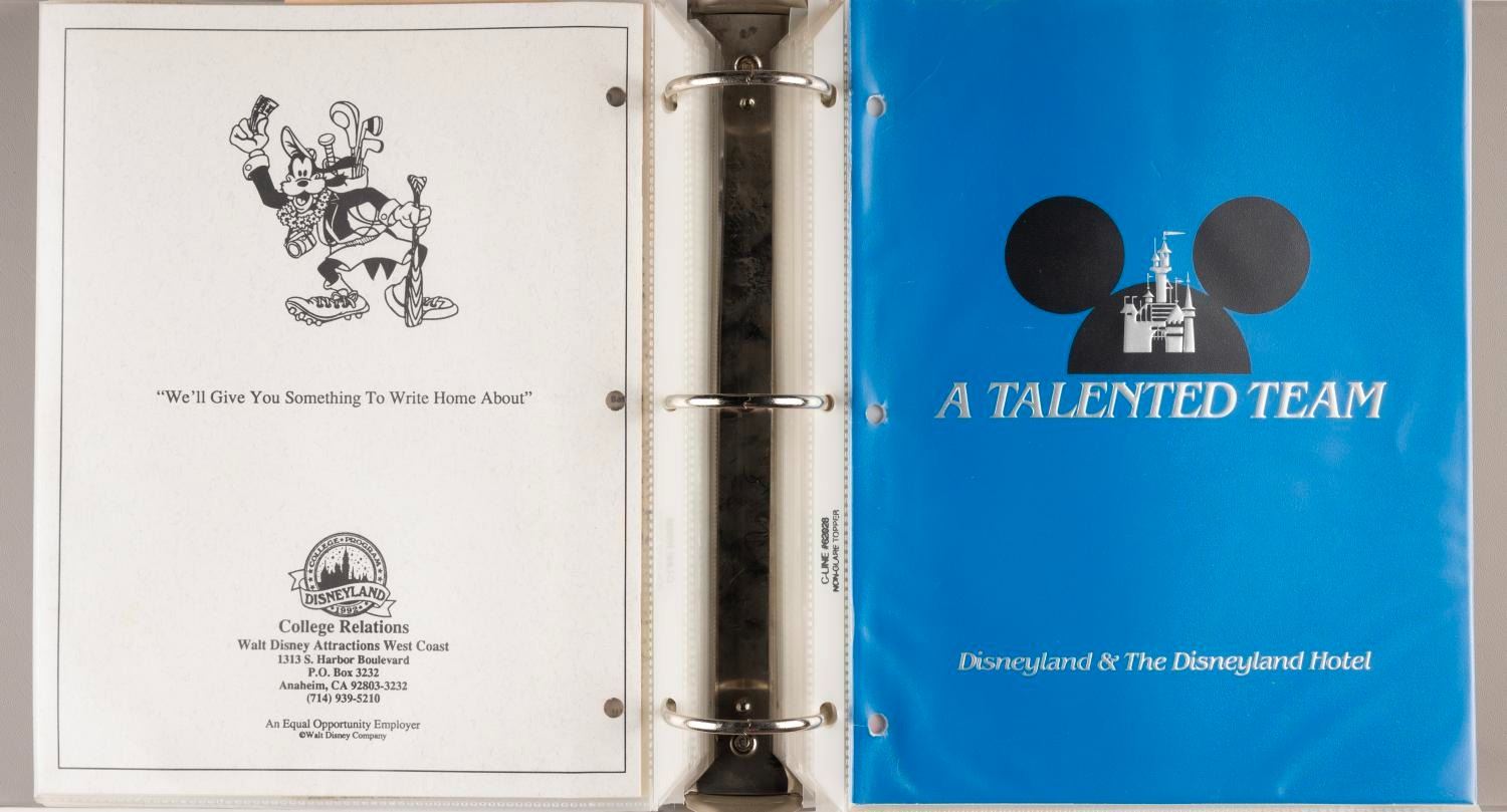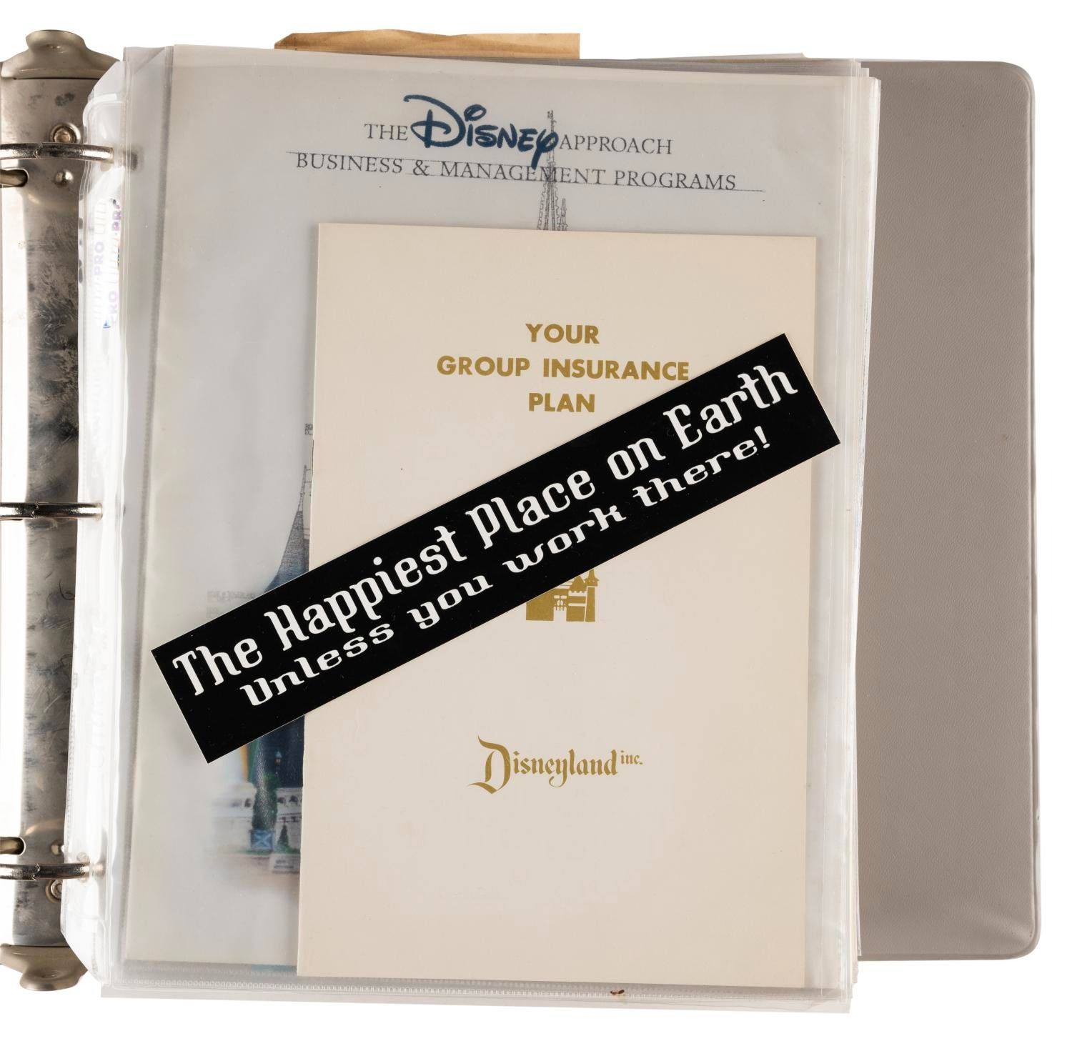(Disneyland, 1970s-90s) A pair of Disneyland University binders, labeled “For Your Information” and “The Disneyland Experience.” Inside The Disneyland Experience binder are materials spanning three decades, including a “The Happiest Place on Earth unless you work there!” bumper sticker, insurance information, internal memos, brochures, costume cards, press releases, and more. Measuring 11.25” x 11.5.” x 3” thick, the binders and their materials are in good to very good condition with typical wear from Cast Member use.