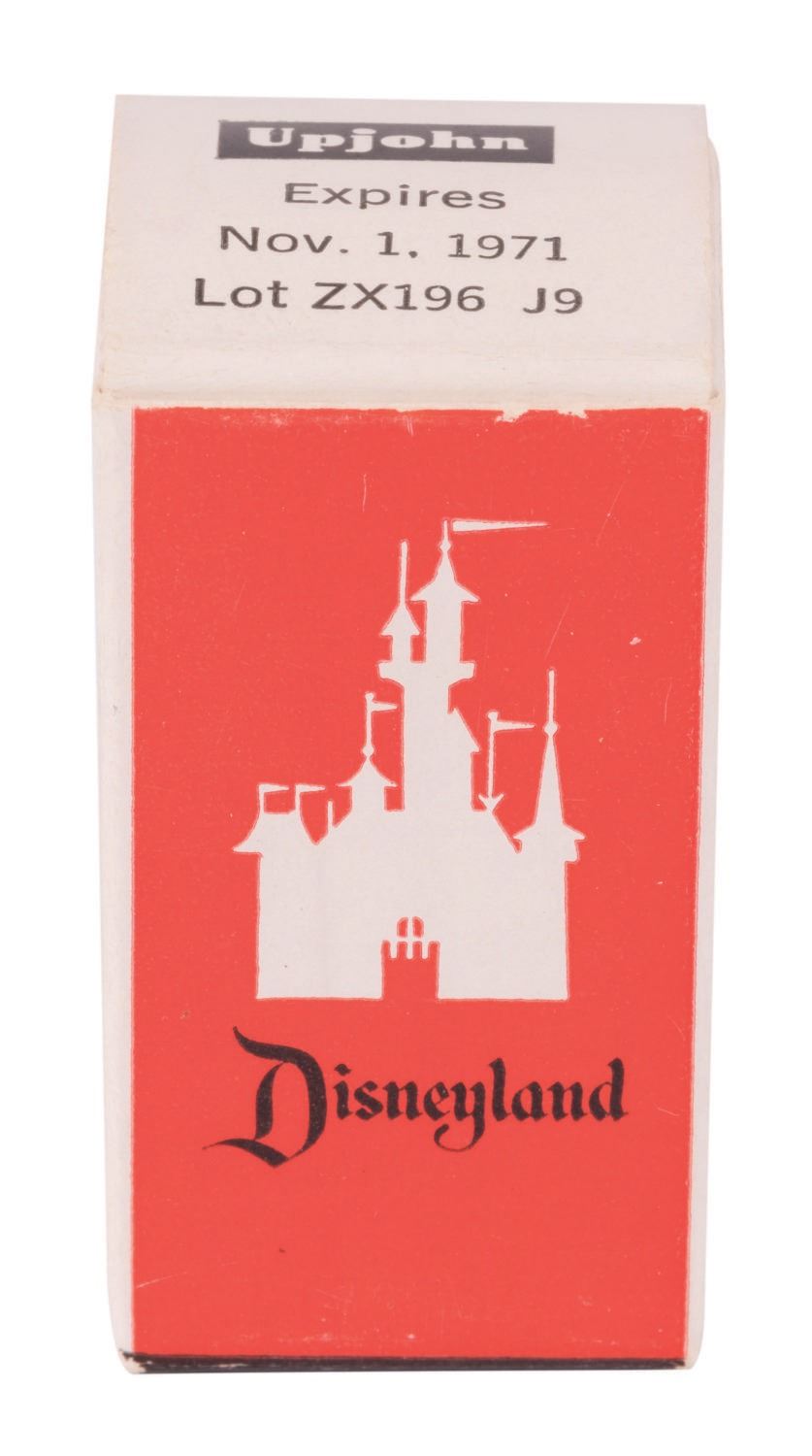 (Disneyland, 1955-1960s) A pair of complimentary Unicap Multi-vitamin capsule bottles once distributed to Guests of Upjohn Pharmacy on Main Street U.S.A. at Disneyland. The bottles and boxes feature imagery of Sleeping Beauty Castle and Upjohn logos. Measuring 1.5" and 1.75" tall, the pieces are in very good to fine condition with minor creases and wear from handling and age. The pills are meant for display purposes and should not be consumed due to age.