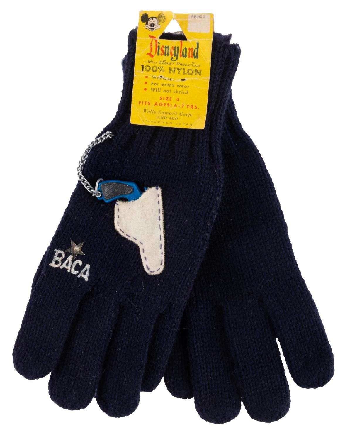 (Wells Lamont, 1958) A pair of children's gloves featuring a silver star with the name "Baca" below it for the title character of Disney's television program, "The Nine Lives of Elfego Baca." The gloves also feature a toy gun charm attached to the gloves, and a small holster sewn into the gloves for it. Measuring 2.75” x 7", the gloves are in good condition with the original tag and are missing a piece of the gun charm.