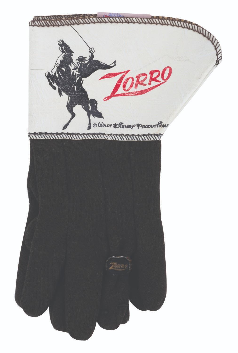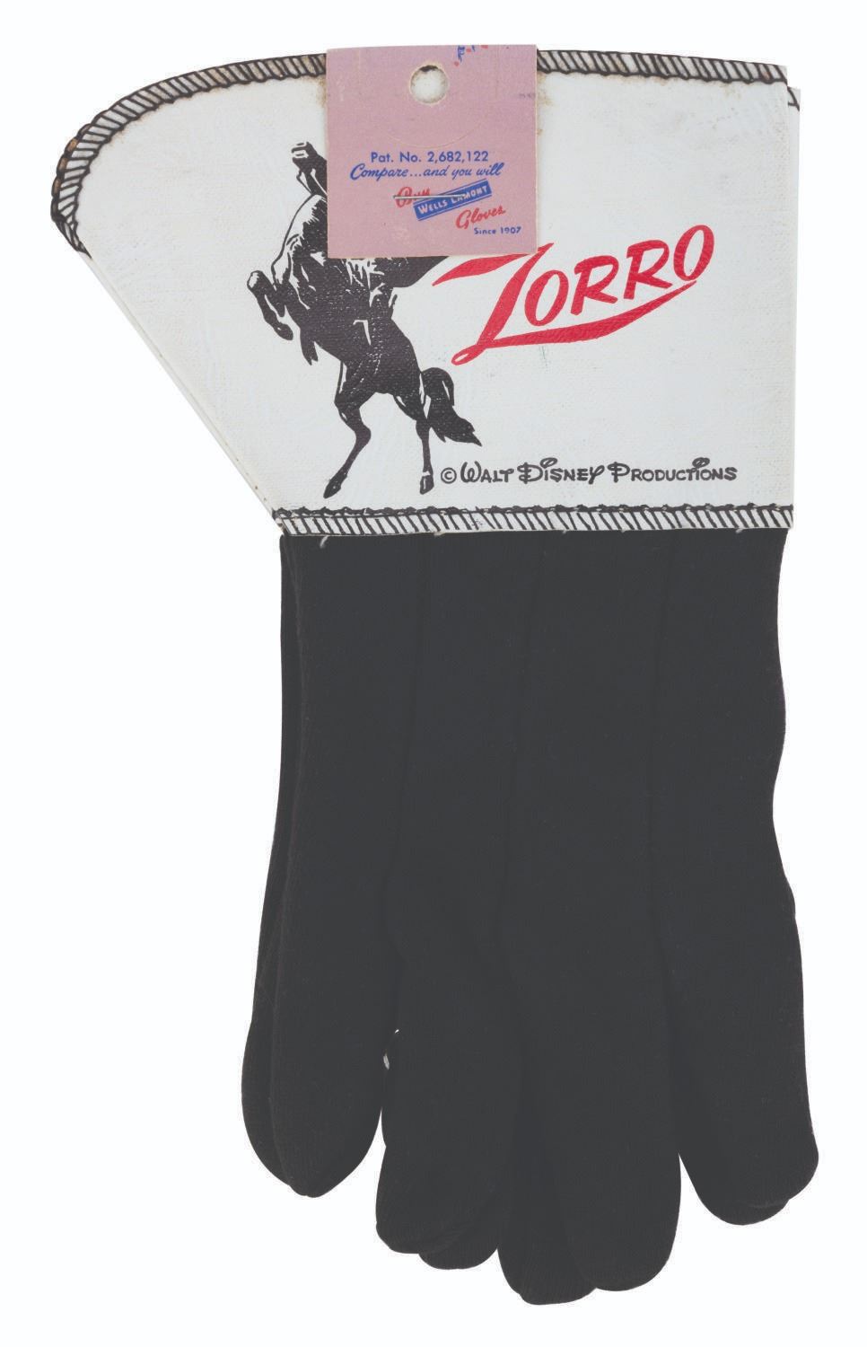 (Wells Lamont, 1950s) A pair of official Disneyland brand Zorro Gloves and a plastic Zorro ring sold in department stores throughout the country and at Disneyland. Measuring 9” long and 1” in diameter, the gloves and ring are in good condition, with fading, light stiffness, a few scuffs to the screen-printed leatherette, and retaining its original product label.