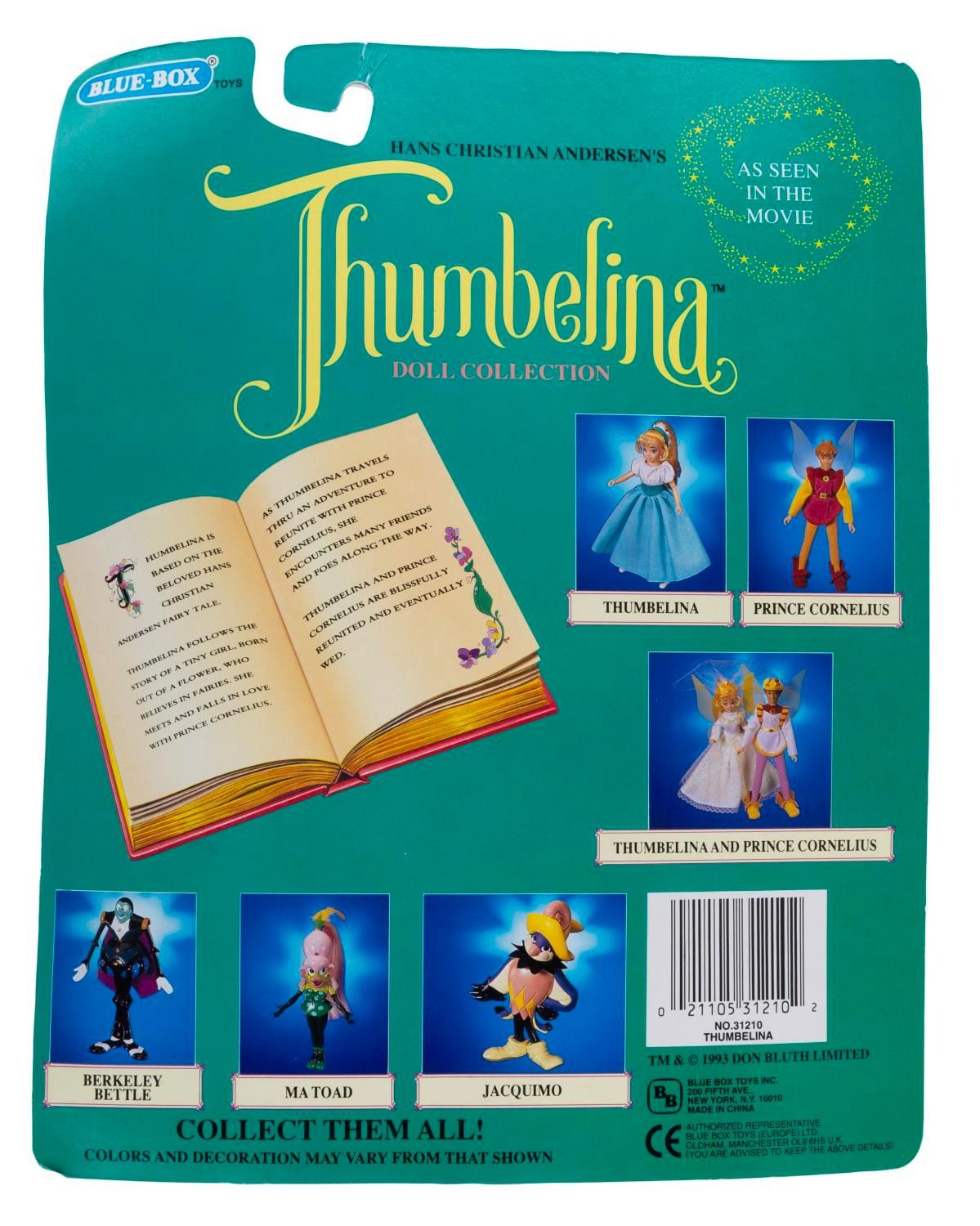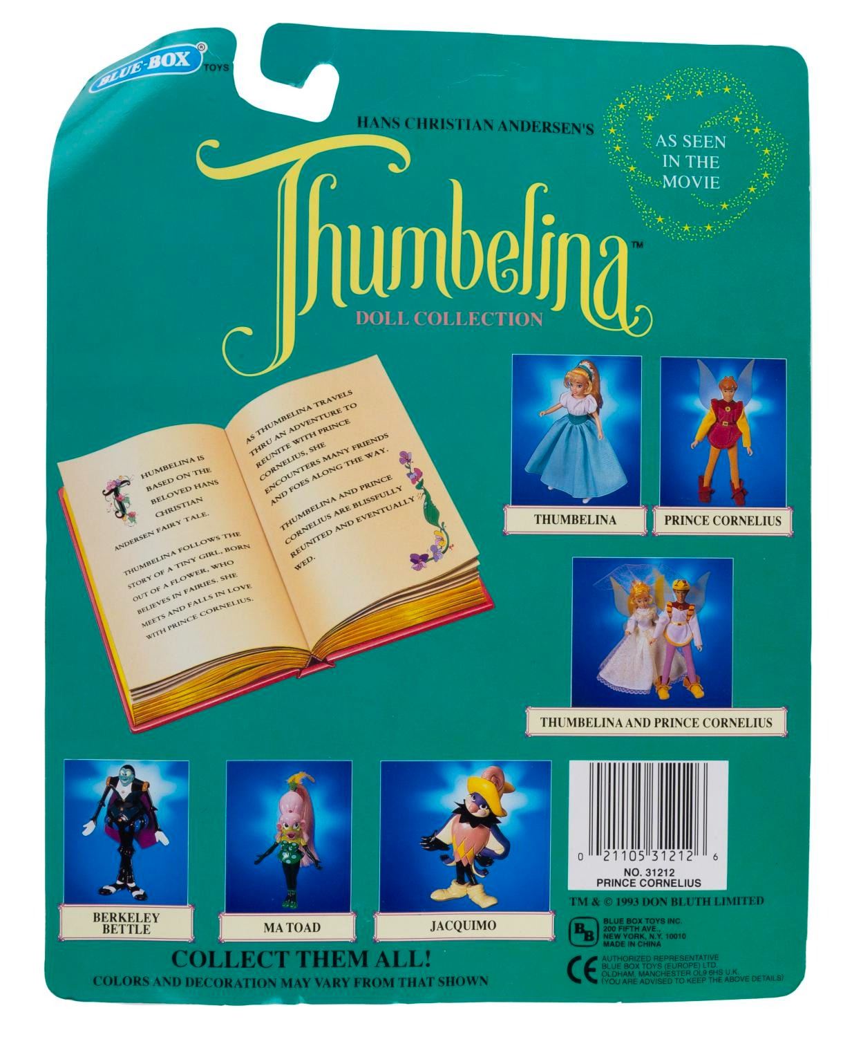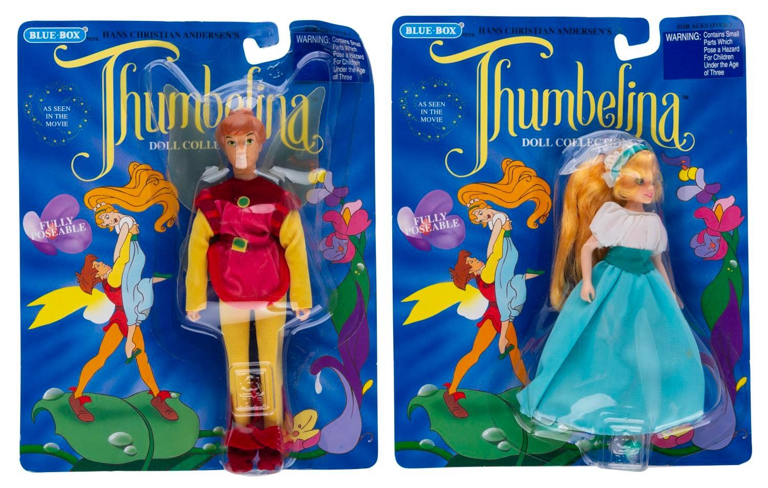 (Don Bluth Inc., 1993) Two dolls from Don Bluth’s "Thumbelina." Included are Thumbelina and Prince Cornelius. Measuring 6.5" and 7.5" tall, the dolls are in fine condition, both sealed on the 10" x 7.75" very good condition cards with some warping from age.