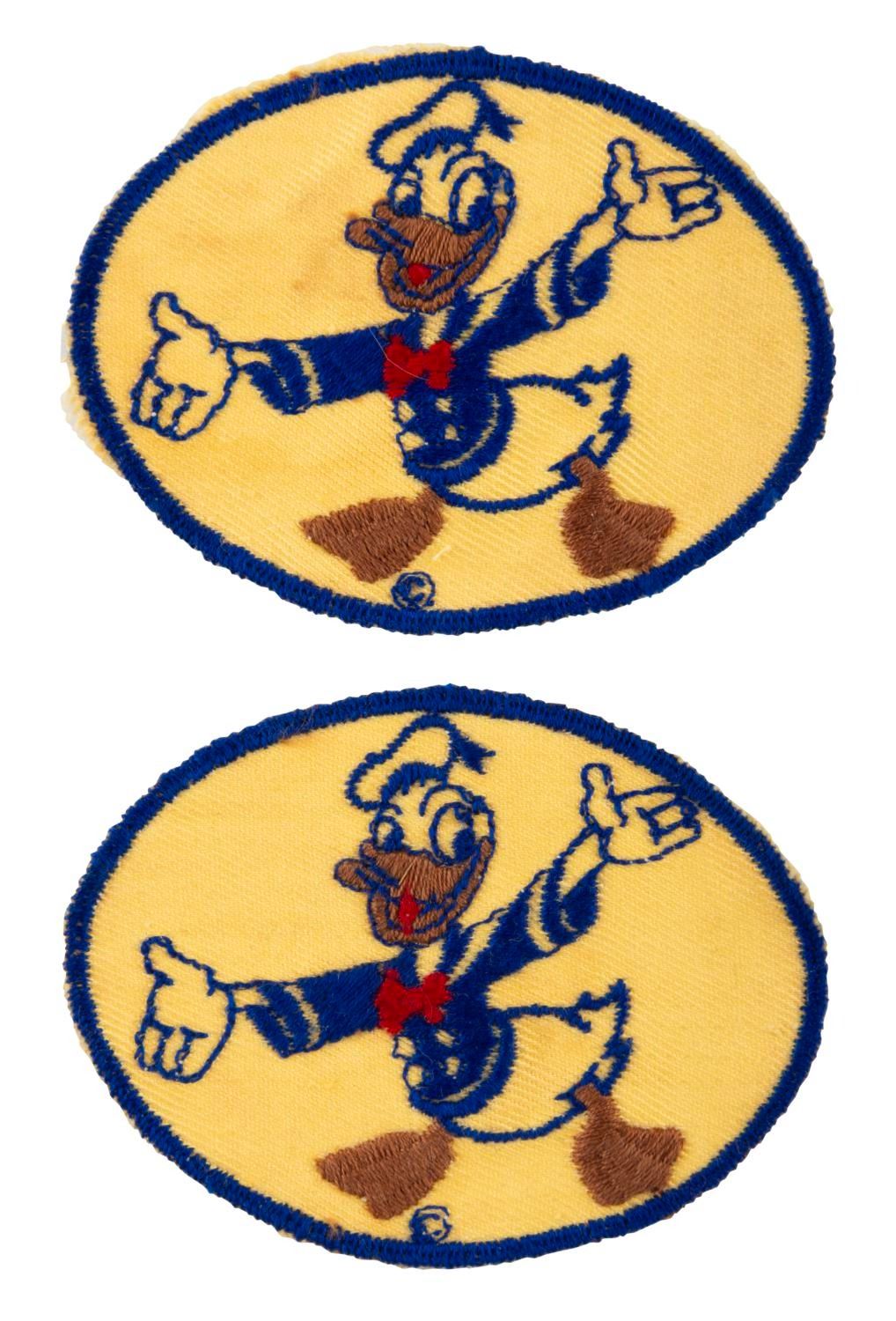 (Bond Bread, 1941-45) A pair of yellow Donald Duck patches, given by the Bond Bread Company to participants in scrap metal drives during World War II. Measuring 2.25" x 3", the patches are in very good condition with light wear, fraying, and discoloration from age.