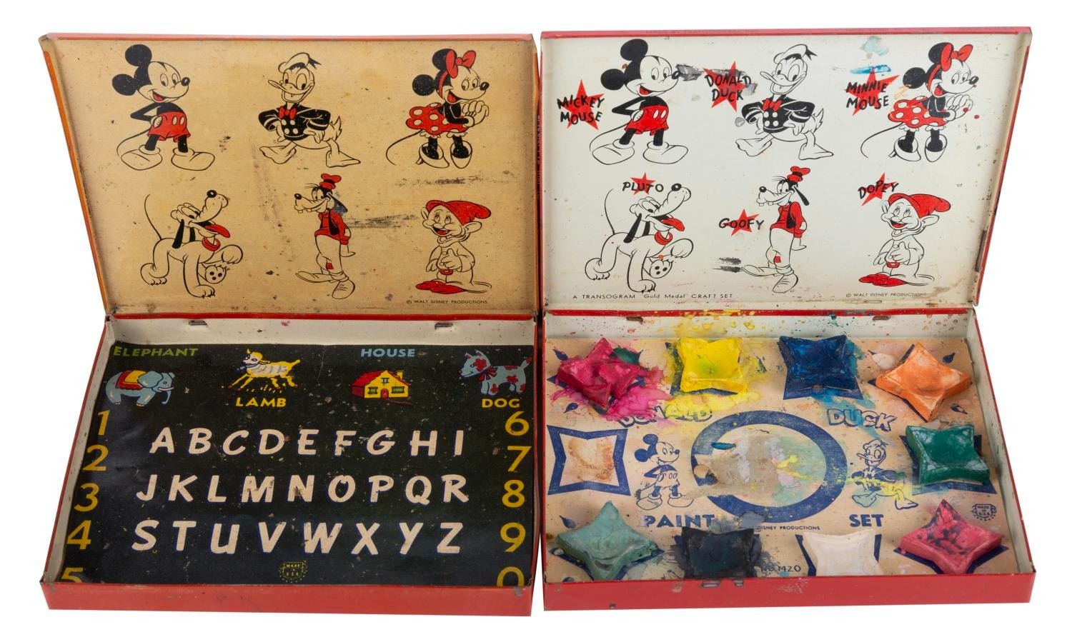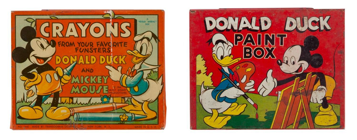 (Transogram, 1958) A pair of Donald Duck & Mickey Mouse Crayons & Paint Set boxes by Transogram. Measuring 5.75”x4.5”, these “gold medal” toy set boxes are in fair, used condition, with dents, scuffs, and wear to the tin lithographic boxes and missing their originl crayon and brush art supplies.