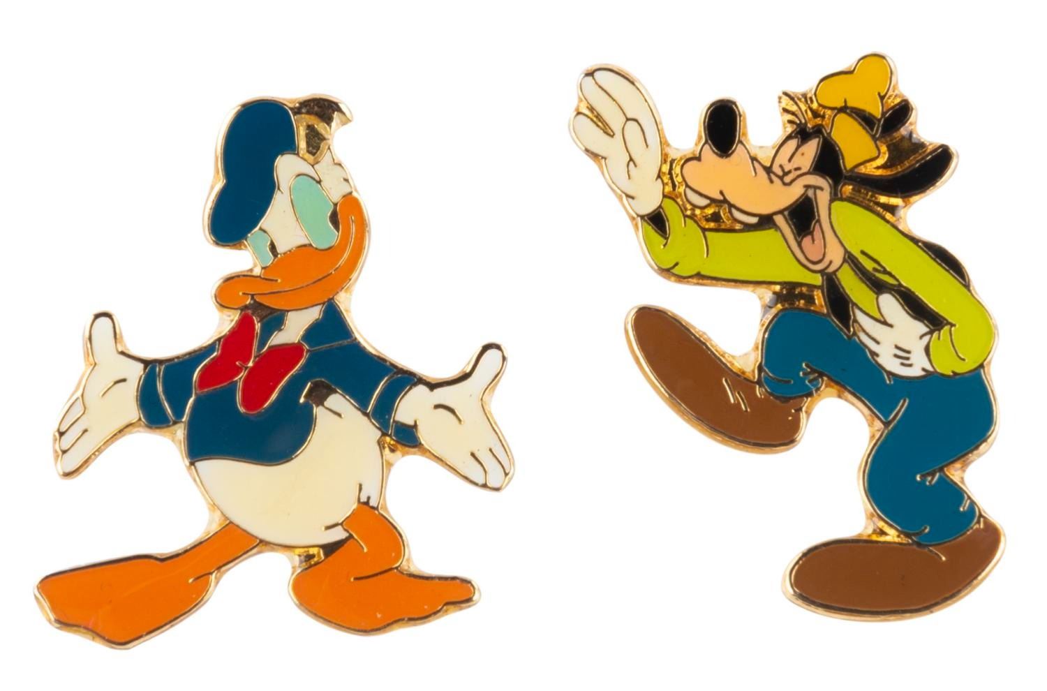 (Monogram, 1990s) A pair of early small Donald Duck and Goofy pins by Monogram. Measuring 1” and 1.25”, the pins are in very good condition with typical light color shift from age.