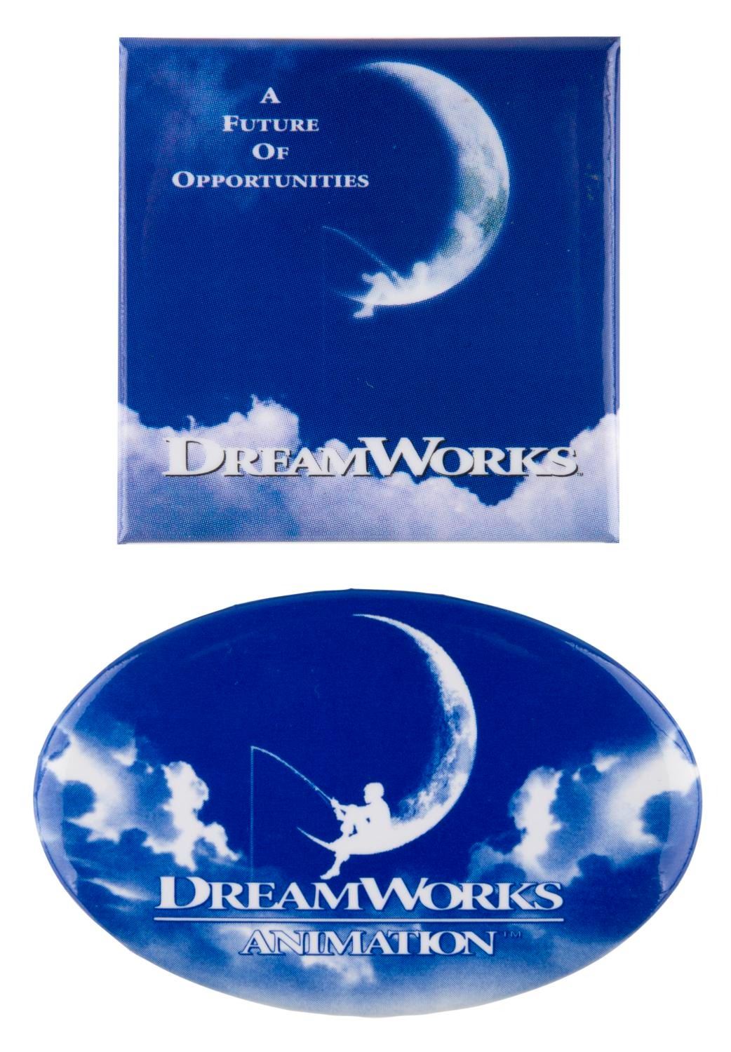 (Dreamworks, 1990s) A pair of Dreamworks and Dreamworks Animation buttons. The buttons are in very good condition with small scratches to the square pin.