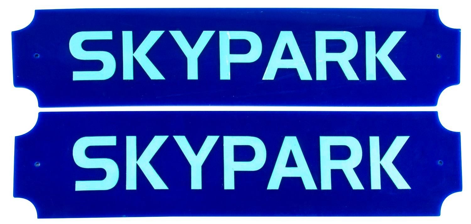 (EPCOT, 2010s) A pair of signs for Skypark at EPCOT Center. Each measuring 3” x 12”, the acrylic signs are in very good condition with light wear from Park use.