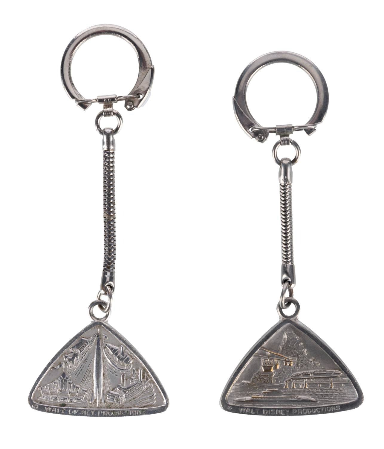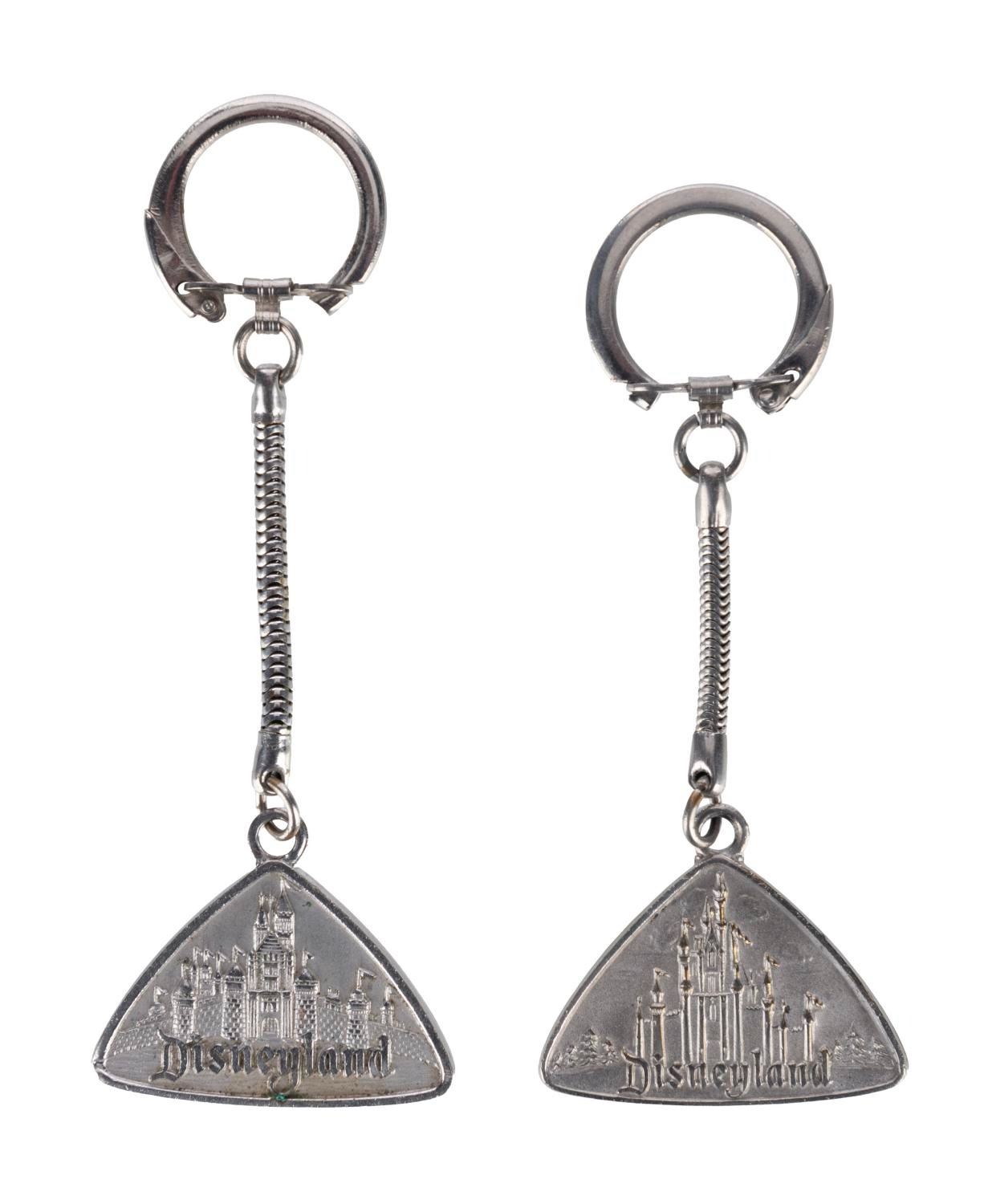 (Disneyland, 1960s-70s) A pair of souvenir keyrings from Disneyland with reliefs of Sleeping Beauty Castle. Measuring 1.5" x 1.5", each piece retains its original 2.75" snake-style chain and is in very good condition, exhibiting minor scuffs and wear.