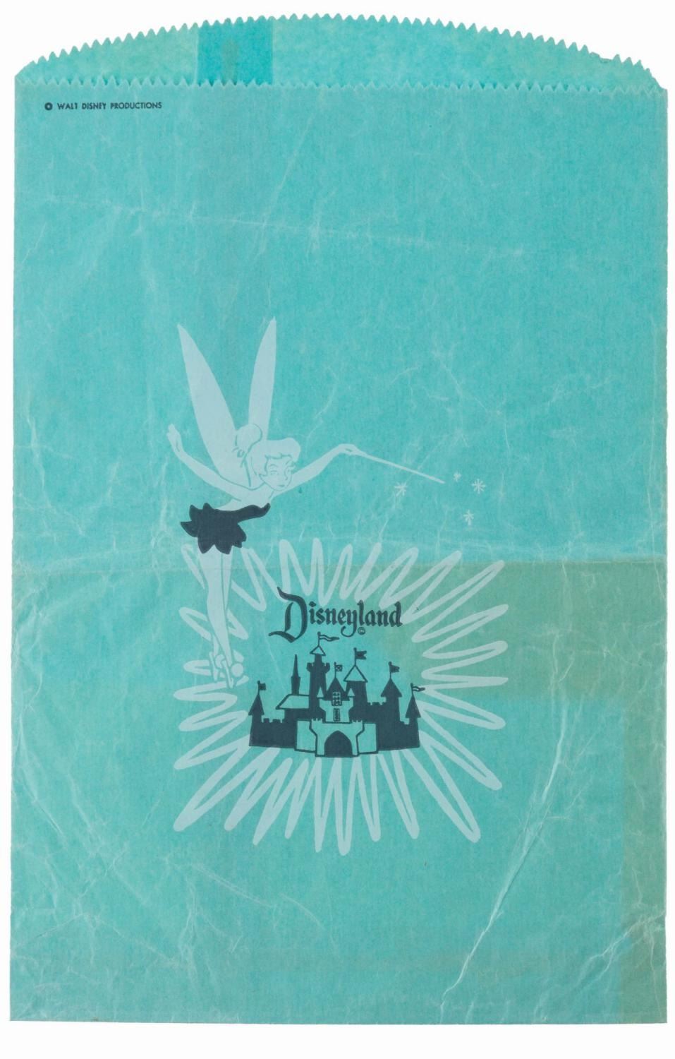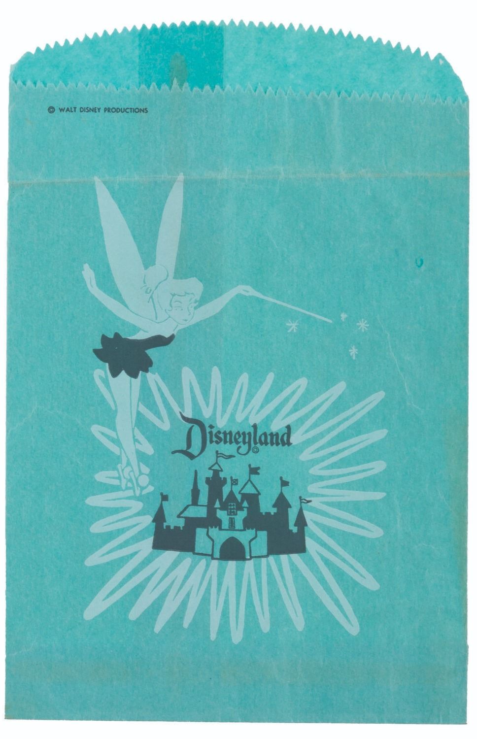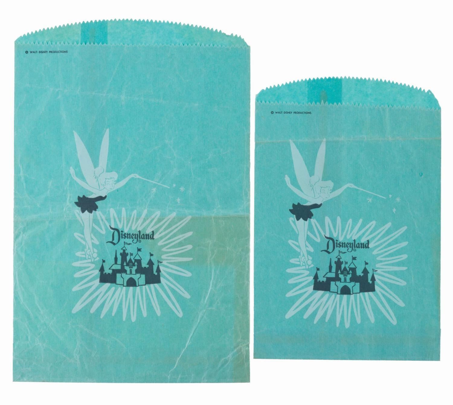 (Disneyland, 1950s-60s) A pair of early paper shopping bags from Disneyland featuring Tinker Bell. Measuring 5.5" x 8.5" to 7" x 11" the bags are in good condition with creases, folds, stains and discoloration, most notably to the right edge of the larger bag.