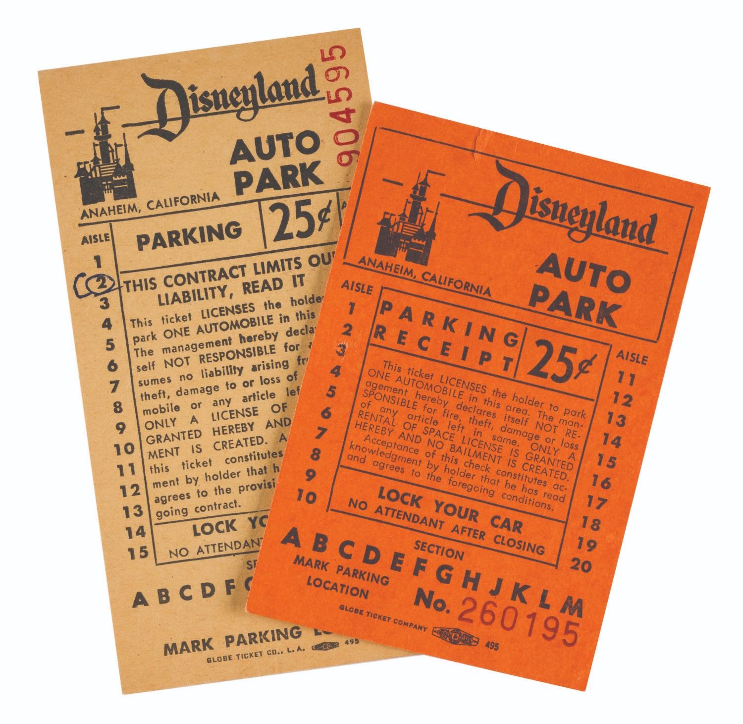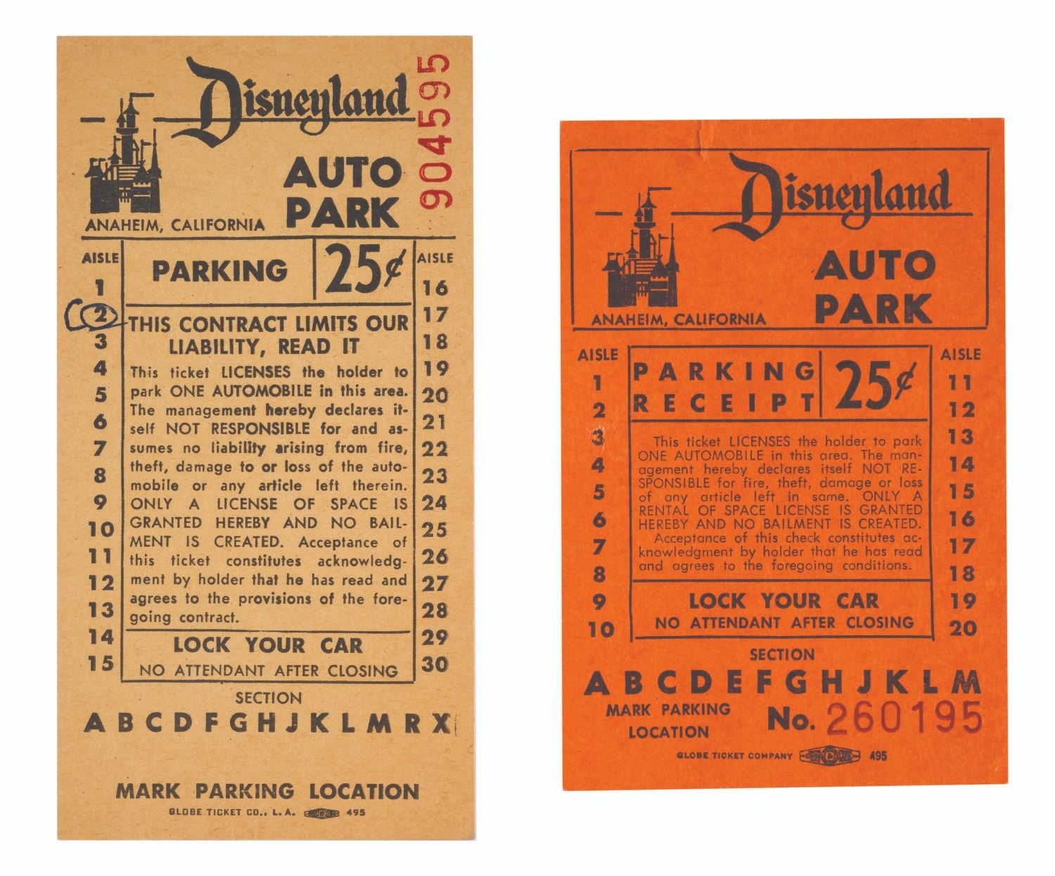 (Disneyland, 1957/60s) A pair of Disneyland Auto Park tickets, including a 1957 ticket numbered 904595 and a 1960s ticket numbered 260195. Measuring 2.75" x 4" and 2.5" x 4.75", the tickets are in very good condition with writing on each from Guest use.