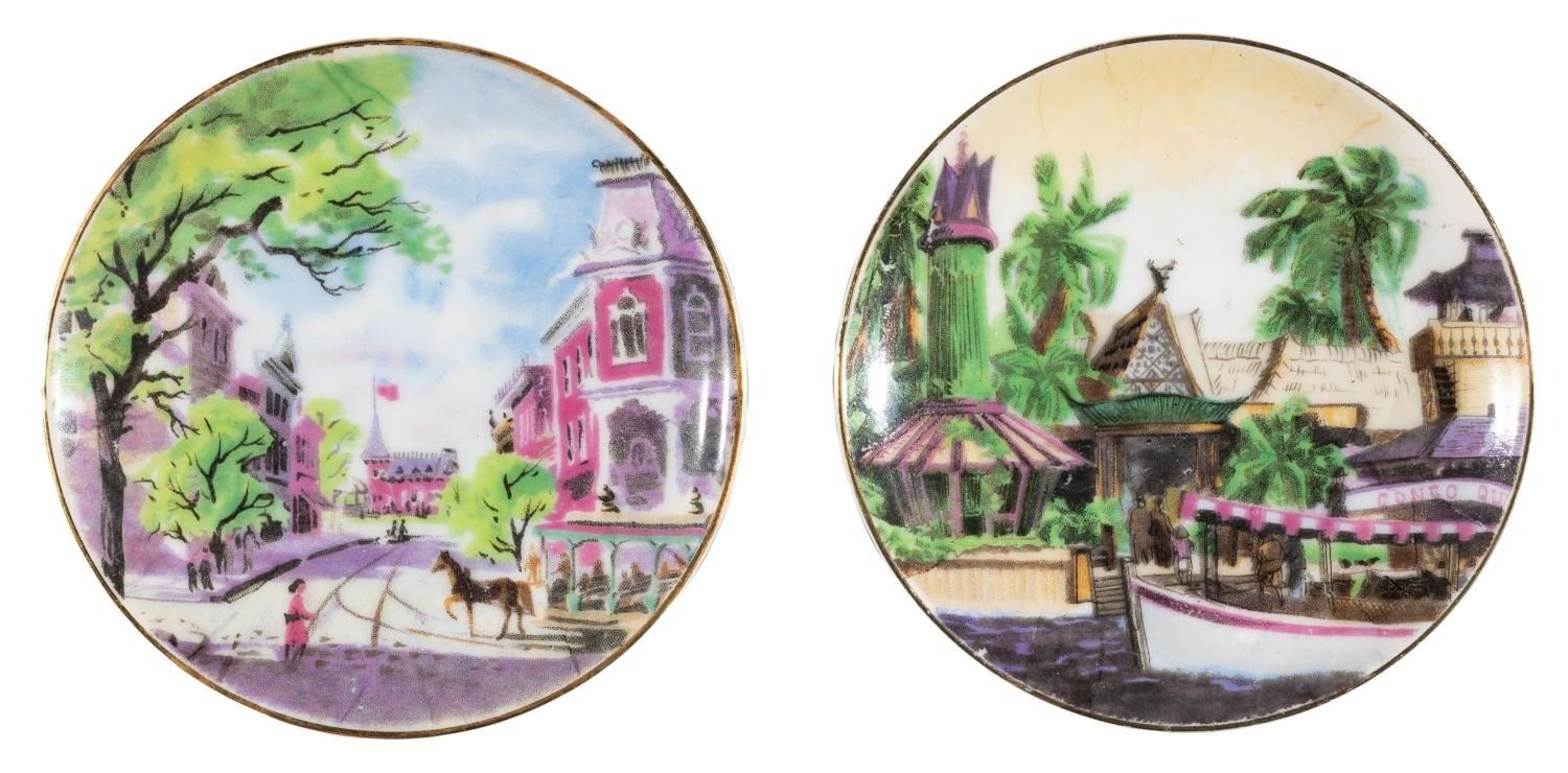 (Disneyland, 1950s-60s) A pair of miniature decorative china plates featuring Main Street and Adventureland at Disneyland. Measuring 4” in diameter, the plates are in very good condition, with slight crazing and wear.
