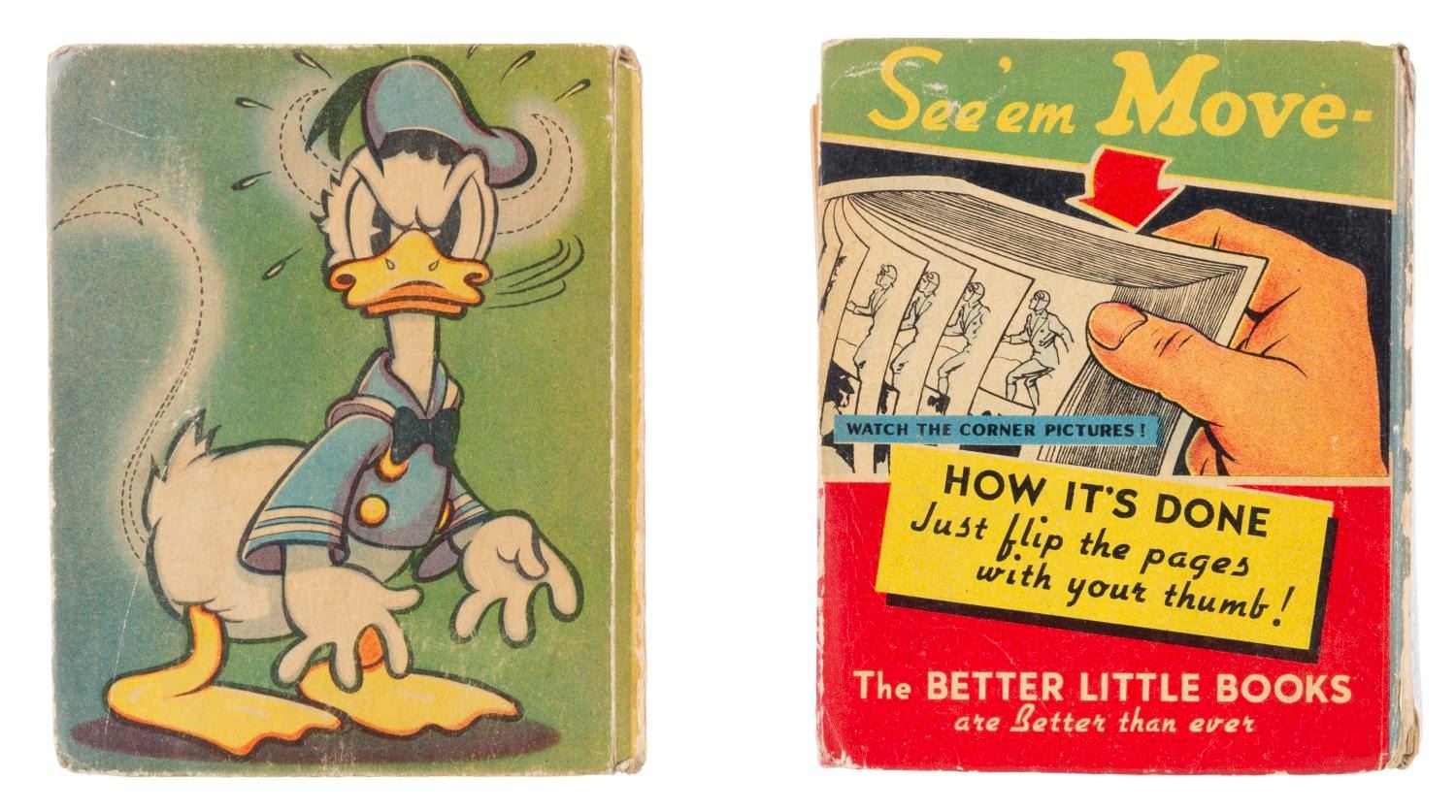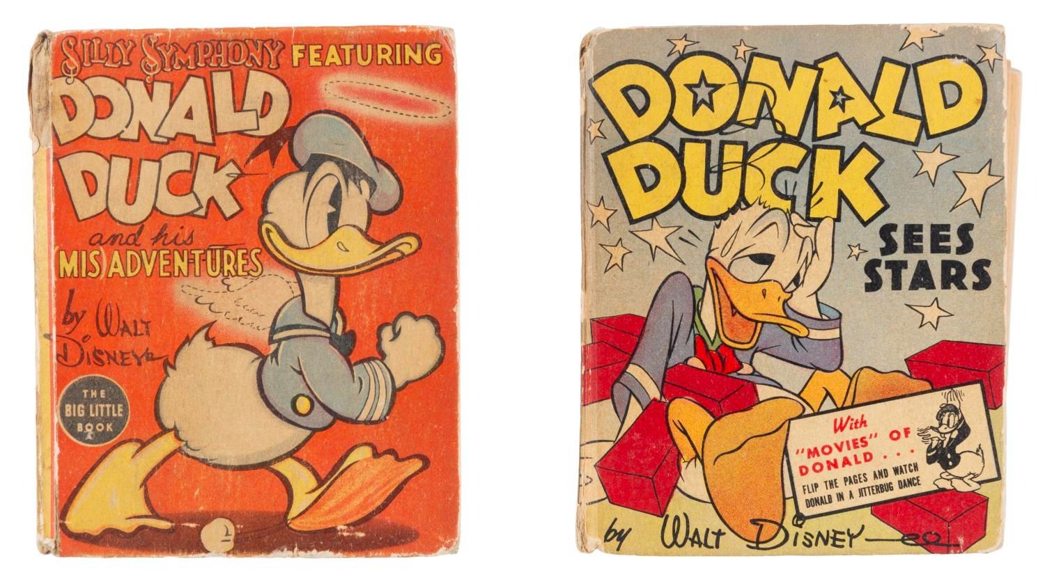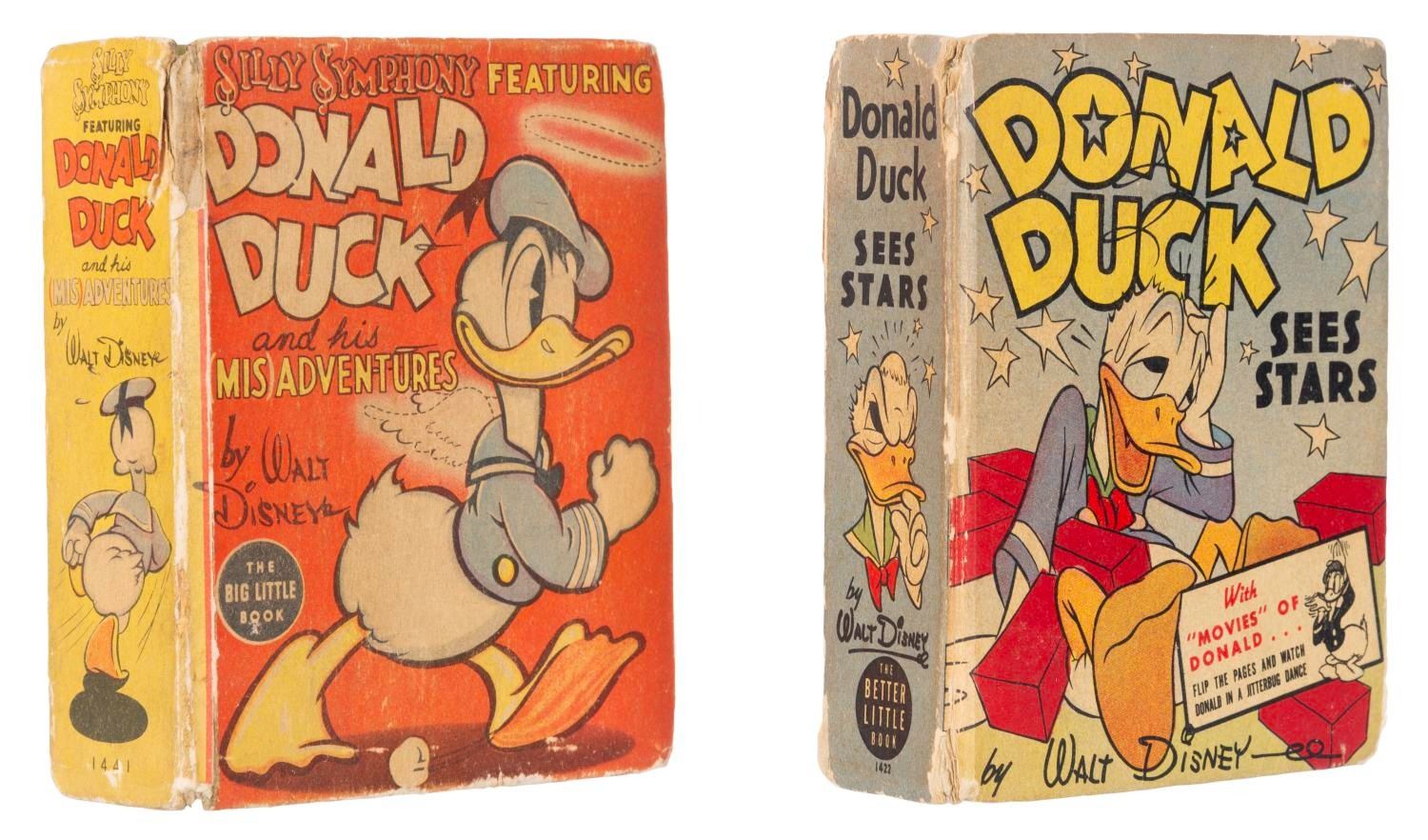 (Disney, 1937-1941) A pair of Donald Duck Big Little Books, "Silly Symphonies Featuring Donald Duck and His (Mis)Adventures" and "Donald Duck Sees Stars," which features a flipbook of Donald dancing. Each measuring 3.75" x 4.5", the books are in good condition with wear to the spine and discoloration from age.