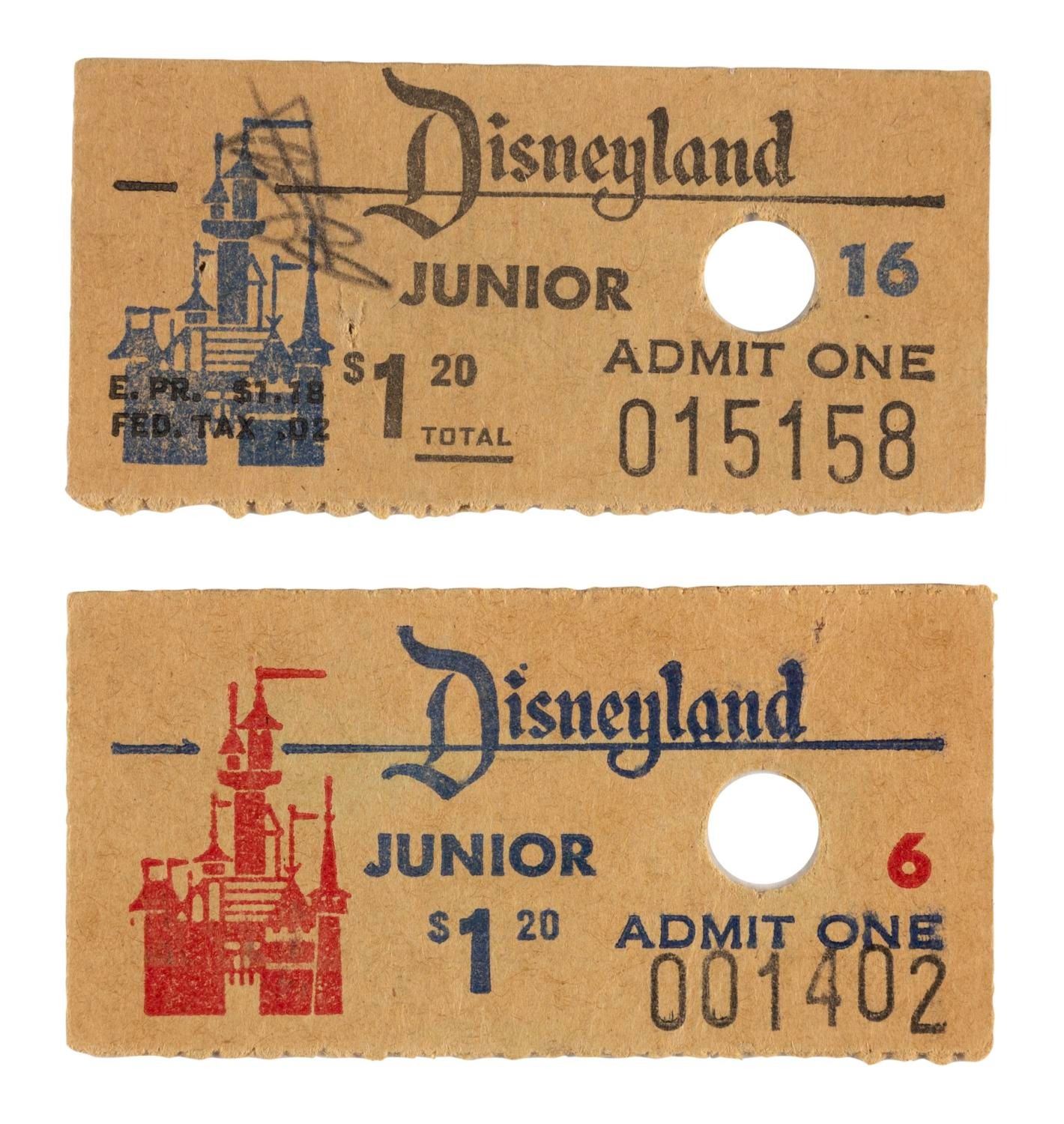 (Disneyland, 1950s-60s) A pair of early “Junior” admission tickets, allowing a Guest 12 to 17 years old into Disneyland Park. Each measuring 1” x 2”, the stubs are in very good condition, with two spots of paper loss 0.25” and 0.5” to the back bottom edge of the ticket with the blue castle.