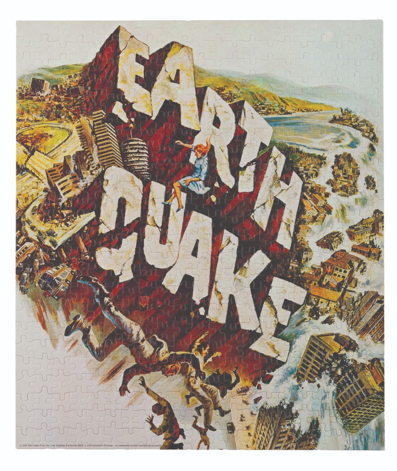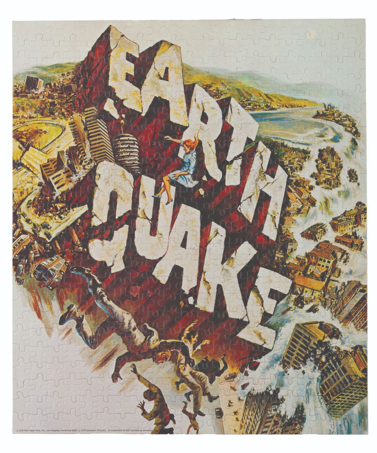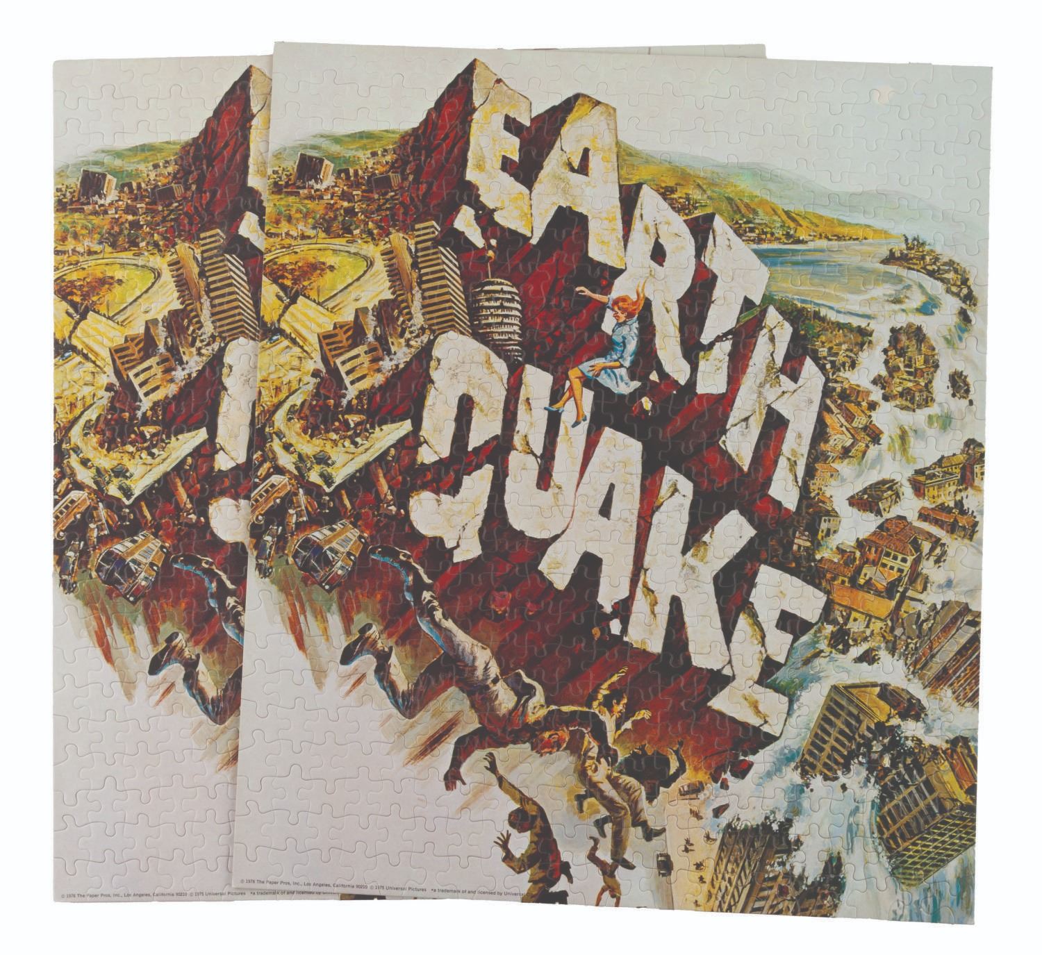 (The Paper Pros, 1975) Two samples of a puzzle of the "Earthquake" movie poster art. Each is stamped partially to show the pieces, but not enough to break apart. Each measuring 15.5" x 18", the puzzle samples display in fine condition.