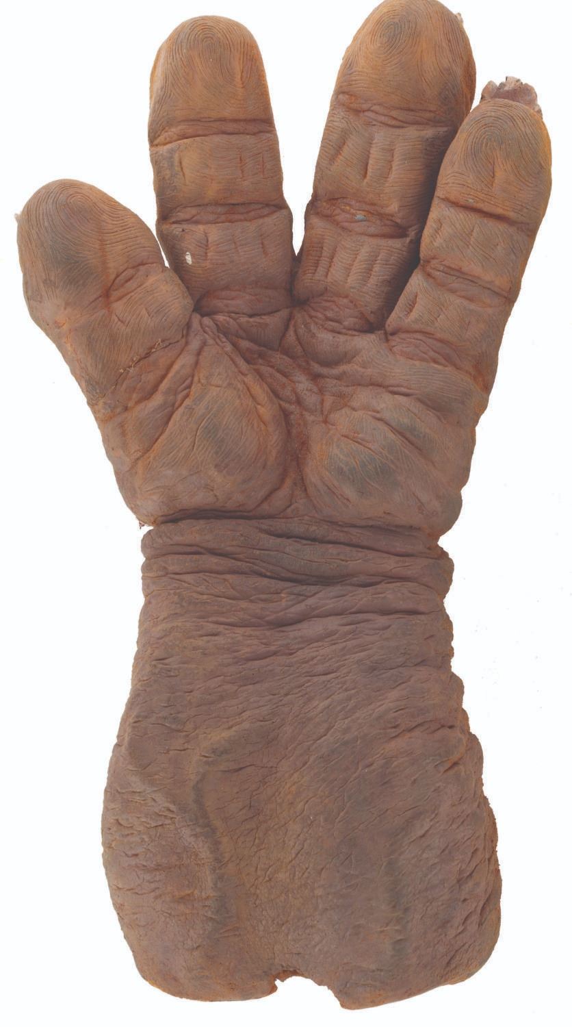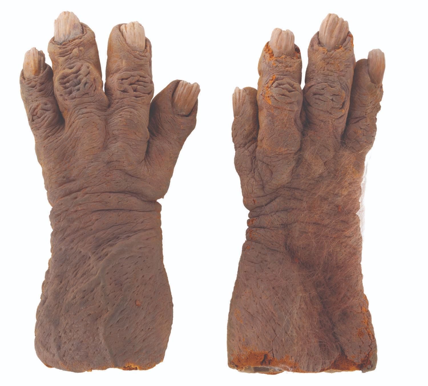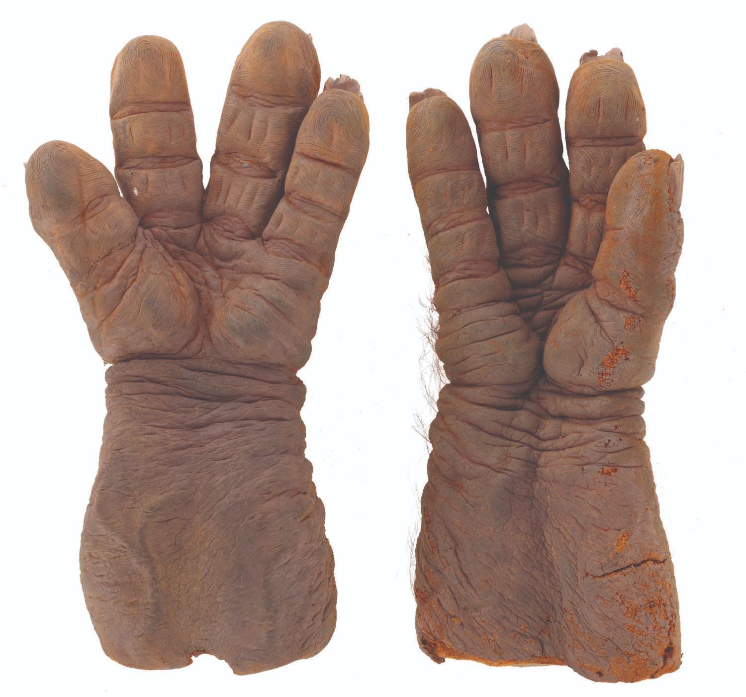 (Touchstone, 1991) A pair of screen-used Trantor hands from the comedy horror film"Ernest Scared Stupid." Trantor, the evil troll, used these hand-painted foam hands to turn children into dolls and torment Ernest. Measuring 4" x 7" x 13", the hands are in fair to good condition with foam loss, cracking, deterioration, paint loss, soiling, and discoloration.
