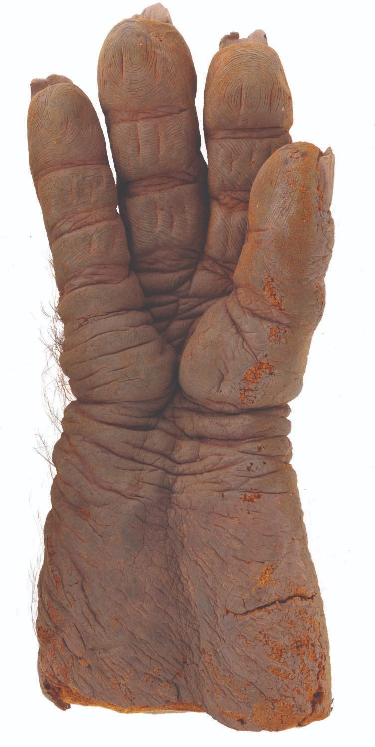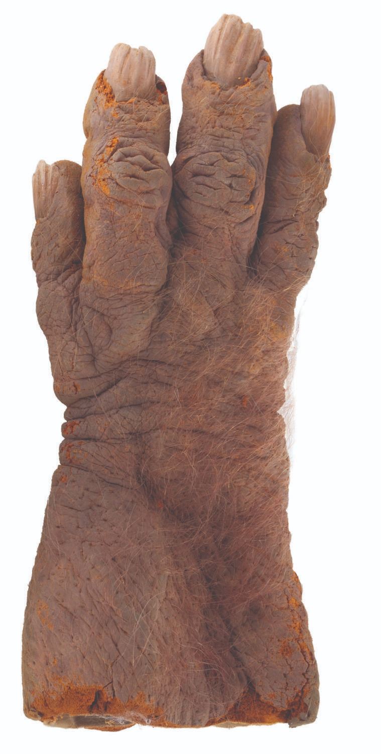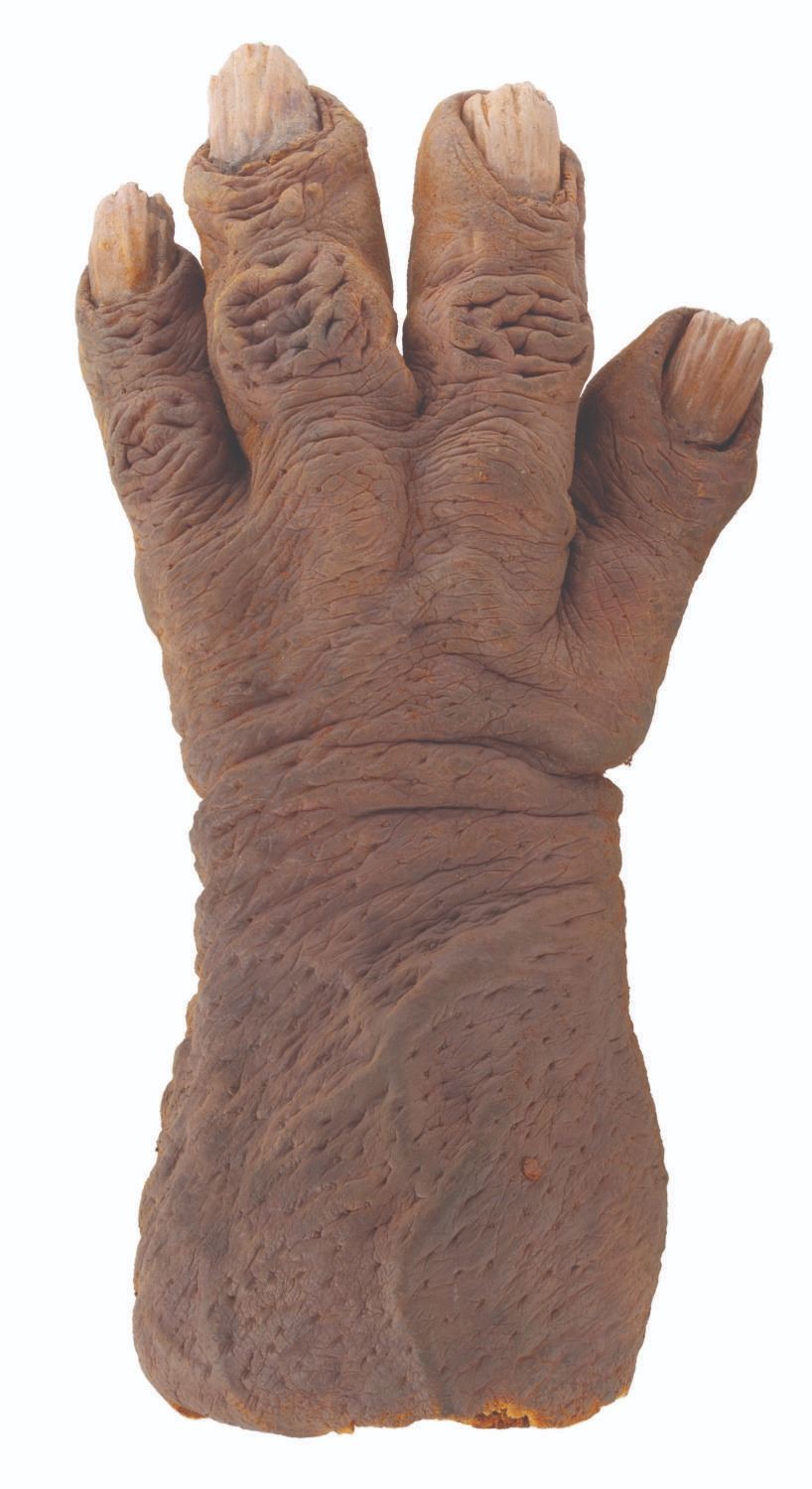 (Touchstone, 1991) A pair of screen-used Trantor hands from the comedy horror film"Ernest Scared Stupid." Trantor, the evil troll, used these hand-painted foam hands to turn children into dolls and torment Ernest. Measuring 4" x 7" x 13", the hands are in fair to good condition with foam loss, cracking, deterioration, paint loss, soiling, and discoloration.