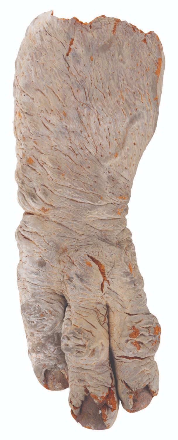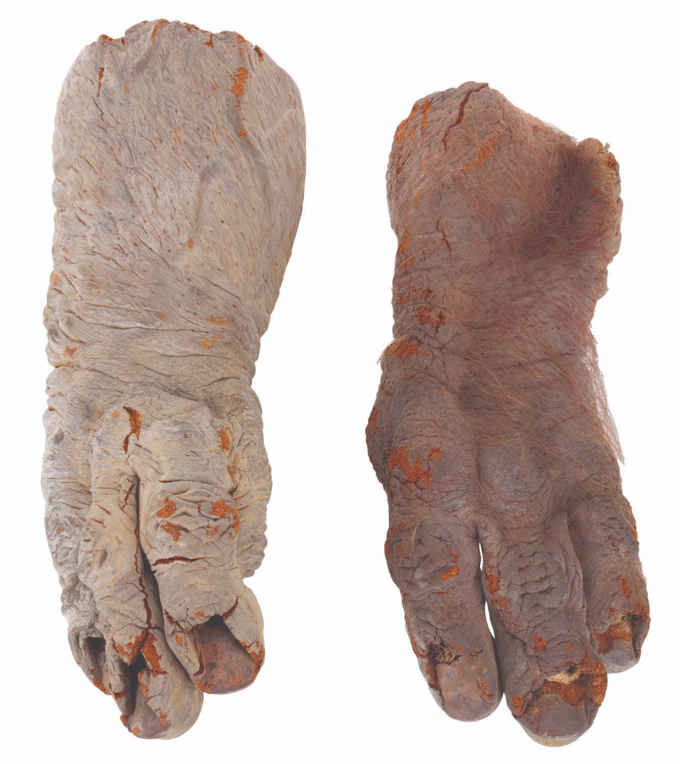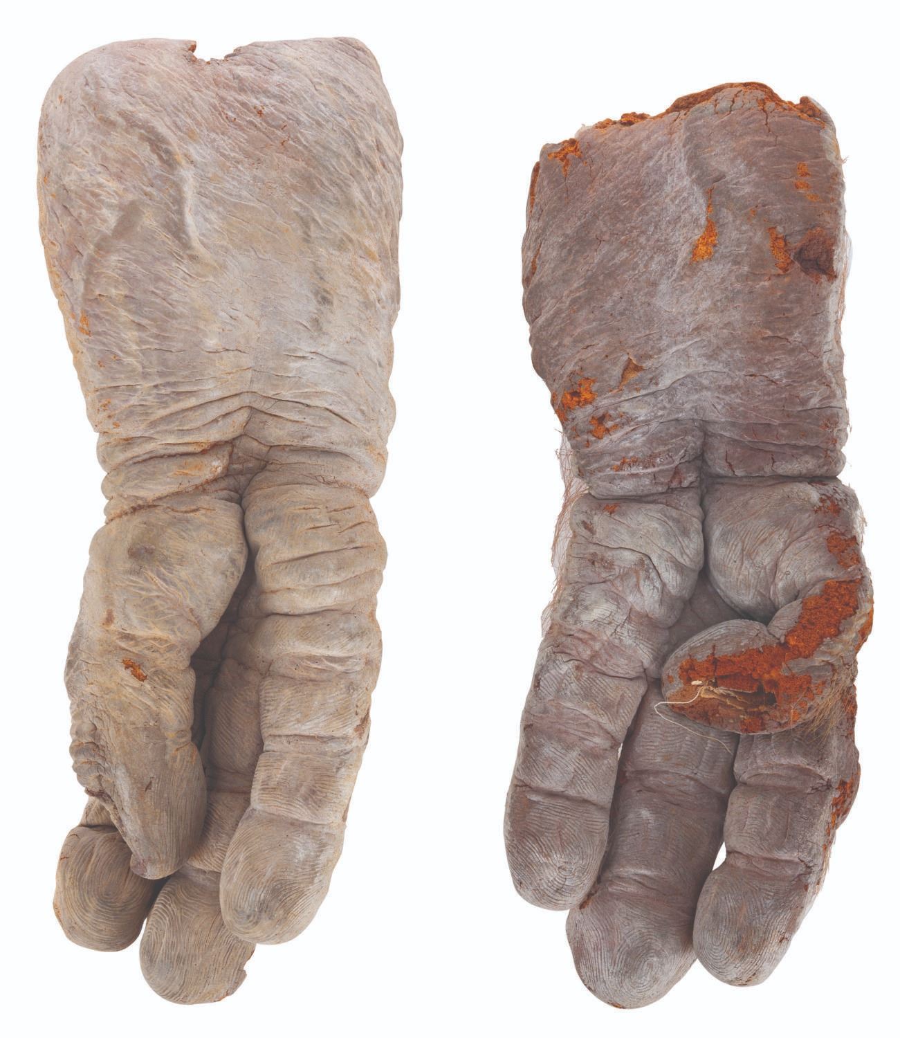 (Touchstone, 1991) A pair of troll costume hands made by creature effects experts, the Chiodo Brothers, for Jim Varney's Halloween comedy "Ernest Scared Stupid." Measuring 12.5" long, the hand-painted foam hands are in fair condition with heavy flaking, material loss, cracks throughout, paint loss, and wear from production use.