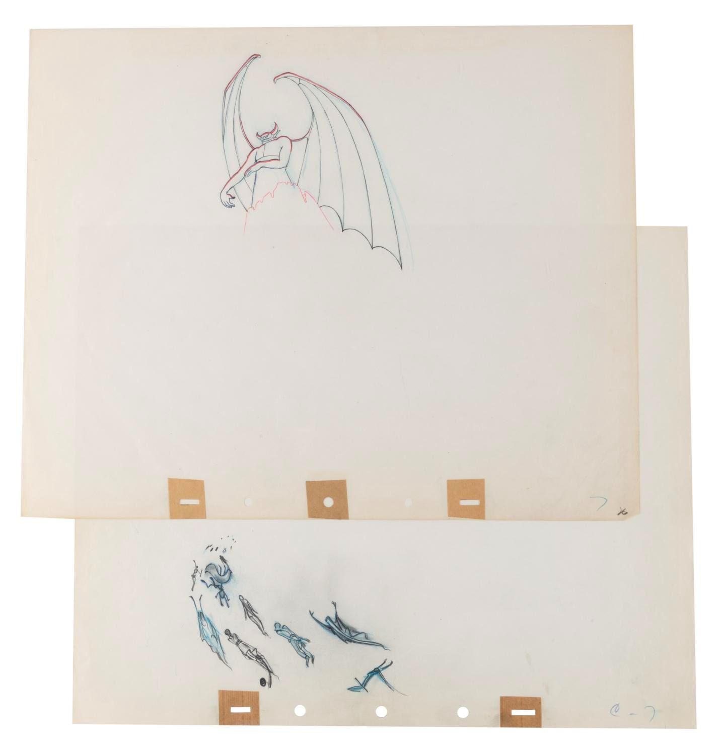 (Disney, 1940) A pair of original production drawings of the Chernabog and ghosts from the "Night on Bald Mountain" sequence of "Fantasia." With character images of 5.5” x 4.75” and 5.5” x 4” on 12.5” x 15.5” animation paper, the graphite and color pencil drawings are in very good condition with light edge wear and creasing from production use and light discoloration from age.