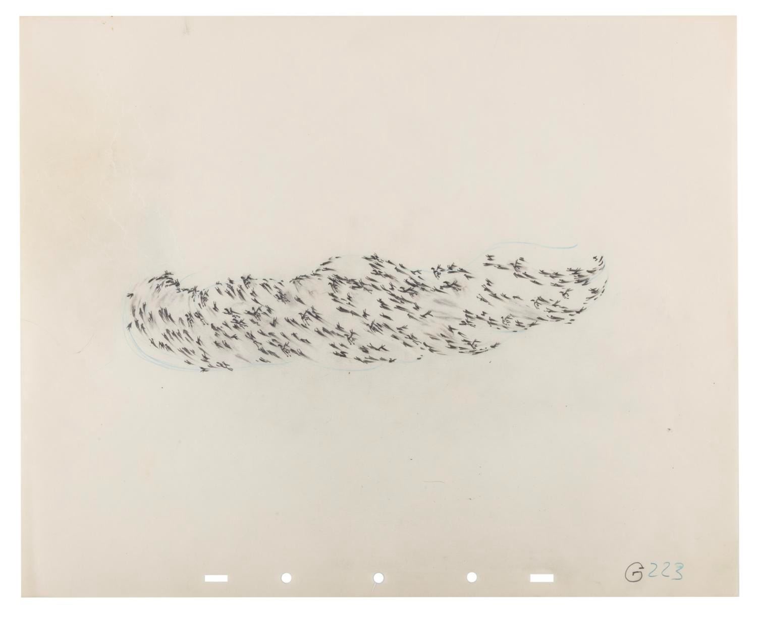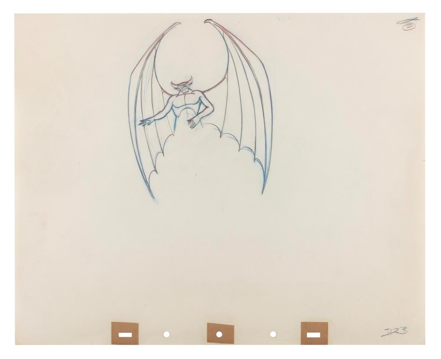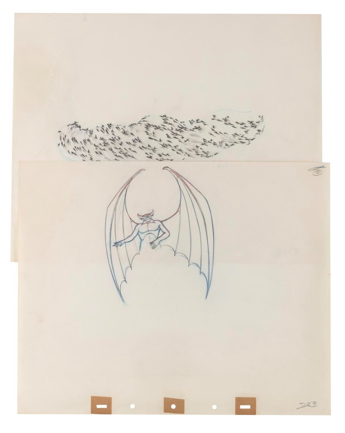 (Disney, 1940) A pair of frame-matching original production drawings of Chernabog and demons from the Night on Bald Mountain sequence of"Fantasia." The drawings are accomplished in graphite and blue pencil with image sizes of 5.5" x 7" and 2.5" x 10.5" on 12.5" x 15.5" animation paper. The drawings are in very good production-used condition with light edge wear and creasing, and light discoloration from age.
