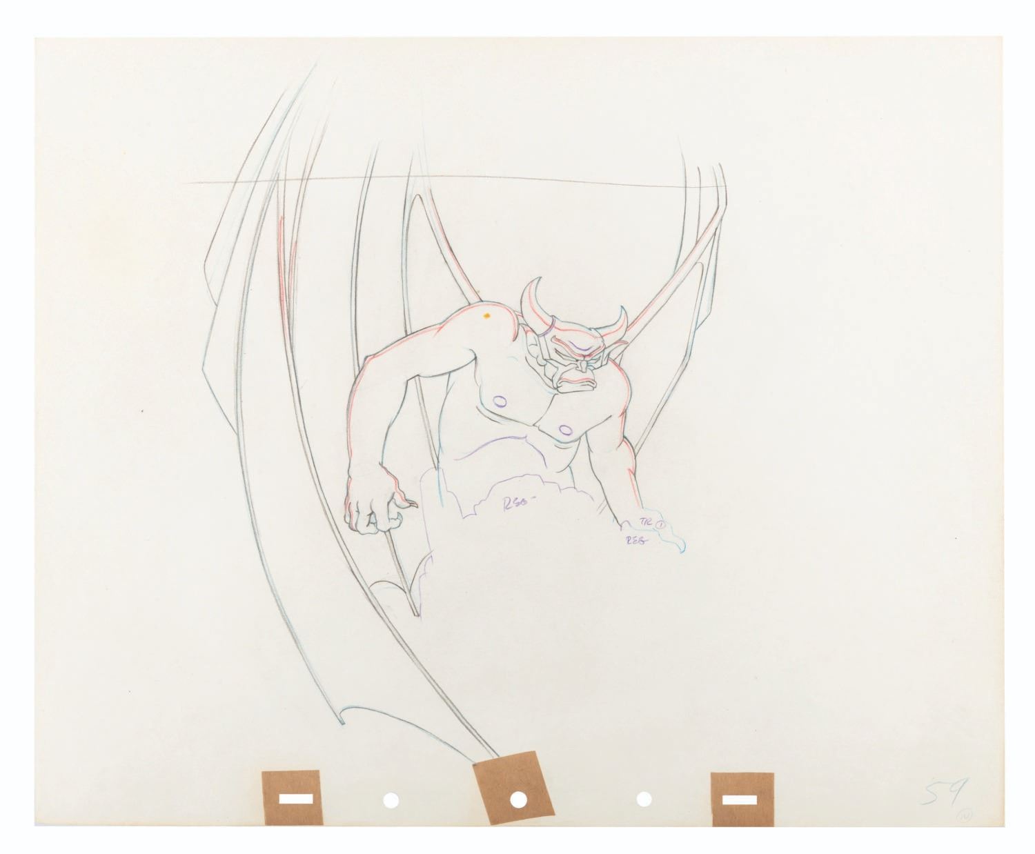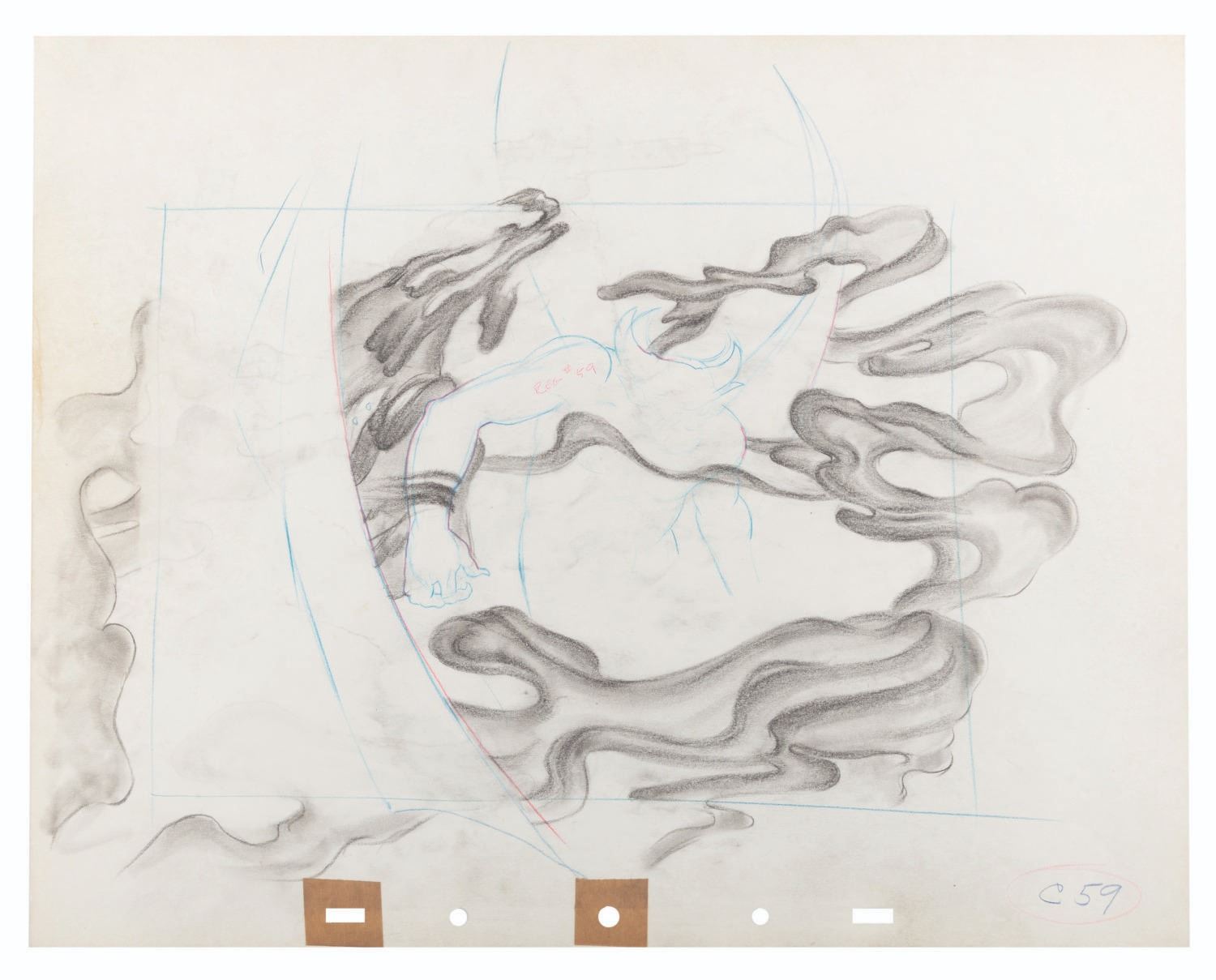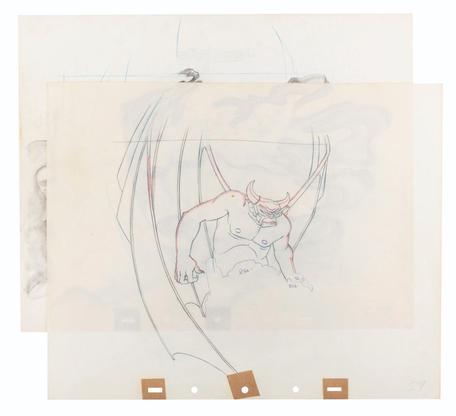 (Disney, 1940) A pair of original production drawings of Chernabog and smoke effects from the Night on Bald Mountain sequence of “Fantasia.” Chernabog has an image size of 8.5” x 11.25” and the effects measure 11.5” x 14.5”, both on 12.25” x 15.5” animation paper. The graphite and colored pencil drawings are in good condition with light wear, edge discoloration, creases, a stain on Chernabog’s right shoulder, and smudges from production use.