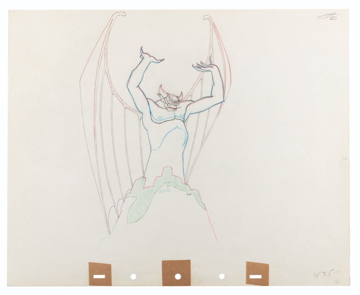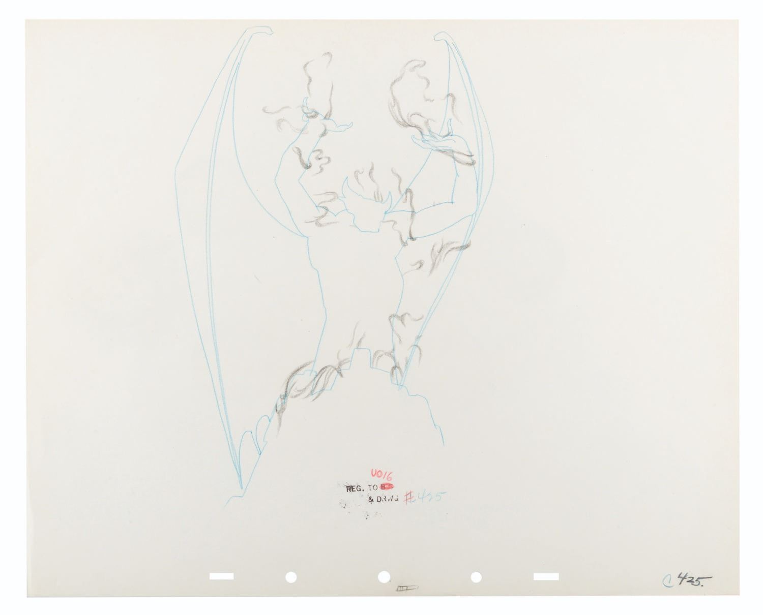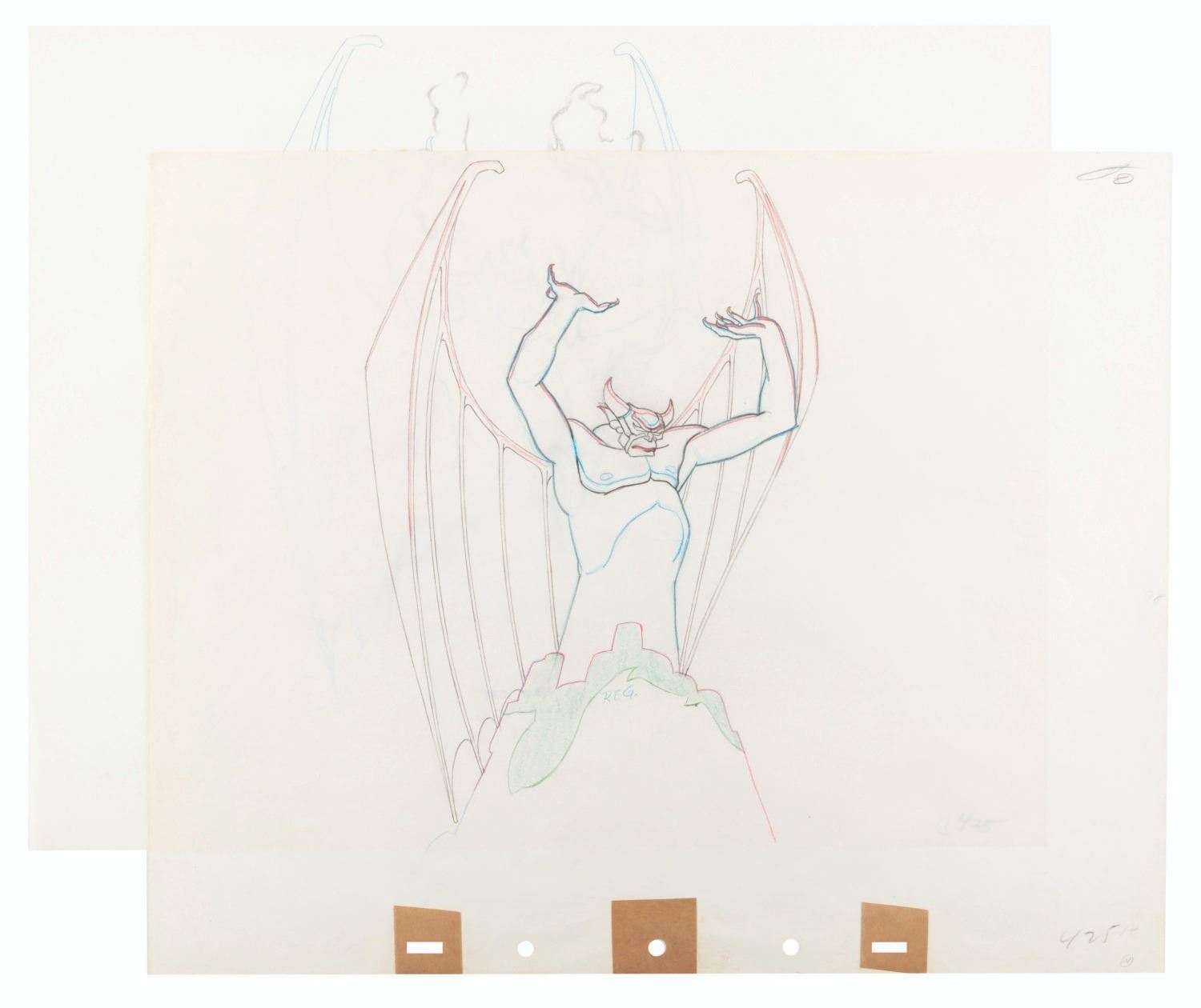 (Disney, 1940) A pair of original production drawings of Chernabog and smoke effects from the Night on Bald Mountain sequence of “Fantasia.” Chernabog and the smoke effects both have an image size of 10.5” x 6.75” on 12.25” x 15.5” animation paper. The graphite and colored pencil drawings are in very good production-used condition with light wear and discoloration to the edges and light creasing.