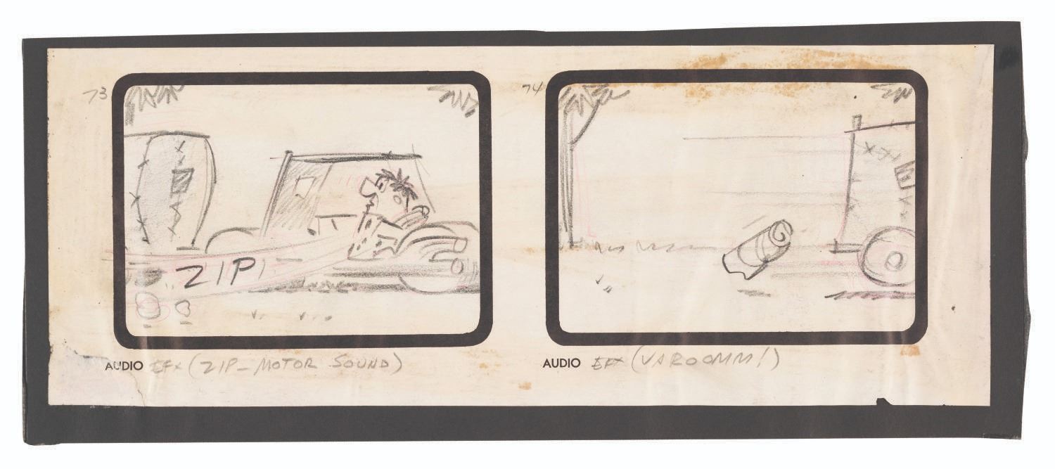 (Hanna-Barbera, 1959) A pair of rare original storyboard panels of Fred in the Flintmobile from “The Flintstones” episode, "The Snorkasaurus Hunter." These panels were part of two large storyboards used to pitch the show to networks in 1959. Accomplished in graphite, each panel measures 3.5" x 4.75" on 4.5” x 11.75” animation paper that has been mounted to 5.5" x 12.5" cardstock. The panels are in good condition with smudges, glue residue, light creasing, and rips from production use. In 1960, Hanna-Barbera moved beyond Saturday mornings to make television history with the debut of “The Flintstones,” the first animated prime-time sitcom. Despite being inspired largely by the hit adult sitcom "The Honeymooners," the series initial reviews from critics were not favorable, with New York Times critic Jack Gould calling it “an inked disaster.” Regardless of the critics, the show was an instant hit with the audience. The Flintstones would make television history again by having the distinction of being the first animated program to ever be nominated for Outstanding Comedy Series at the Primetime Emmys. With an impressive run of six seasons and 166 episodes, the show remained a staple of the television landscape throughout the 1960s and remains a pop cultural icon to this day. We are pleased to present a selection of storyboard panels from where it all began. The following panels are from “The Snorkasaurus Hunter”, one of two potential episodes which were presented in Joe Barnerra’s pitch to ABC. The episode would eventually be produced and aired as the series 18th episode and is notable for revealing how The Flintstones would meet their beloved pet, Dino.
