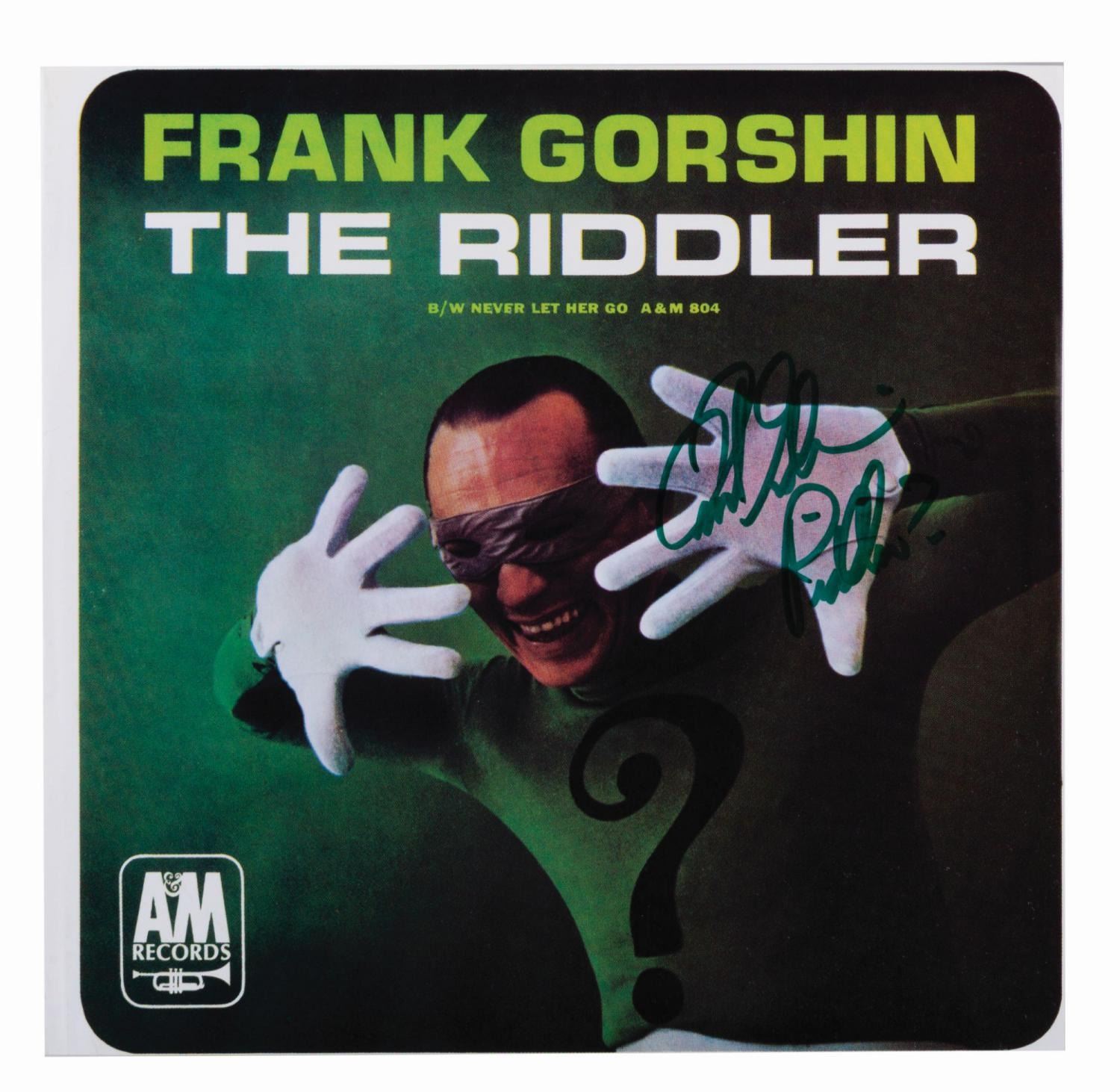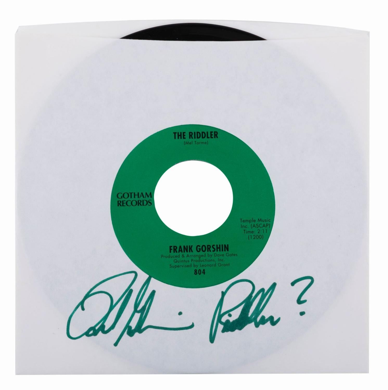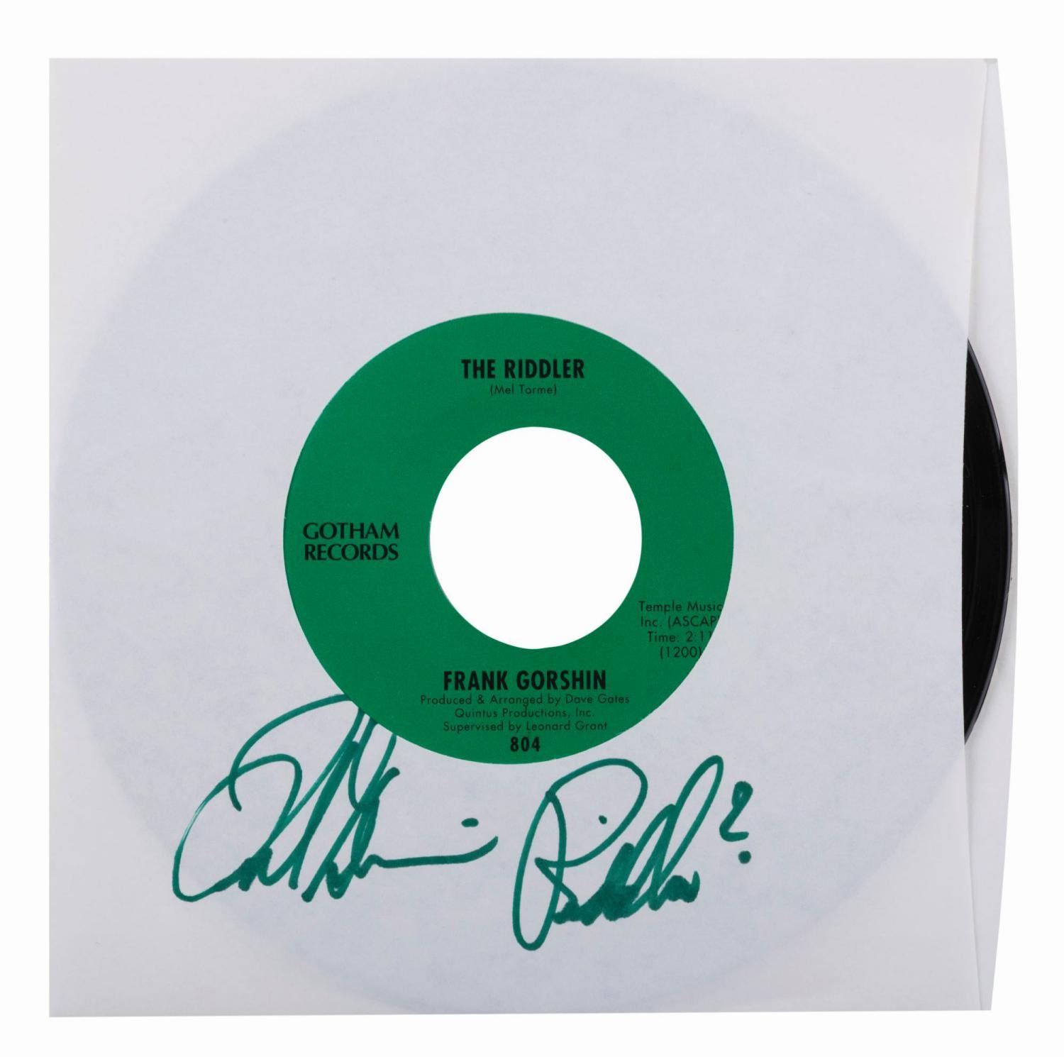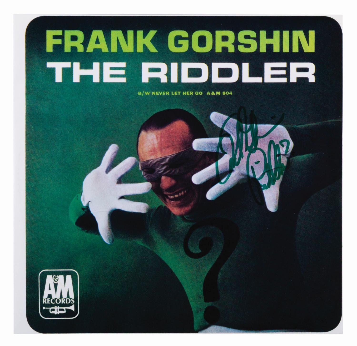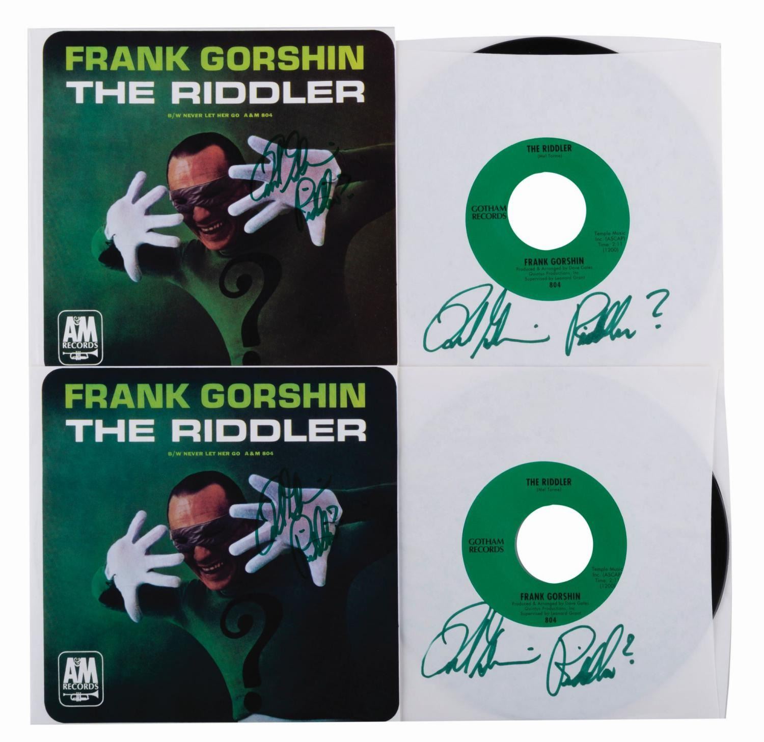 (A&M Records, 1966) A pair of signed promotional vinyl singles with the song "The Riddler" on one side and "Never Let Me Go" on the other. The sleeves and reproduction covers are signed by actor Frank Gorshin, who memorably portrayed the villain on the "Batman" television series and provided vocals for the songs. Measuring 7" x 7", the records are in very good condition with light creases, scratches, and wear.