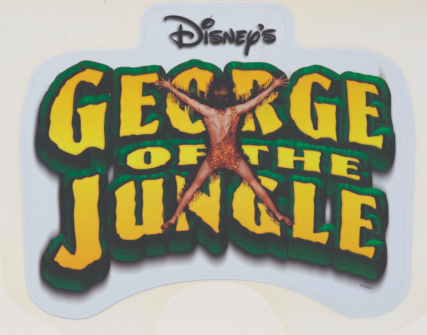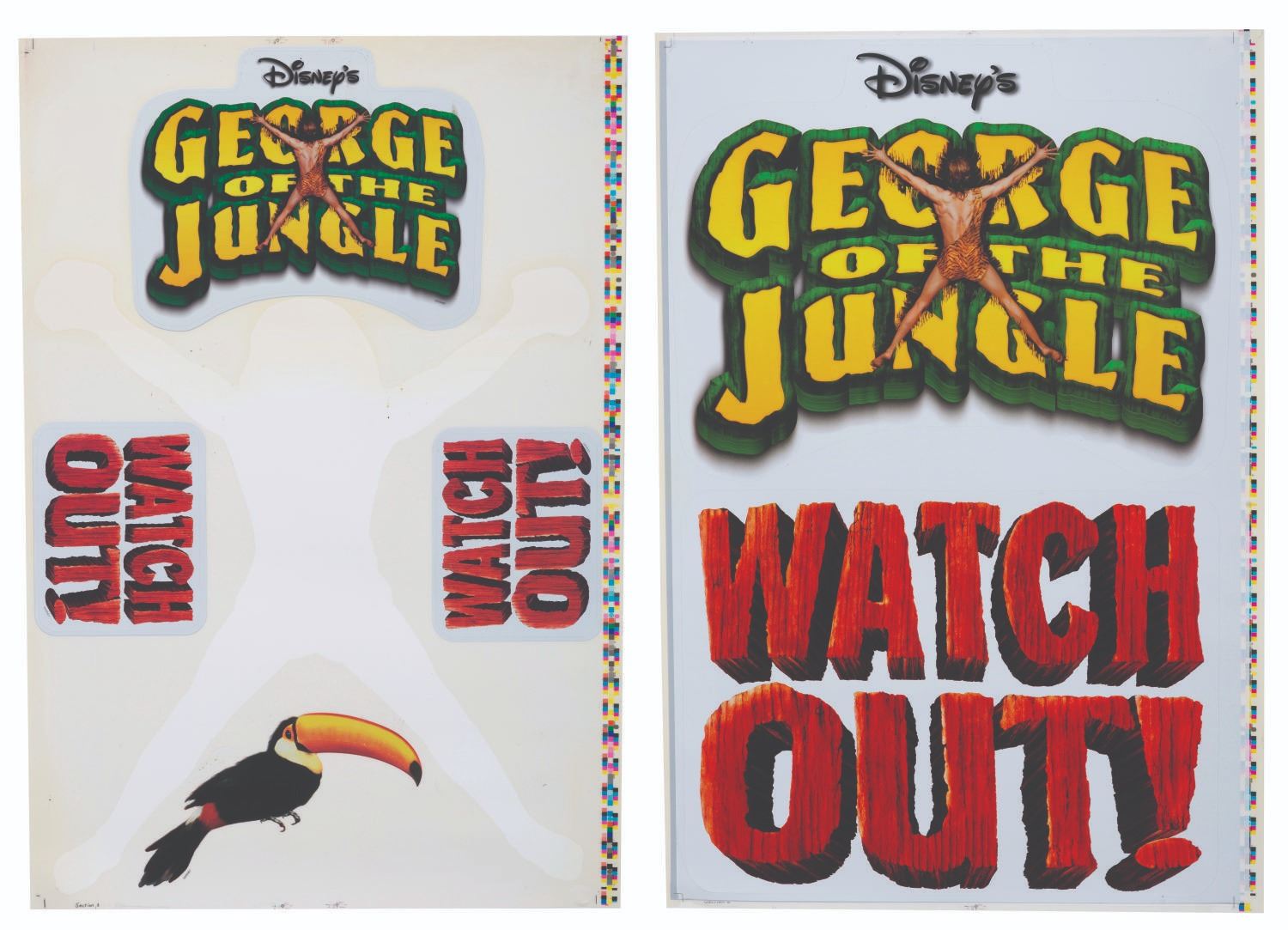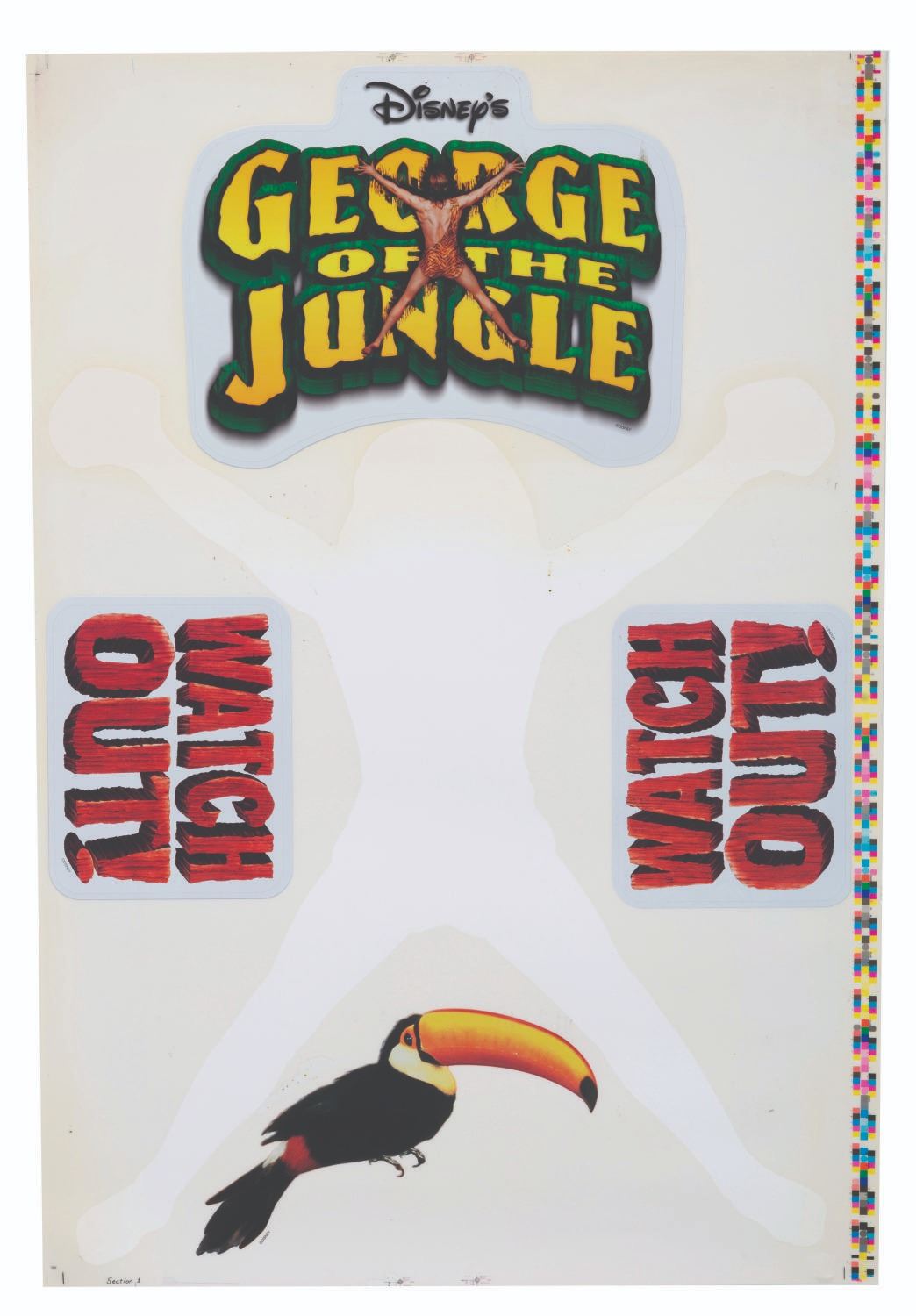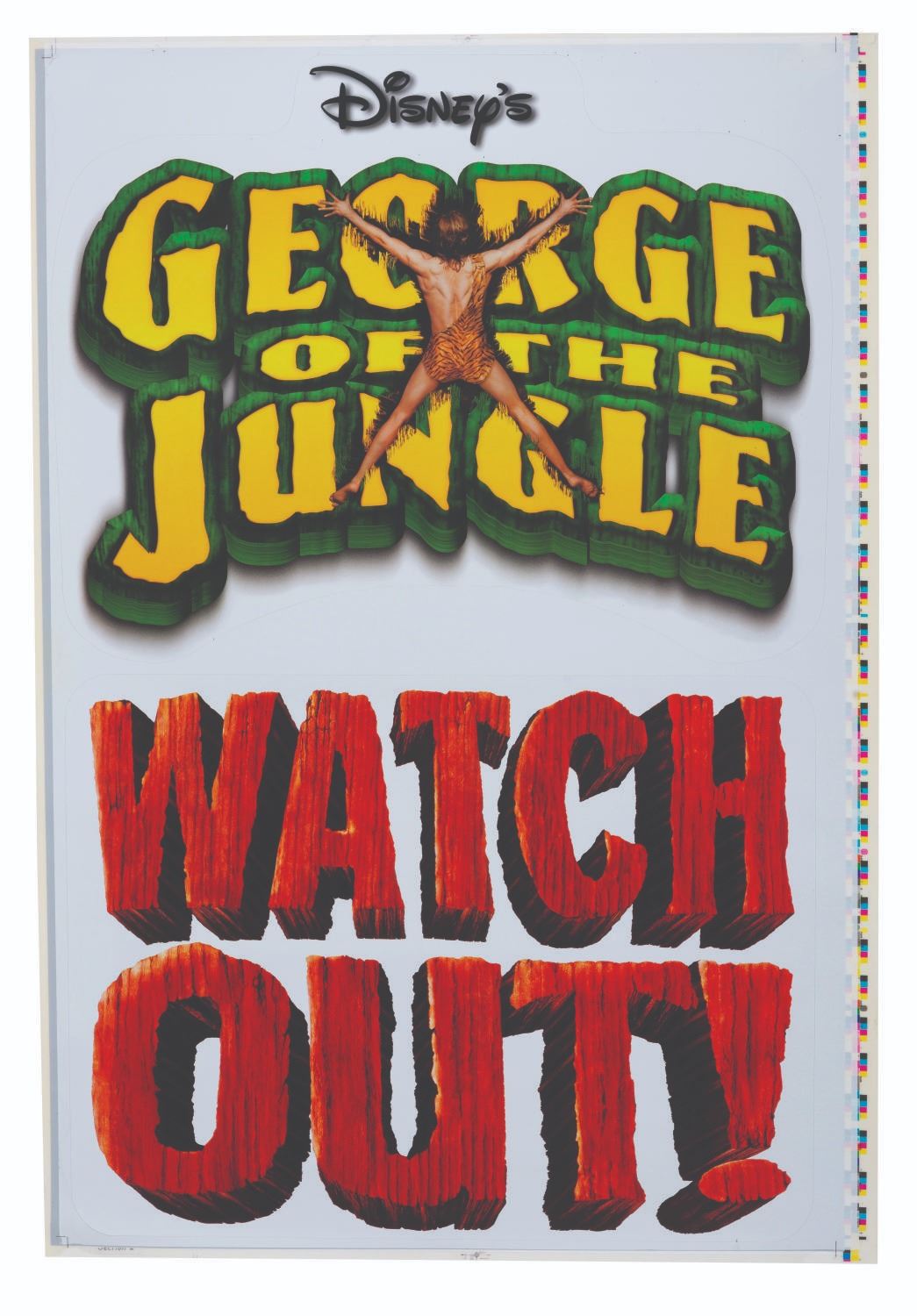 (Disney, 1997) Two pages of six large removable vinyl decals for the live-action film “George of the Jungle.” Included are a large and small decal of "George of the Jungle" and "Watch Out!", and a Tookie Tookie decal. Ranging in size from 7.5” x 9.5” to 18.25” x 24.25”, the decals display in very good condition with a large George decal missing and light wear and stains.