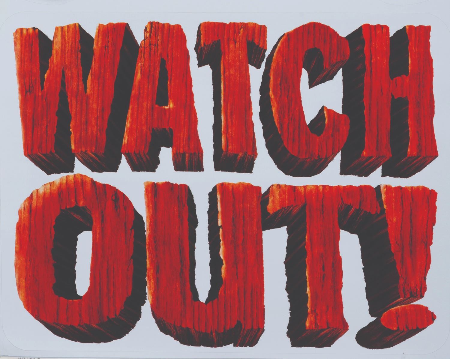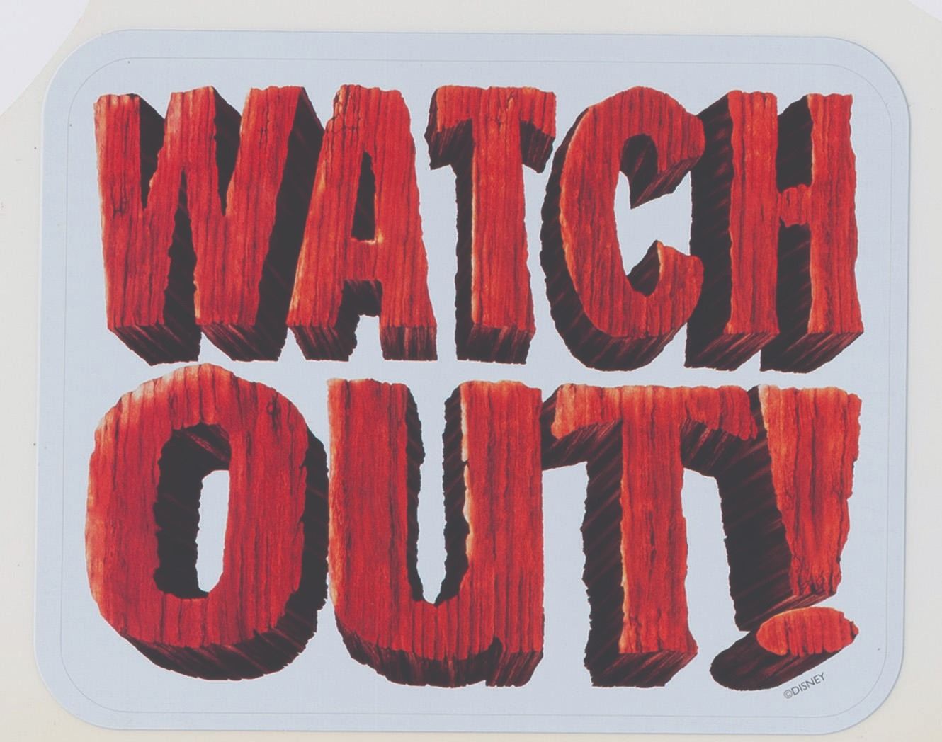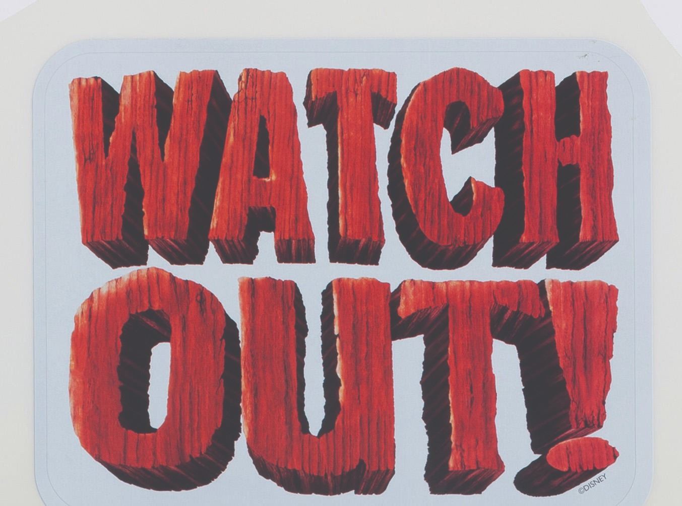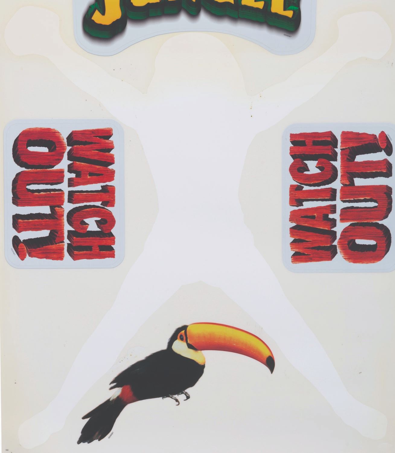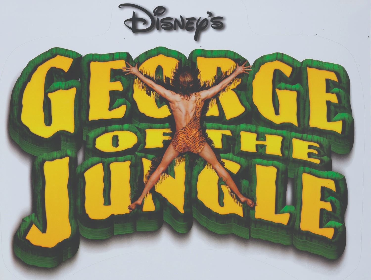 (Disney, 1997) Two pages of six large removable vinyl decals for the live-action film “George of the Jungle.” Included are a large and small decal of "George of the Jungle" and "Watch Out!", and a Tookie Tookie decal. Ranging in size from 7.5” x 9.5” to 18.25” x 24.25”, the decals display in very good condition with a large George decal missing and light wear and stains.
