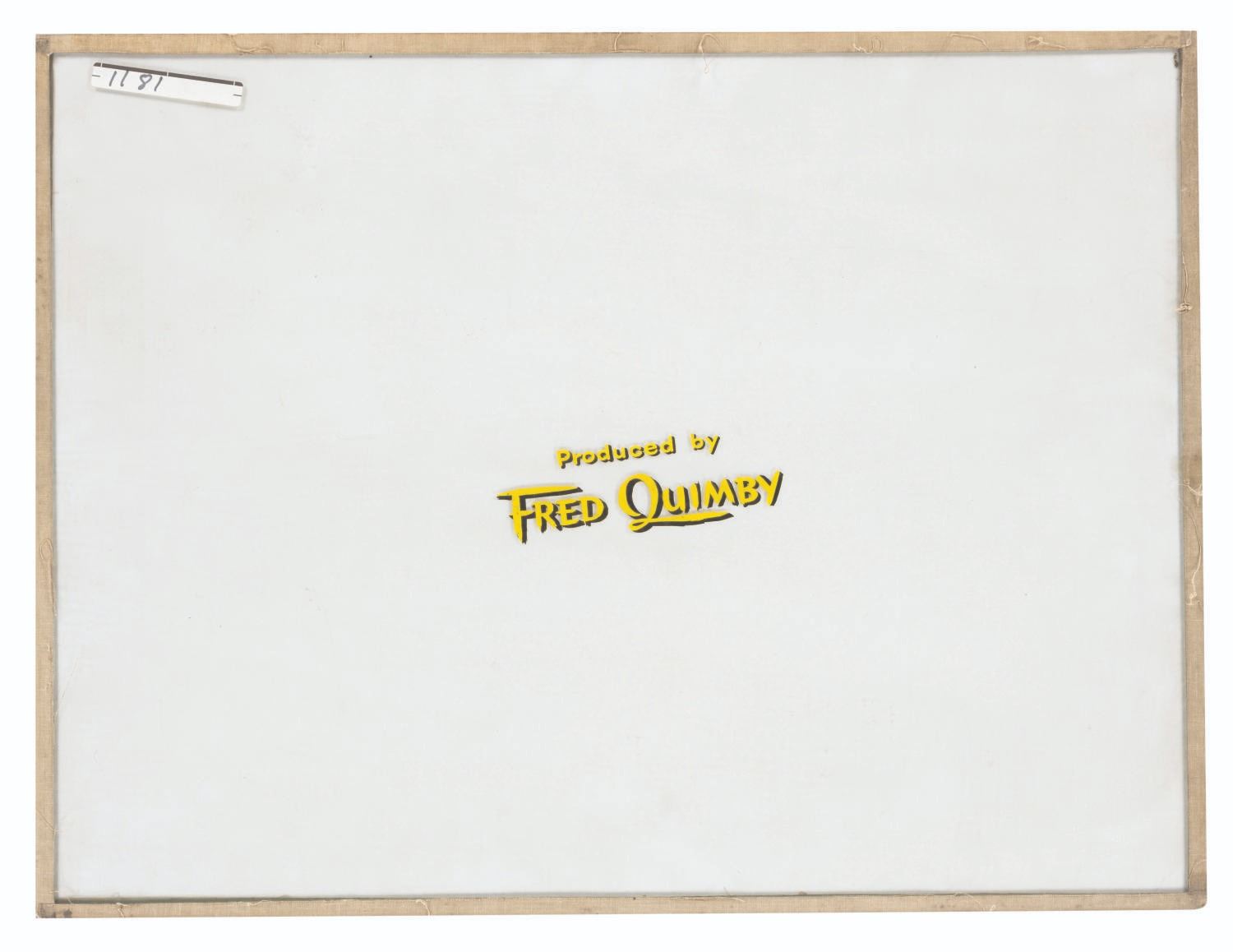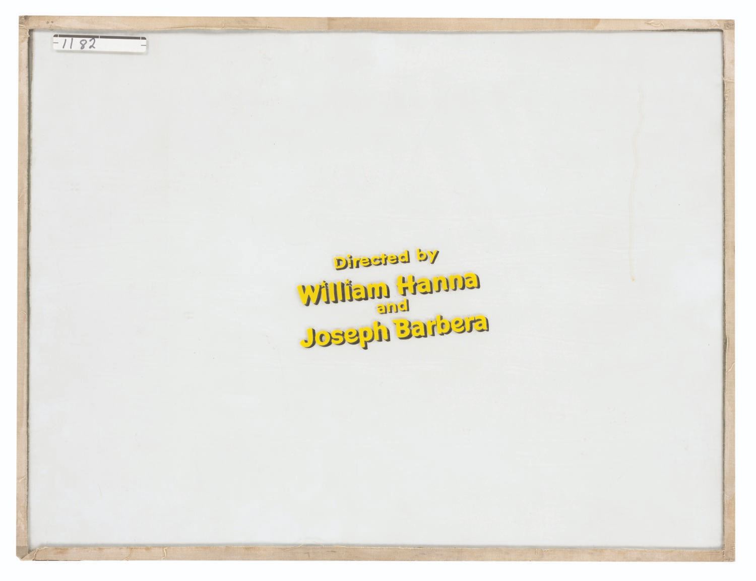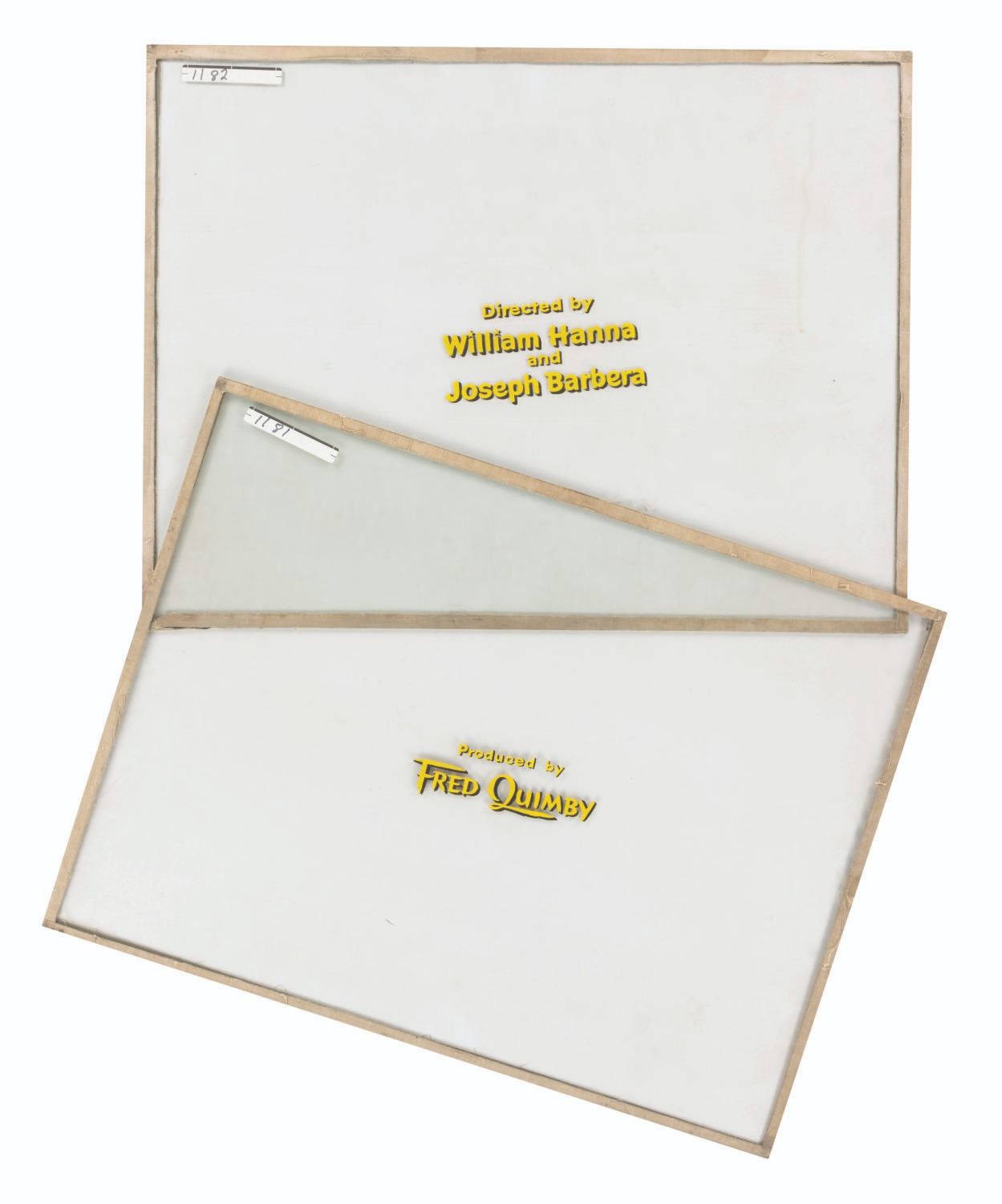 (Pacific Titles, 1940s-50s) An original pair of Directors William Hanna, Joseph Barbera, and Producer Fred Quimby’s credits on hand-painted glass plates from the opening title of a live action production. Measuring 20” x 26.5”, the plates display in very good condition with light cracking to the letters on “Directed” and “Quimby.”