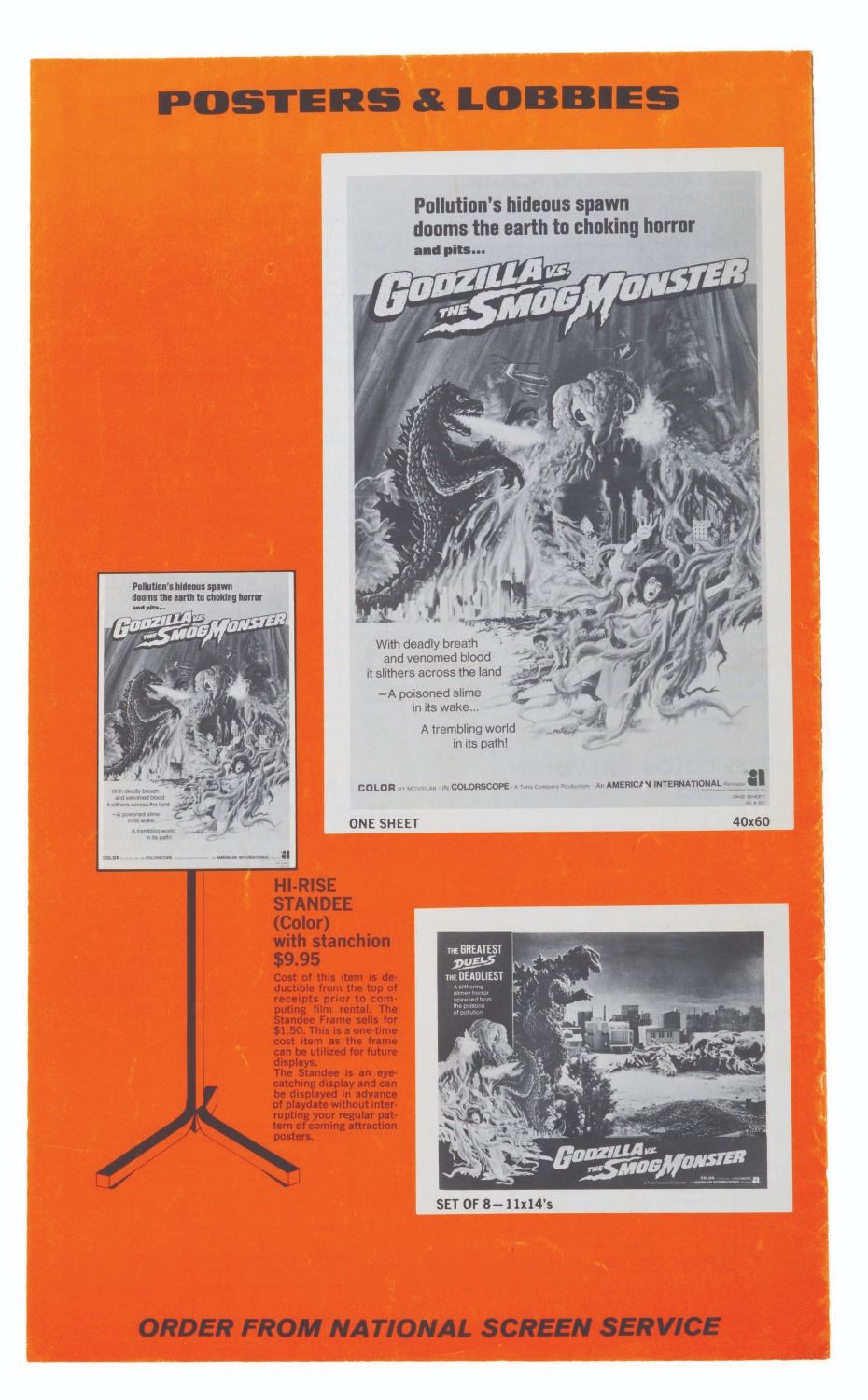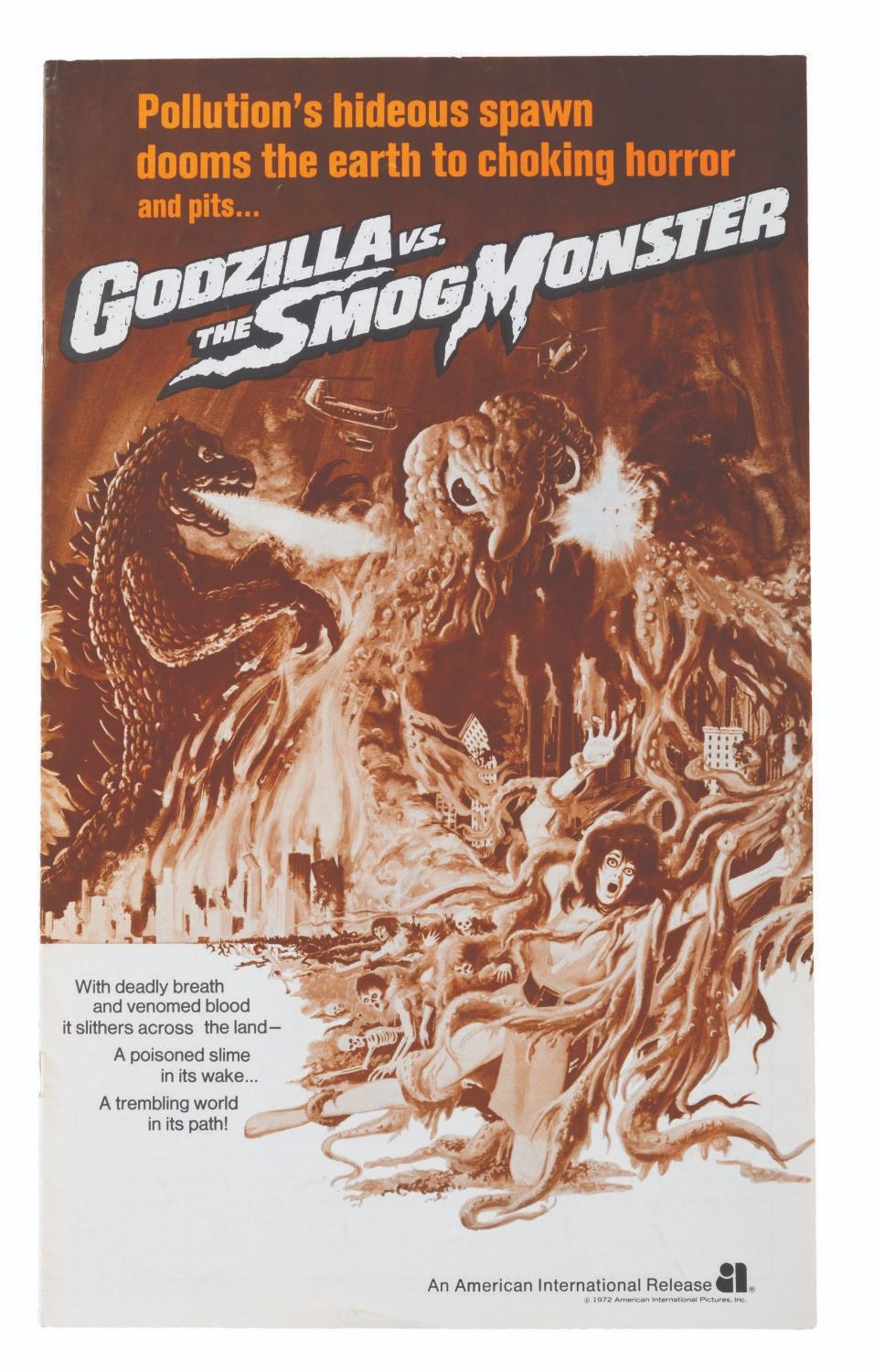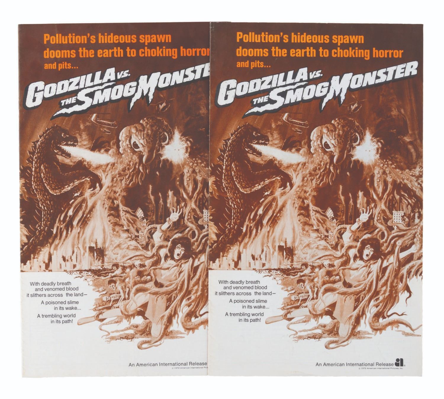 (American International, 1972) A pair of pressbooks for "Godzilla vs. the Smog Monster," the U.S. release title for "Godzilla vs. Hedorah." The books include layouts of all sizes for theaters to publish local ads. Measuring 8.5" x 14.25", the pressbooks are in good condition, with a single layout cut out of one and an ink mark in the other.