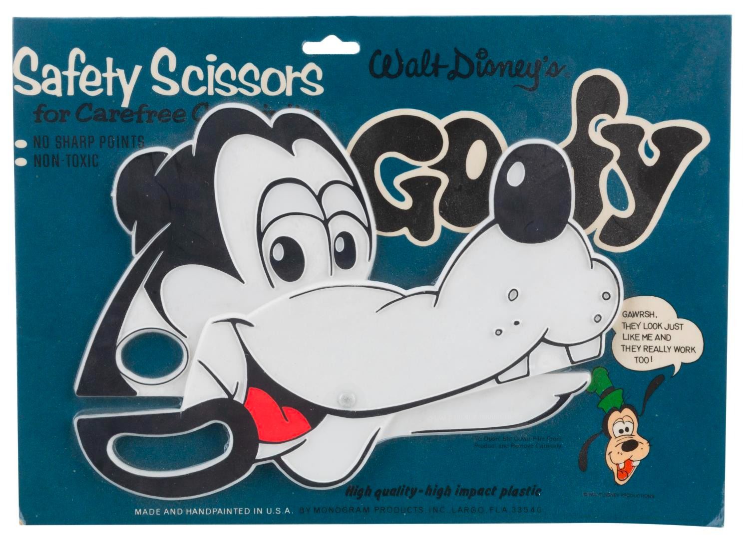(Disney, 1960s-70s) A pair of plastic safety scissors in the shape of Goofy’s head. Measuring 7.5” x 5.25”, the scissors are in fine condition, sealed on the original 7” x 9.75” card.