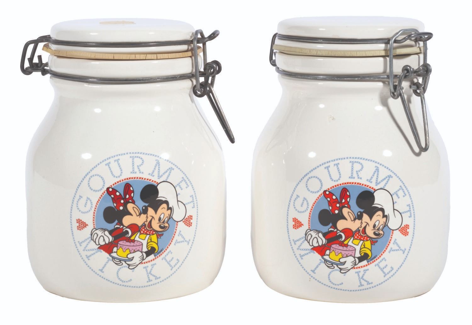 (Treasure Craft, 1990s) A pair of ceramic Gourmet Mickey preserve jars. Measuring 5" in diameter and 7" high, the jars are in very good condition, with one showing a small chip in the glaze above the image, and the rubber seals are brittle from age but easily replaceable.