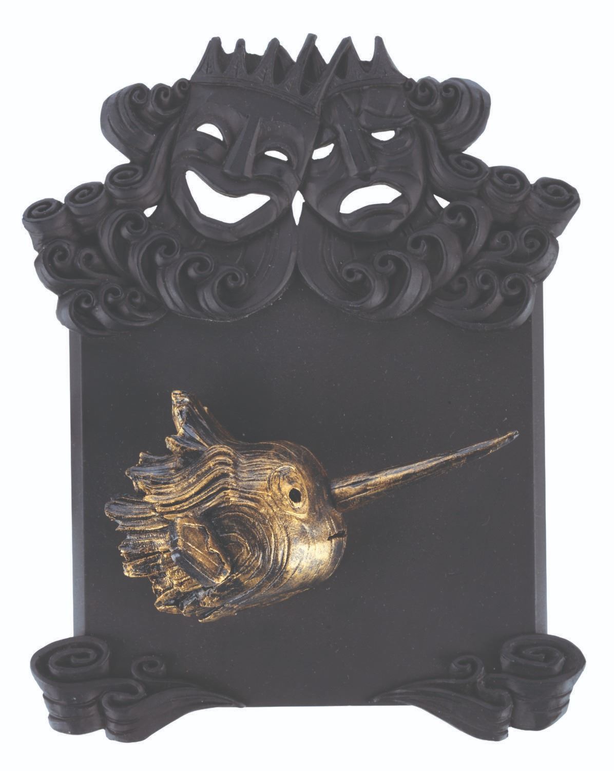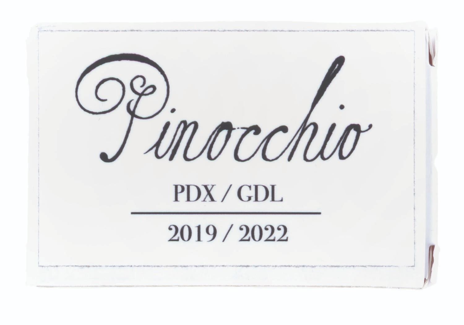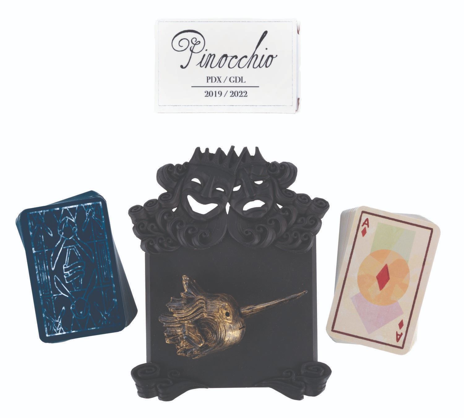 (Netflix, 2022) A pair of Guillermo Del Toro’s “Pinocchio” crew gifts, including a display plaque with the 3D likeness of Pinocchio and a deck of playing cards. The playing card’s label refers to PDX and GDL, Portland, Oregon, and Guadalajara, Mexico. Guadalajara is Guillermo’s hometown, and it also served, along with Portland, as a filming location for the film. Measuring 5” x 6.5”, the plaque is in very good condition, while the playing cards measuring 2.5” x 3.5” are in good condition.